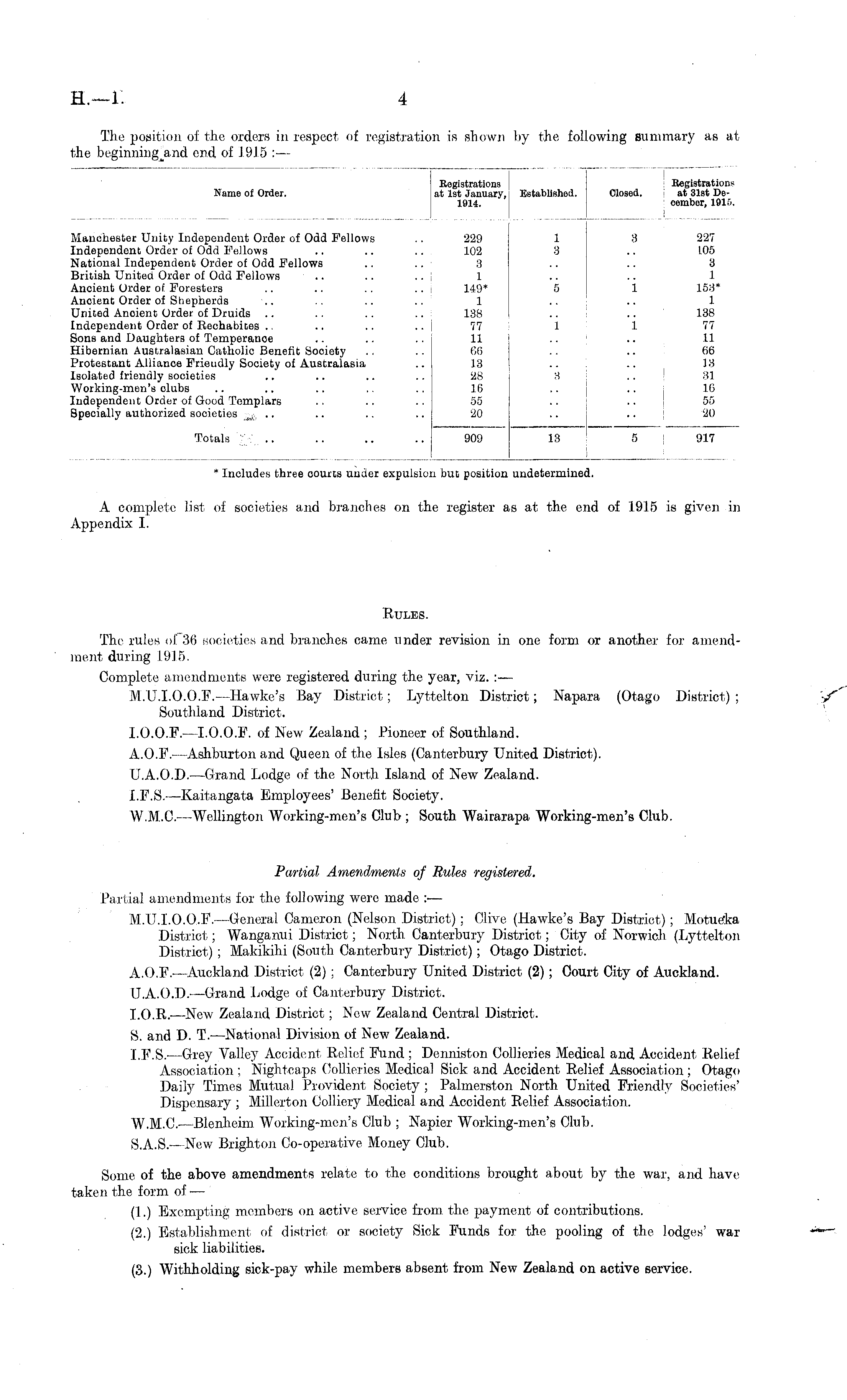 A complete list of societies and branches on the register as at the end of 1915 is given in Appendix I. Rules. The rules of 36 societies and branches came under revision in one form or another for amendment during 1915. Complete amendments were registered during the year, viz. :— M.U.1.0.0.F. —Hawke's Bay District; Lyttelton District; Napara (Otago District) ; Southland District. 1.0.0.F.—1.0.0.F. of New Zealand ; Pioneer of Southland. A.O.F.—Ashburton and Queen of the Isles (Canterbury United District). U.A.O.D.—Grand Lodge of the North Island of New Zealand. I.F.S.—Kaitangata Employees' Benefit Society. W.M.C.—Wellington Working-men's Club ; South Wairarapa Working-men's Club. Partial Amendments of Rules registered. Partial amendments for the following were made :— M.U.1.0.0.F. —General Cameron (Nelson District); Give (Hawke's Bay District); Motue'ka District; Wanganui District; North Canterbury District; City of Norwich (Lyttelton District); Makikihi (South Canterbury District); Otago District. A.O.F.—Auckland District (2) ; Canterbury United District (2); Court City of Auckland. U.A.O.D. —Grand Lodge of Canterbury District. 1.0. R- —New Zealand District; New Zealand Central District. S. and D. T.—National Division of New Zealand. I.F.S.- —Grey Valley Accident Relief Fund ; Denniston Collieries Medical and Accident Relief Association ; Nightcaps Collieries Medical Sick and Accident Relief Association ; Otago Daily Times Mutual Provident Society ; Palmorston North United Friendly Societies' Dispensary ; Millerton Colliery Medical and Accident Relief Association. W.M.C.—Blenheim Working-men's Club ; Napier Working-men's Club. S.A.S.- —New Brighton Co-operative Money Club. Some of the above amendments relate to the conditions brought about by the war, and have taken the form of -— (1.) Exempting members on active service from, the payment of contributions. (2.) Establishment of district or society Sick Funds for the pooling of the lodges' war sick liabilities. (3.) Withholding sick-pay while members absent from New Zealand on active service.