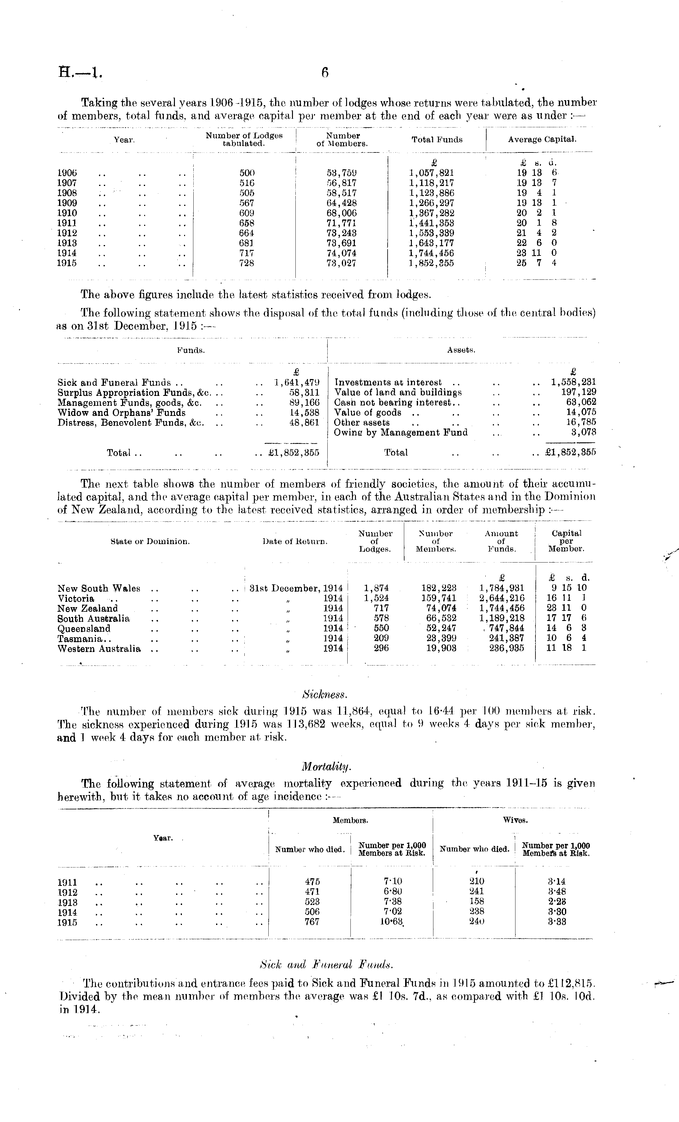 Taking the several years 1906 -1915, the number of lodges whose returns were tabulated, the number of members, total funds, and average capital per member at the end of each year were as under : —