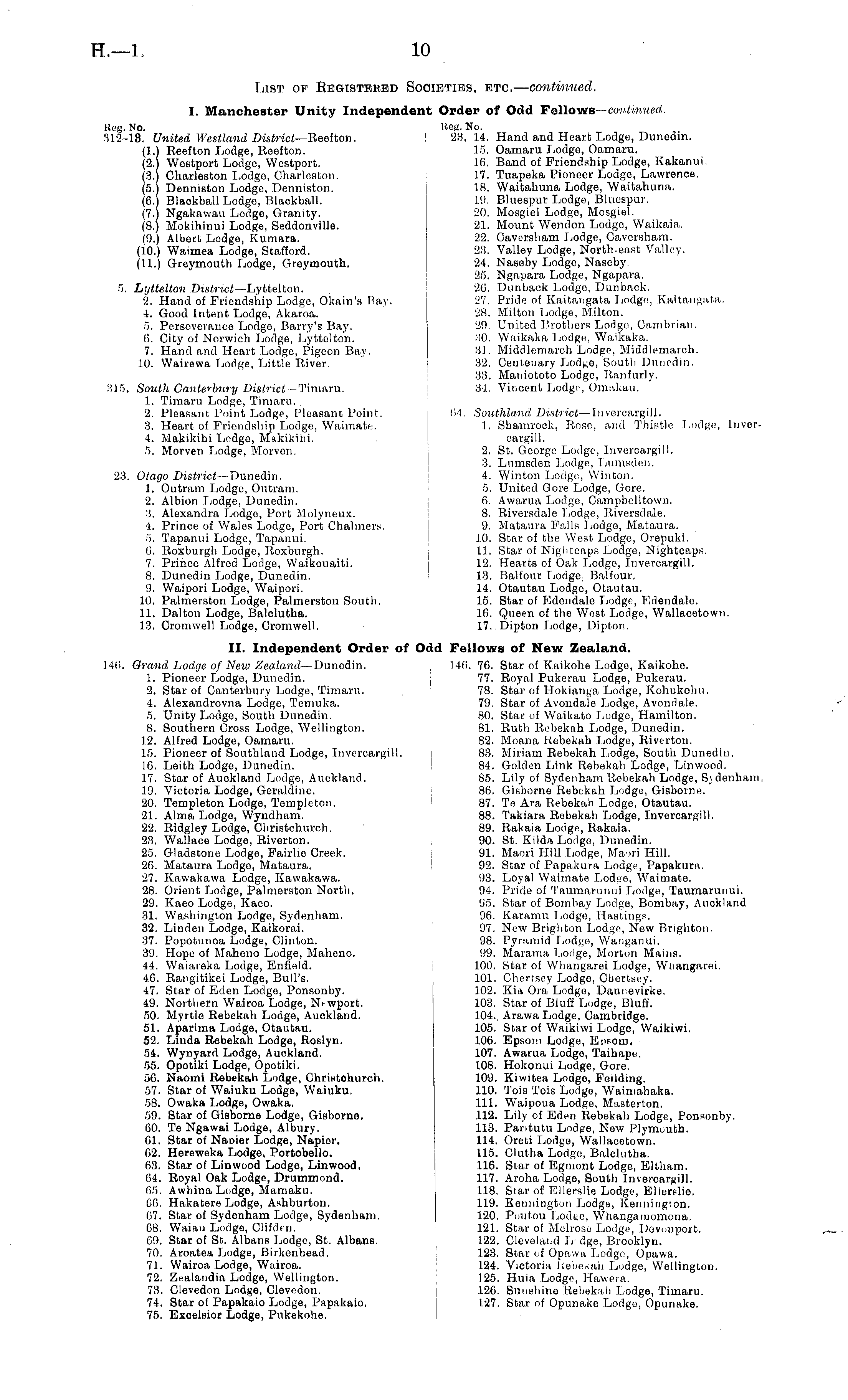 List of Registered Societies, etc. — continued. I. Manchester Unity Independent Order of Odd Fellows— continued. Reg. No. Reg. No. 312-18. United Westland District— Reef ton. 23. 14. Hand and Heart Lodge, Dunedin. (1.) Reefton Lodge, Reefton. 15. Oamaru Lodge, Oamaru. (2.) Westport Lodge, Westport. 16. Band of Friendship Lodge, Kakanui. (3.) Charleston Lodgo, Charleston. 17. Tuapeka Pioneer Lodge, Lawrence. (5.) Denniston Lodge, Denniston. 18. Waitahuna Lodge, Waitahuna. (6.) Blackball Lodgo, Blackball. 19. Bluespur Lodge, Bluespur. (7.) Ngakawau Lodge, Granity. 20. Mosgiel Lodge, Mosgiel. (8.) Mokihinui Lodge, Seddonville. 21. Mount Wendon Lodge, Waikaia. (9.) Albert Lodge, Kumara. 22. Caversham Lodge, Caversham. (10.) Waimea Lodge, Stafford. 23. Valley Lodge, North-east Valley. (11.) Greymouth Lodge, Greymouth. 24. Naseby Lodge, Naseby. 25. Ngapara Lodge, Ngapara. 5. Lyttelton Dts/rtcil—Lyttelton. 26. Dunback Lodge, Dunback. 2. Hand of Friendship Lodge, Okain's Bay. 27. Pride of Kaitangata Lodge, Kaitangata. 4. Good Intent Lodge, Akaroa. 28. Milton Lodge, Milton. 5. Porsoverance Lodge, Barry's Bay. 29. United Brothers Lodge, Cambrian. 6. City of Norwich Lodge, Lyttelton. 310. Waikaka Lodge, Waikaka. 7. Hand and Heart Lodge, Pigeon Bay. 31. Middlemareh Lodgo, Middlemarch. 10. Wairewa Lodge, Little River. 32. Centenary South Dunedin. 33. Maniototo Lodge, Ranfurly. 315. South Canterbury District -Timaru. 34. Vincent Lodgo, Omnkau. 1. Timaru Lodge, Timaru.. 2. Pleasant, Point Lodge, Pleasant Point. 64. Southland District —lnvercargill. 3. Heart of Friendship Lodgo, Waimate. 1. Shamrock, Rose, and Thistle Lodge, lnver4. Makikihi Lodge, Makikibi. cargill. 5. Morven Lodge, Morvon. 2. St. George Lodge, Invercargill. 3. Lumsden Lodge, Lumsden. 23. Otago District— Dunedin. 4. Winton Lodge, Winton. 1. Outram Lodgo, Outram. 5. United Gore Lodge, Gore. 2. Albion Lodge, Dunedin. 6. Awarua Lodge, Campbelltown. 3. Alexandra Lodge, Port Molyneux. 8. Riversdale Lodge, Riversdale. 4. Prince of Wales Lodge, Port Chalmers. 9. Mataura Falls Lodge, Mataura. 5. Tapanui Lodge, Tapanui. 10. Star of the West Lodge, Orepuki. 6. Roxburgh Lodge, Roxburgh, 11. Star of Nightcaps Lodge, Nightcaps. 7. Prince Alfred Lodge, Waikouaiti. 12. Hearts of Oak Lodge, Invercargill. 8. Dunedin Lodge, Dunedin. 13. Balfour Lodge. Balfour. 9. Waipori Lodge, Waipori. 14. Otautau Lodge, Otautau. 10. Palmerston Lodge, Palmerston South. 15. Star of Edendale Lodge, Edendale. 11. Dalton Lodge, Balclutha. 16. Queen of the West Lodge, Wallacetown. 13. Cromwell Lodge, Cromwell. 17. Dipton Lodge, Dipton. 11. Independent Order of Odd Fellows of New Zealand. 146. Grand Lodge of New Zealand- Dunedin. 116. 76. Star of Kaikohe Lodgo, Kaikohe. 1. Pioneer Lodge, Dunedin. 77. Royal Pukerau Lodge, Pukerau. 2. Star of Canterbury Lodge, Timaru. 78. Star of Hokianga Lodge, Kohukohn. 4. Alexandrovna Lodge, Temuka. 79. Star of Avondale Lodge, Avondale. 5. Unity Lodge, South Dunedin. 80. Star of Waikato Lodge, Hamilton. 8. Southern Cross Lodge, Wellington. 81. Ruth Rebekah Lodge, Dunedin. 12. Alfred Lodgo, Oamaru. 82. Moana Rebekah Lodge, Riverton. 15. Pioneer of Southland Lodge, Invercargill. 83. Miriam Rebekah Lodge, South Dunedin. 16. Leith Lodge, Dunedin. 84. Golden Link Rebekah Lodge, Linwood. 17. Star of Auckland Lodge, Auckland. 85. Lily of Sydonham Rebekah Lodge, Sydenham 19. Victoria Lodge, Gcraldine. 86. Gisborne Rebekah Lodge, Gisborne. 20. Tompleton Lodge, Templeton. 87. Te Ara Rebekah Lodgo, Otautau. 21. Alma Lodgo, Wyndham. 88. Takiara Rebekah Lodge, Invercargill. 22. Ridgiey Lodge, Christchurch. 89. Rakaia Lodge, Rakaia. 23. Wallace Lodge, Riverton. 90. St. Kilda Lodge, Dunedin. 25. Gladstone Lodge, Fairhe Creek. 91. Maori Hill Lodge, Maori Hill. 26. Mataura Lodgo, Mataura. 92. Star of Papakura Lodge, Papakura. 27. Kawakawa Lodgo, Kavvakawa. 93. Loyal Waimate Lodi'e, Waimate. 28. Orient Lodgo, Palmerston North. 94. Pride of Taumarunui Lodge, Taumarunui. 29. Kaeo Lodge, Kaeo. 95. Star of Bombay Lodge, Bombay, Auckland 31. Washington Lodge, Sydenham. 96. Karamu Lodge, Hastings. 32. Linden Lodge, Kaikorai. 97. New Brighton Lodge, New Brighton. 37. Popotunoa Lodge, Clinton. 98. Pyramid Lodgo, Wanganui. 39. Hope of Maheno Lodge, Maheno. 99. Marama Lodge, Morton Mains. 44. Waiareka Lodge, Enfield. 100. Star of Whangarei Lodge, Whangarei. 46. Rangitikei Lodge, Bull's. 101. Chertsoy Lodge, Cbertsoy. 47. Star of Eden Lodge, Ponsonby. 102. Kin Ora Lodge, Dannevirke. 49. Northern Wairoa Lodge, N. wport. 103. Star of Bluff Lodge, Bluff. 50. Myrtle Rebekah Lodge, Auokland. 104.. Arawa Lodge, Cambridge. 51. Aparima Lodge, Otautau. 105. Star of Waikiwi Lodge, Waikiwi. 52. Linda Rebekah Lodge, Roslyn. 106. Epsom Lodge, Em-oru. 54. Wynyard Lodge, Auckland. 107. Awarua Lodge, Taihape. 55. Opotiki Lodge, Opotiki. 108. Hokonui Lodge, Gore. 56. Naomi Rebekah Lodge, Christohurch. 109. Kiwitea Lodge, Peilding. 57. Star of Waiuku Lodge, Waiuku. 110. Tois Tois Lodge, Waimahaka. 58. Owaka Lodge, Owaka. 111. Waipoua Lodge, Masterton. 59. Star of Gisborne Lodge, Gisborne. 112. Lily of Eden Rebekah Lodge, Ponsonby. 60. Te Ngawai Lodge, Albury. 113. Pantutu Lodge, New Plymouth. 61. Star of Nanier Lodge, Napier. 114. Oreti Lodge, Wallacetown. 62. Hereweka Lodge, Portobello. 115. Clutha Lodge, Balclutha. 63. Star of Linwood Lodge, Linwood. 116. Star of Egmont Lodge, Eltham. 64. Royal Oak Lodge, Drummond. 117. Aroha Lodge, South Inveroargill. 65. Awhina Lodge, Mamaku. 118. Star of Ellerslie Lodge, Ellerslie. 66. Hakatere Lodge, Ashburton. 119. Kennington Lodge, ICennington. 67. Star of Sydenham Lodge, Sydenham. 120. Poutou Lodtc, Whangamomona. 68. Waiau Lodge, Clifdin. 121. Star of Melrose Lodge, Devonport. 69. Star of St. Albans Lodge, St. Albans. 122. Cleveland L dge, Brooklyn. 70. Aroatea Lodge, Birkenhead. 123. Star if Opawa Lodge, Opawa. 71. Wairoa Lodge, Wairoa. 124. Victoria Rebekah Lodge, Wellington. 72. Zealandia Lodge, Wellington. 125. Huia Lodge, Hawei