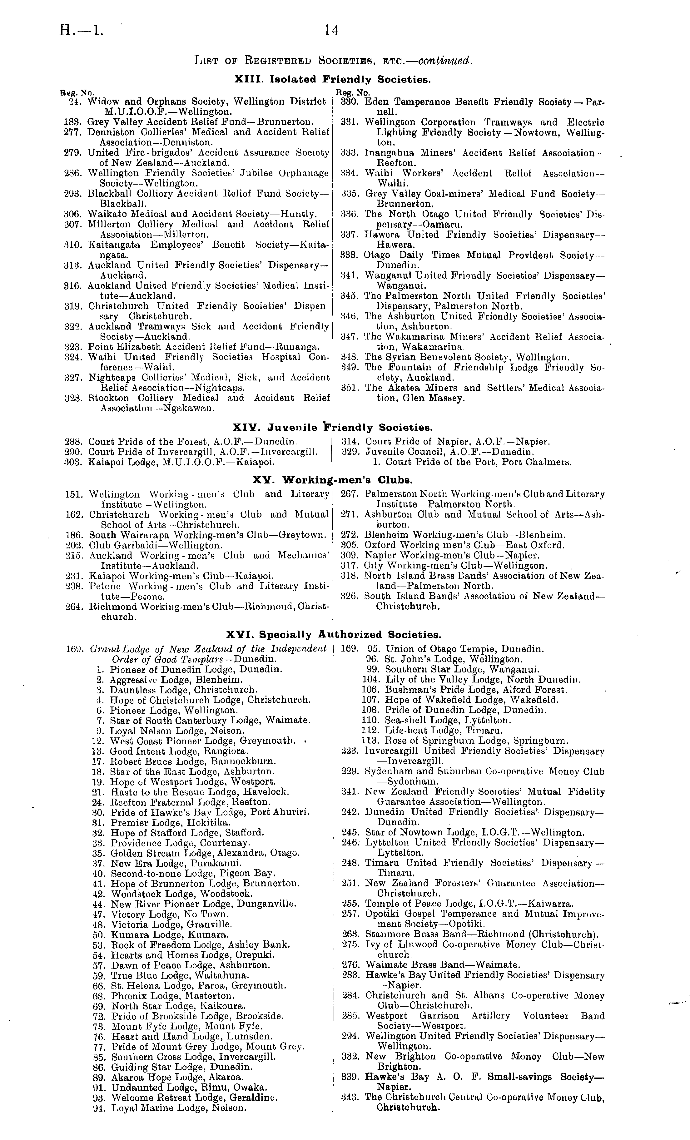 List op Registered Societies, etc. — -continued. XIII. Isolated Friendly Societies. Rug. No. Reg. No. 24. Widow and Orphans Sooiety, Wellington District 330. Eden Temperanoe Benefit Friendly Sooiety — ParM.U.l.O.O.F.—Wellington. nell. 183. Grey Valley Accident Relief Fund— Brunnerton. 331. Wellington Corporation Tramways and Electric 277. Denniston Collieries' Medical and Accident Relief Lighting Friendly Society—Newtown, WellingAssociation—Denniston. ton. 279. United Fire-brigades' Accident Assurance Society 333. Inangahua Miners' Accident Relief Association — of New Zoaland—Auckland. Reefton. 286. Wellington Friendly Societies' Jubilee Orphanage 334. Waihi Workers' Accident Relief Association - Society—Wellington. Waihi. 293. Blackball Colliery Accident Relief Fund Society— 335. Grey Valley Coal-minors' Medical Fund Sooiety Blackball. Brunnerton. 3106. Waikato Medical and Accident Society—Huntly. 336. The North Otago United Friendly Societies' Dis--307. Millerton Colliery Medical and Aocidont Relief ponsary--Oamaru. Association —Millerton. 337. Hawera United Friendly Societies' Dispensary— 310. Kaitangata Employees' Benefit Society—Kaita- '■ Hawera. ngata. 338. Otago Daily Times Mutual Provident Society — 313. Auckland United Friendly Societies' Dispensary— Dunedin. Auckland. 341. Wanganui United Friendly Societies' Dispensary— 316. Auokland United friendly Societies' Medical Insti- Wanganui. tute —Auckland. 345. The Palmerston North United Friendly Societies' 319. Christchurch United B'riendly Societies' Dispen- Dispensary, Palmerston North. sary—Christchurch. 346. The Ashburton United Friendly Societies' Associa--322. Auckland Tramways Sick and Accident Friendly tion, Ashburton. Sooiety—Auckland. 347. The Wakamarina Miners' Accident Relief Associa--323. Point Elizabeth Accident Relief Fund —Runanga. tion, Wakamarina. 324. Waihi United Friendly Societies Hospital Con- 348. The Syrian Benevolent Society, Wellington. ference—Waihi. , 349. The Fountain of Friendship Lodge Friendly So--327. Nightcaps Collieries' Medical, Sick, and Accident! ciety, Auokland. Relief AFSOciation —Nightcaps. 351. The Akatea Miners and Settlers' Medical Associa--328. Stockton Colliery Medical and Accident Relief tion, Glen Massey. Association—Ngakawau. XIV. Juvenile Friendly Societies. 288. Court Pride of the Forest, A.O.F.—Dunedin. I 314. Court Pride of Napier, A.0.F.-Napier. 290. Court Pride of Invercargill, A.O.F. -Invercargill. 329. Juvenile Council, A.O.F.—Dunedin. :103. Kaiapoi Lodge, M.U.1.0.0.F. —Kaiapoi. 1. Court Pride of tho Port, Port Chalmers. XV. Working-men's Clubs. 151. Wellington Working - men's Club and Literary! 267. Palmerston North Working-men's Club and Literary Institute—Wellington. Institute—Palmerston North. 162. Christchurch Working-men's Club and Mutual! 271. Ashburton Club and Mutual School of Arts —AshSchool of Arts -Christchurch. burton. 186. South Wairarapa Working-mon's Club—Greytown. i 272. Blenheim Working-men's Clvb —Blenheim. 202. Club Garibaldi—Wellington. 305. Oxford Working-men's Club—East Oxford. 215. Auckland Working-mon's Club and Mechanics' 309. Napior Working-men's Club—Napier. Institute—Auckland. 317. City Working-men's Club—Wellington. 231. Kaiapoi Working-men's Clvb —Kaiapoi. | 318. North Island Brass Bands' Association of New Zea--238. Petone Working-men's Club and Literary Insti- land—Palmerston North, tute—Petone. 326. South Island Bands' Association of New Zealand— 264. Richmond Working-men's Clvb —Richmond, Christ- Christchurch. churoh. XVI. Specially Authorized Societies. 169. Grand Lodge of New Zealand of the Independent | 169. 95. Union of Otago Temple, Dunedin. Order of Good Templars —Dunedin. 96. St. John's Lodge, Wellington. 1. Pioneer of Dunedin Lodge, Dunedin. 99. Southern Star Lodge, Wanganui. 2. Aggressive Lodge, Blenheim. 104. Lily of the Valley Lodge, North Dunedin. 3. Dauntless Lodge, Christchurch. 106. Bushman's Pride Lodge, Alford Forest. 4. Hope of Christchurch Lodge, Christchurch. 107. Hope of Wakefield Lodge, Wakefield. 6. Pioneer Lodge, Wellington. 108. Pride of Dunedin Lodge, Dunedin. 7. Star of South Canterbury Lodge, Waimate. 110. Sea-shell Lodge, Lyttelton. 9. Loyal Nelson Lodgo, Nelson. 1,12. Life-boat Lodge, Timaru. 12. West Coast Pioneer Lodge, Greymouth. . 113. Rose of Springburn Lodge, Springhurn. 13. Good Intent Lodge, Rangiora. 223. Invercargill United Friendly Societies' Dispensary 17. Robert Bruce Lodge, Bannockburn. —Invercargill. 18. Star of the East Lodge, Ashburton. i 229. Sydenham and Suburban Co-operative Money Club 19. Hope of Westport Lodge, Westport. —Sydenham. 21. Haste to tho Rescue Lodge, Havelock. 241. New Zealand Friendly Societies' Mutual Fidelity 24. Reefton Fraternal Lodge, Reefton. Guarantee Association—Wellington. 30. Pride of Hawke's Bay Lodge, Port Ahuriri. : 242. Dunedin United Friendly Societies' Dispensary— 31. Premier Lodge, Hokitika. Dunedin. 32. Hope of Stafford Lodge, Stafford. 245. Star of Newtown Lodge, I.O.G.T.—Wellington. 33. Providence Lodge, Courtenay. 246. Lyttelton United Friendly Societies' Dispensary— 35. Golden Stream Lodge, Alexandra, Otago. Lyttelton. 37. New Era Lodge, Purakanui. , 248. Timaru United Friendly Societies' Dispensary — 40. Second-to-nonc Lodge, Pigeon Bay. Timaru. 41. Hope of Brunnerton Lodge, Brunnerton. 251. New Zealand Foresters' Guarantee Association — 42. Woodstock Lodge, Woodstock. Christchurch. 44. New River Pioneer Lodge, Dunganvillc. 255. Temple of Peace Lodge, I.O.G.T.—Kaiwarra. 47. Victory Lodge, No Town. ; 257. Opotiki Gospel Temperance and Mutual Improve--48. Victoria Lodge, Granville. merit Society—Opotiki. 50. Kumara Lodge, Kumara. 263. Stanmore Brass Band —Richmond (Christchurch). 53. Rock of Freedom Lodge, Ashley Bank. 275. Ivy of Linwood Co-operative Money Club—Christ--54. Hearts and Homes Lodge, Orepuki. church. 57. Dawn of Peace Lodge, Ashburto