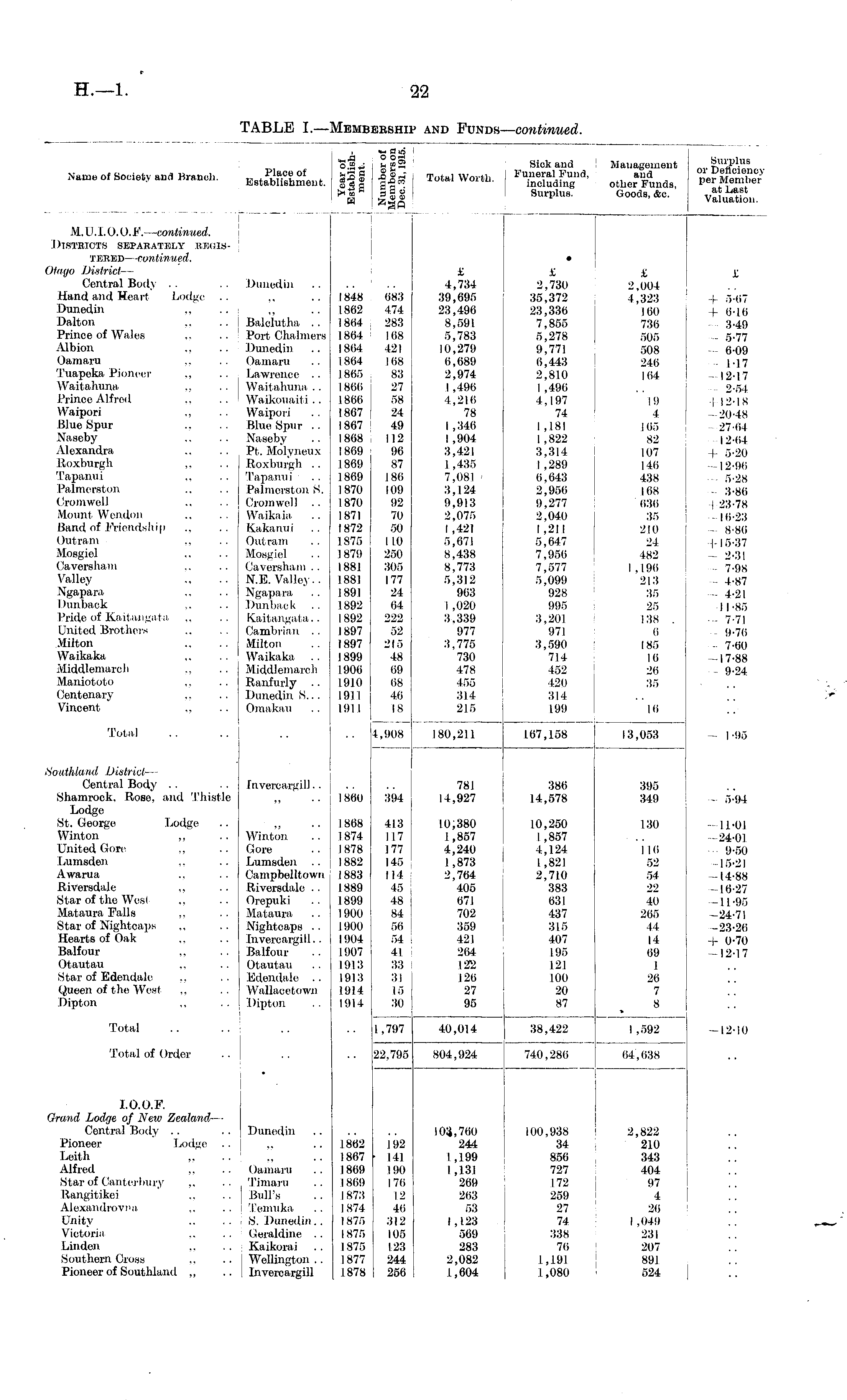 Name of Society and Branch. EsSbmeut. || f ° Oh-: i !»2 gd« i ,*r a. <u Sick and Management Total Worth. Funeral Fund, and including other Funds, Surplus. Goods, &c. Surplus or Deficiency per Member at Last Valuation. r~ M.U.I.O.O.F.— continued. Districts separately rboistered — continued. Otago District — Central Body .. .. Dunedin Hand and Heart Lodge .. ,, .. 1848 Dunedin „ .. „ 1862 Dalton ,, .. Balclutha .. 1864 Prince of Wales ,, .. Port Chalmers 1864 Albion ,, .. Dunedin .. 1864 Oamaru ,, .. Oamaru .. 1864 Tuapeka Pioneer ,, .. Lawrence .. 1865 Waitahuna ,, . . Waitahuna.. 1866 Prince Alfred ,, Waikouaiti.. 1866 Waipori ,, .. Waipori .. 1867 Blue Spur „ .. Blue Spur .. 1867 Naseby .. .. Naseby .. 1868 Alexandra ., .. Pt. Molyneux 1869 Roxburgh ,, .. Roxburgh .. 1869 Tapanui ,, .. Tapanui .. 1869 Palmerston ,. .. Palmerston S. 1870 Cromwell ., .. Cromwell .. ' 1870 Mount Wendon .. .. Waikaia 1871 Band of Friendship ., .. Kakanui .. 1872 Outram ,, .. Outram .. 1875 Mosgiel ,, .. Mosgiel .. 1879 Caversham ,. .. Caversham . . 188] Valley „ .. N.E.Valley.. 1881 Ngapara ,, .. Ngapara .. 1891 Dunback ,, .. Dunback .. 1892 Pride of Kaitangata .. .. Kaitangata.. 1892 United Brothers .. .. Cambrian .. 1897 Milton „ .. Milton .. 1897 Waikaka ,. .. Waikaka .. 1899 Middlemareh ., .. Middlemarch 1906 Maniototo ,, .. Ranfurly •• 1910 Centenary ,, .. Dunedin. S... 1911 Vincent ,, .. Omakau .. 1911 1848 683 1862 474 1864 283 1864 168 1864 421 1864 168 1865 83 1866 27 1866 58 1867 24 1867 49 1868 112 1869 96 1869 37 I 869 I 86 1870 109 1870 92 1871 70 1872 50 1875 110 1879 250 1881 305 1881 177 1891 24 1892 64 1892 222 1897 52 1897 21 6 I899 48 1906 69 1910 68 1911 46 1911 18 £ 4,734 39,695 23,496 8,591 5,783 10,279 6,689 2,974 I ,496 1,216 78 I ,346 I ,904 3,421 I ,435 7,081 3.124 9.913 2,075 1,421 5,671 8,438 8,773 5,312 963 1 ,020 3.339 977 3,775 730 478 455 314 215 • £ 2,730 35,372 23,336 7,855 5,278 9,771 6,443 2,810 1 ,496 4,197 74 1,181 1.822 3,314 1,289 6,643 2,956 9,277 2,040 1,211 5,647 7,956 7,577 5,099 928 995 3,201 971 3,590 714 452 420 314 199 £ 2,004 4,323 16(1 736 505 508 246 164 19 4 ! (i.-, 82 107 146 438 168 030 35 210 24 482 I .196 213 35 25 138 6 185 16 26 35 £ O OIK 2,004 4,323 16(1 736 505 508 246 164 19 4 ! (i.-, 82 107 146 438 168 030 35 210 24 482 I , 196 213 35 25 138 6 185 16 26 £ + 5-67 : 6-16 3-49 - 5-77 6-09 1-17 12-17 2-54 -I 12-18 20-48 27-64 I 2-64 H 5-20 12-96 5-28 3-80 I 23-78 16-23 8-86 I 15-37 2-31 7-98 4-87 4-21 I I -85 7-71 9-70 7-60 -17-88 9-24 OE 35 10 i a 10 Total 4,908 180,211 167,158 13,053 3,053 - 1-95 • Southland District — Central Body • - - - Invercargill Shamrock. Rose, and Thistle ,, .. I860 Lodge St. George Lodge .. ,, .. 1868 Winton „ .. Winton . . 1874 United Gore ,, .. Core .. ; 1878 Lumsden ,, .. Lumsden .. 1882 Awarua ., .. Campbelltown 1883 Riversdale ,, .. Riversdale .. . 1889 Star of the West ,, .. Orepuki .. 1899 Mataura Falls „ Mataura .. 1900 Star of Nightcaps ,, .. Nightcaps .. 1900 Hearts of Oak ,, .. Invercargill.. 1904 Balfour ,, .. Balfour 1907 Otautau ,, .. Otautau .. 1913 Star of Edendale ,, .. Edendale .. 1913 Queen of the West ,, .. Wallacetown 1914 Dipton „ .. Dipton .. 1914 I860 394 781 14,927 386 14,578 395 349 395 349 .-,!) I 1868 1874 1878 1882 1883 1889 1899 1900 1900 1904 1907 1913 1913 1914 1914 413 117 177 145 114 45 48 84 56 54 41 33 31 15 30 10,380 I ,857 4,240 1 ,873 2,764 405 671 702 359 421 264 122 126 27 95 10,250 I ,857 4,124 1,821 2,710 383 631 437 315 407 195 121 100 20 87 130 1 16 52 5-1 22 40 265 44 14 69 I 130 1 16 52 5-1 22 40 265 44 14 69 1 26 7 8 11-01 24-01 9-50 15-21 -14-88 16-27 I I -95 -24-71 -23-26 ■I- 0-70 12-17 I 26 Total 1,797 40,014 38,422 1,592 I ,592 12-10 Total of Order 22,795 804,924 740,286 64,638 54', 638 LO.O.F. Grand Lodge of New Zealand — Central Body • • • • Dunedin Pioneer Lodge .. .. .. 1862 Leith ,. .. .. .. 1867 Alfred „ .. Oamaru .. I860 Star of Canterbury ,. .. Timaru 1869 Rangitikei ,, . . Bull's .. 1873 Alexandrovna ,. .. Temuka .. 1874 Unity .. .. S. Dunedin. . 1875 Victoria .. Geraldine 1875 Linden .. .. Kaikorai .. 1875 Southern Cross ,, .. I Wellington .. 1877 Pioneer of Southland „ .. | Inveroargill 1878 Dunedin Oamaru Timaru Bull's Tcmuka S. Dunedin. . Geraldine .. Kaikorai Wellington .. Inveroargill 1862 I 867 1869 1869 I 873 I 87 I I 875 I 875 1875 1877 1878 192 141 190 176 12 46 312 105 123 244 256 103,760 244 I , 199 1,131 269 263 53 I . I 23 569 283 2,082 1,604 100,938 34 856 727 172 259 27 74 338 76 1,191 1,080 2,822 210 343 404 97 4 26 I ,049 231 207 891 524 i '"' -f*~-