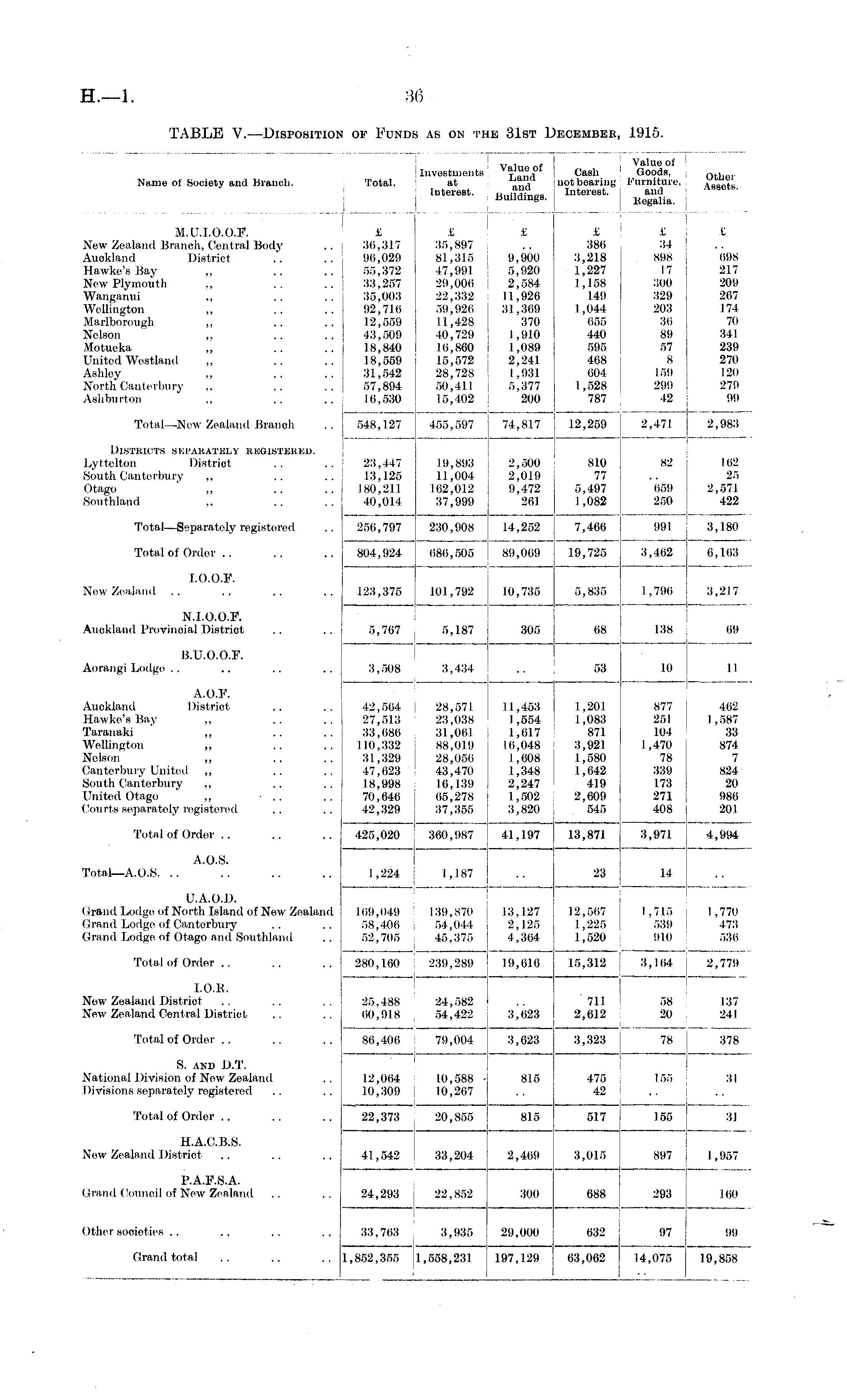 Name of Society and Branch. Total. Investments at Interest. Value of Land and Building*. Cash not bearing Interest. Value of Goods, Furniture, and Kegalia. Other Assets. I M.U.I.O.O.F. New Zealand Branch, Central Body Auokland District Hawke's Bay ,, New Plymouth ,, Wanganui ,, Wellington ,, Marlborough ,, Nelson ,, Motueka ,, United Westland Ashley ,, North Canterbury ,, Asliburton ,, £ 36,317 96,029 55,372 33,257 35,003 92,716 12,559 43,509 18,840 18,559 31,542 57,894 10,530 £ 35,897 81,315 47,991 29,006 22,332 59,926 11,428 10,729 10,860 15,572 28,728 50,411 15,402 £ 9,900 5,920 2,584 11,926 31,369 370 1,910 1,089 2,241 1,931 5,377 200 £ 386 3,218 .1,227 1,158 149 1,044 655 440 595 468 604 1,528 787 £ 34 898 17 300 329 203 36 89 57 8 159 299 42 I 698 217 209 267 174 70 341 239 270 120 279 99 Total—New Zealand Branoh 548,127 12,259 2,471 2,983 455,597 74,817 Districts ski'Akately registered. Lyttelton Distriot South Canterbury ,, Otago ,, Southland ,, 23,447 13,125 180.211 40,014 19,893 .1.1,004 162,012 37,999 2,500 2,019 9,472 261 810 77 5,497 1,082 82 659 250 102 25 2,571. 422 Total—Separately registered 256,797 230,908 14,252 7,466 991 3,180 Total of Order 804,924 686,505 89,069 19,725 3,462 6,163 LO.O.F. New Zealand 123,375 101,792 10,735 5,835 1,790 3,217 N.LO.O.F. Auckland Provincial District 69 5,767 5,187 305 68 138 B.U.O.O.F. Aorangi Lodge II 3,508 3,434 53 10 A.O.F. Auckland Distriot Hawke's Bay ,, Taranaki ,, Wellington ,, Nelson ,, Canterbury United ,, South Canterbury ,, United Otago ,, Courts separately registered 42,564 27,513 33,086 110,332 31,329 47,023 18,998 70,646 42,329 28,571 23,038 31,061 88,019 28,056 43,470 16,139 65,278 37,355 11,453 1,554 1,617 16,048 1,608 1,348 2,247 1,502 3,820 1,201 1,083 871 3,921 1,580 1,042 419 2,609 545 877 251 104 1,470 78 339 173 271 408 462 1,587 33 874 7 824 20 986 201 Total of Order 425,020 360,987 41,197 13,871 3,971 4,994 A.O.S. Total—A.O.S. 1,224 1,187 23 II U.A.O.D. Grand Lodge of North Island of New Zealand Grand Lodge of Canterbury Grand Lodge of Otago and Southland 169,049 58,406 52,705 139,870 54,044 45,375 13,127 2,125 4,364 12,567 1,225 1,520 1,715 539 910 I ,770 473 536 Total of Order 280,160 239,289 19,016 15,312 3,1 04 2.779 I.O.K. Now Zealand District New Zealand Central District 25,488 00,918 24,582 54,422 711 2,612 58 20 137 241 3,023 Total of Order . . 80,406 79,004 3,623 3,323 78 378 S. and D.T. National Division of New Zealand Divisions separately registered 12,004 10,309 10,588 -; 10,267 815 475 42 I f>f, 31 Total of Order .. 22,373 20,855 815 517 155 31 H.A.C.B.S. New Zealand District 41,542 33,204 2,469 3,015 897 1,957 P.A.F.S.A. Grand Council of New Zealand 24,293 22,852 300 688 293 160 Other societies 33,763 3,935 632 29,000 97 99 Grand total 1,852,355 1,558,231 197,129 63,062 14,075 19,858