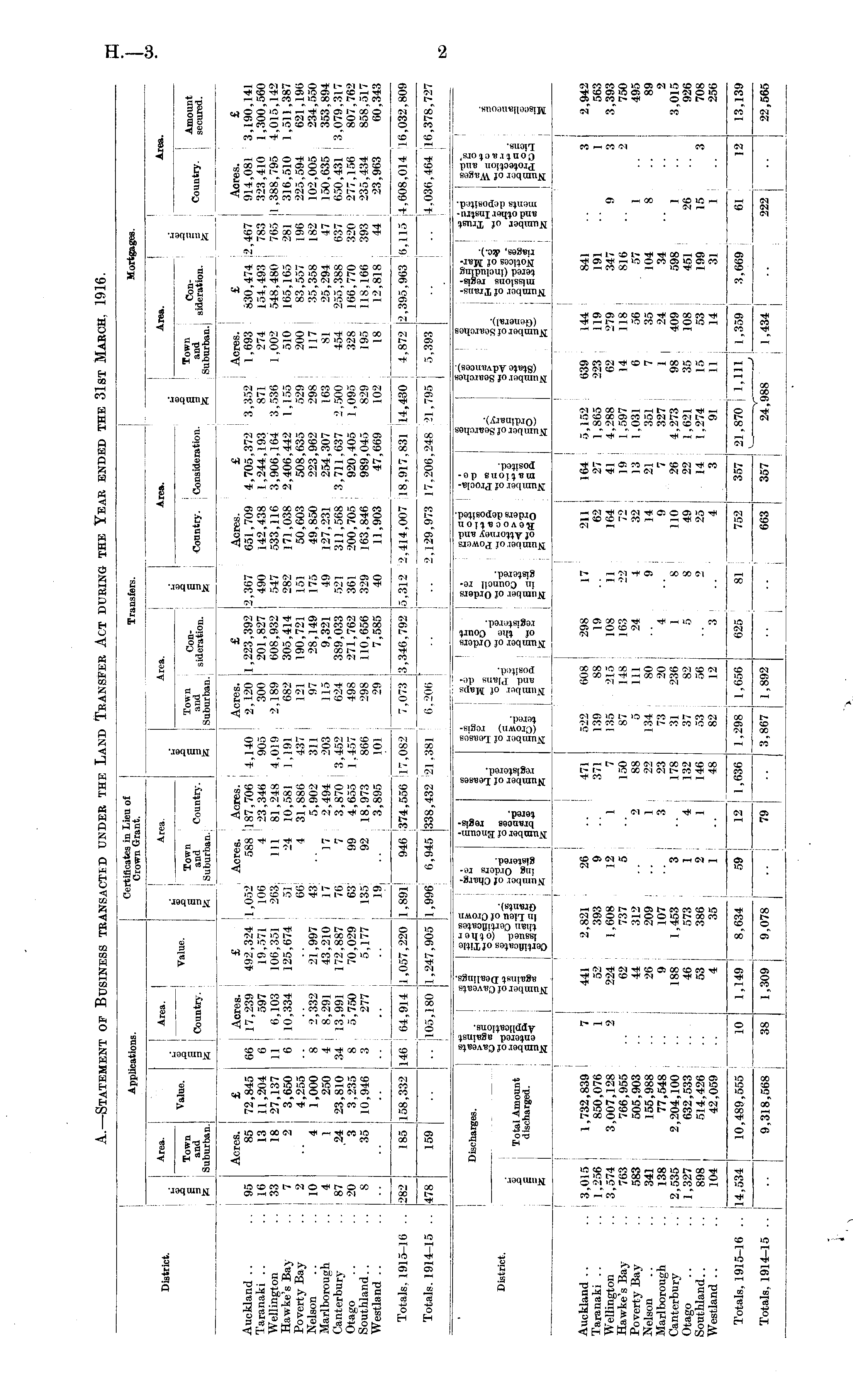 Appl sations. Certificates in Lieu of Crown Grant. Transfers. Mortgages. District. £ fc Area. Town and Suburban. Value. Area. S 3 Country. ~ 1_ Value. Area. •2 Town § and Country. fc j Suburban.; B fc T °™ Con- ~ , a . i sideration. . Suburban. Area. fc Country. Consideration. Area. ID a r% T » w . n Con- _ , an< J ; sideration. Suburban.] Area. I fc I Area. _ Amount Country. secured. Auckland Taranaki Wellington Hawke's Bay Poverty Bay Nelson Marlborough Canterbury Otago Southland.. Westland 95 16 33 7 2 10 4 87 20 8 Acres. 85 13 18 2 £ 72,845 11,204 27,137 3,650 4,255 1,000 250 23,810 3,235 10,946 Acres. £ Acres. Acres. Acres. £ 66 17,239 492,324 1,052 588 !l87,706 ! 4,140 2,120 1,223,392 6 597 19,571 ] 106 4 23,346 905 300 201,827 11 6,103 106,351 I 263 111 81,248 4,019 2,189 608,932 6 10,334 125,674 5] 24 10,581 1,191 ! 682 305,414 66 4 31,886 437 j 121 190,721 8! 2,332 21,997 43 .. 5,902 311 97 28,149 4 | 8,291 43,210 17 17 2,494 203 115 9,321 34 13,991 172,887 76 7 3,870 : 3,4.52 624 389,033 8 5,750 70,029 , 63! 99 4,655 1.457 498 271,762 3 277 5,177 135: 92 18,973 866 298 110,656 .. .. .. 19 .. 3,895 101 j 29 7,585 : ' ; : i 2,367 490 547 282 151 175 49 521 361 329 40 651,709 4,705,372 3,352 1,693 830,474 ,2,467 914,081 3,190,141 142,438 1,244,193 871 274 154,493 j 783 323,410 1,300,560 533,116 3,906,164 3,536 1,002 548,480 765 1,388,795 4,015,142 171,038 2,406,442 1,155 510 165,165 281 316,510 1,511,387 50,603 508,635 529 200 83,557 196 225,594 621,196 49,850 223,962 298 117 ; 35,358 182 102,005 234,550 127,231 254,307 163 81 25,294 47 150,635 i 353,894 311,568 , 3,711.637 2,500 454 255,388 637 650,431 j 3,079.317 200,705 ; 920,405 1,095 328 166,770 320 277,156 807,762 163,846 989,045 829 195 j 118,166 393 235,434 858,517 11,903 47,669 102 18 12,818 44 23,963 60,343 4 24 3 35 Totals. 1915-16 . . — 282 185 158,332 146 64,914 jl ,057,220 1,891 946 374,556 17,082 j 7,073 3,346.792 5,312 2,414,007 18,917,831 14,430 4,872 12,395,963 6,115 ;4,608,014 16,032,809 Totals. 1914-15 .. 159 .. jl05,180 1,996 6,945 338,432 21,381 I 1 6,206 j 2,129,973 17,206,248 21,795 5,393 4,036,464 16,378,727 478 1,247,905 I I District. Discharges. o-S . ,g Total Amount .g^S £ discharged. g z& =3 ■ on n c i , _„3 5 o 01 at© fc if fc St J Sep. §oS §•= ac g oPno SCO. fc fc fc | fc fc a g 3 . ID r^ SO rd f§ I g-BiJ Wis fc , fc I fc fc ,§■8 - - c2°.= 3P.CJ 3 3 o J* ! I I . I ! I I Auckland .. .. | 3,015 Taranaki .. 1,256 Wellington .. j 3,574 Hawke's Bay .. 763 Poverty Bay .. 583 Nelson .. .. 341 Marlborough 138 Canterburv .. 2,535 Otago .. -.11 ,327 Southland.. .. 898 Westland .. .. ''■ 104 1,732,839 850,076 3,007,128 766,955 505,903 155,988 77,548 2,204,100 632,533 514,426 42,059 7 1 2 441 52 224 62 44 26 9 188 46 53 4 2,821 393 1,608 737 312 209 107 1,453 573 386 35 26 9 12 5 3 1 2 1 1 2 1 3 4 1 471 371 7 150 88 22 23 178 132 146 48 522 139 135 87 5 134 73 31 37 53 82 608 88 215 148 111 80 20 236 82 56 12 298 19 108 163 24 4 5 3 ! 17 11 22 4 9 8 8 2 211 62 164 72 32 14 9 110 49 25 4 164 i 5,152 27 1.865 41 4.288 19 1,597 13 1.031 21 351 7 327 26 4,273 22 1,621 14 1,274 3 j 91 639 223 62 14 6 7 1 | 98 35 15 11 144 119 279 118 56 35 24 409 108 53 14 841 191 347 816 57 104 34 598 451 199 31 9 1 8 1 26 15 1 3 1 3 2 :: I 3 2,942 563 3,393 750 495 89 2 3,015 926 708 256 Totals, 1915-16 .. 14,534 10,489,555 10,489,555 10 10 1,149 8,634 59 ! 12 I ,636 1,298 1,656 625 ~~( 81 ! 752 357 21,870 | 1,111 ! 1,359 3,669 ■ 61 12 13,139 " Totals, 1914-15 9,318,568 38 1,309 9,078 79 3,867 1,892 I 663 357 | 24,988 1,434 ; 1,434 " " 222 22,565 I