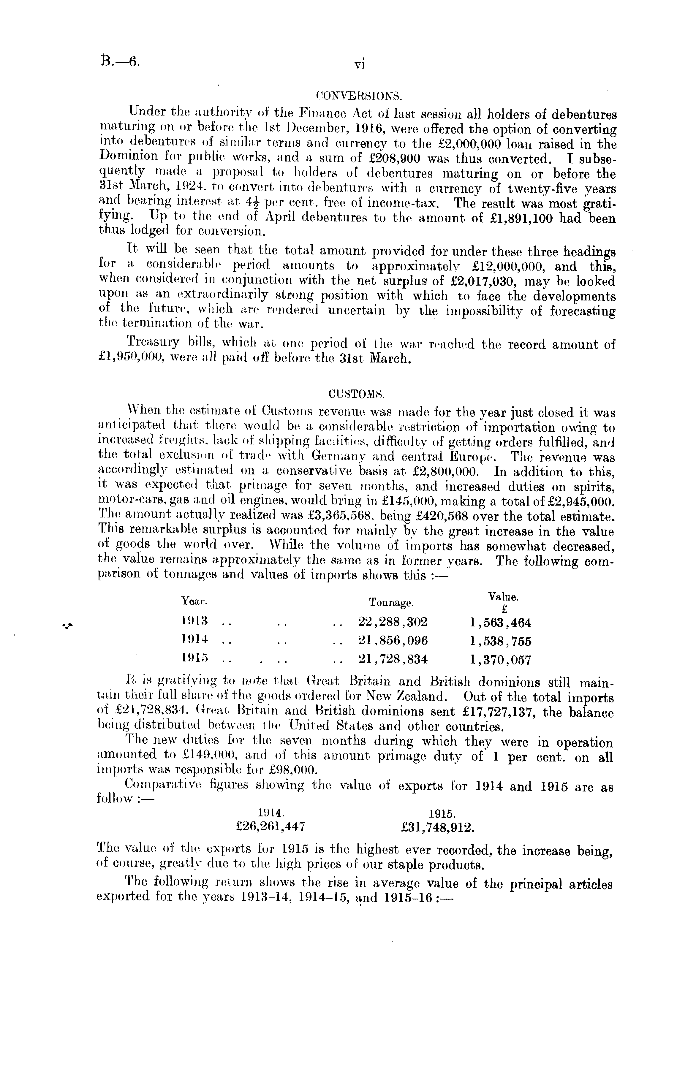 CONVERSIONS. Under the authority of the Finance Act of last session all holders of debentures maturing on or before the Ist December, 1916, were offered the option of converting into debentures of similar terms and currency to the £2,000,000 loan raised in the Dominion for public works, and a sum of £208,900 was thus converted. I subsequently made a proposal to holders of debentures maturing on or before the 31st March, 1924, to convert into debentures with a currency of twenty-five years and bearing interest at 4£ per cent, free of income-tax. The result was most gratifying. Up to the end of April debentures to the amount of £1,891,100 had been thus lodged for conversion. It will be seen that the total amount provided for under these three headings for a considerable period amounts to approximately £12,000,000, and this, when considered in conjunction with the net surplus of £2,017,030, may be looked upon as an extraordinarily strong position with which to face the developments of the future, which are rendered uncertain by the impossibility of forecasting the termination of the war. Treasury bills, which at one period of the war reached the record amount of £1,950,000, were all paid off before the 31st March. CUSTOMS. When the estimate of Customs revenue was made for the year just closed it was anticipated that there would be a considerable restriction of importation owing to increased freights, lack of shipping faculties, difficulty of getting orders fulfilled, and the total exclusion of trade with Germany and central Europe. The revenue was accordingly estimated on a conservative basis at £2,800,000. In addition to this, it was expected that primage for seven months, and increased duties on spirits, motor-cars, gas and oil engines, would bring in £145,000, making a total of £2,945,000. The amount actually realized was £3,365,568, being £420,568 over the total estimate. This remarkable surplus is accounted for mainly by the great increase in the value of goods the world over. While the volume of imports has somewhat decreased, the value remains approximately the same as in former years. The following comparison of tonnages and values of imports shows this :—- Year. Tonnage. VaJle--1913 .. .. .. 22,288,302 1,563,464 1914 .. .. .. 21,856,096 1,538,755 1915 .. 21,728,834 1,370,057 It is gratifying to note that Great Britain and British dominions still maintain their full share of the goods ordered for New Zealand. Out of the total imports of £21,728,834, Great Britain and British dominions sent £17,727,137, the balance being distributed between the United States and other countries. The new duties for the seven months during which they were in operation amounted to £149,000, and of this amount primage duty of 1 per cent, on all imports was responsible for £98,000. Comparative figures showing the value of exports lor 1914 and 1915 are as follow :— 1914. 1915. £26,261,447 £31,748,912. The value of the exports for 1915 is the highest ever recorded, the increase being, of course, greatly due to the high prices of our staple products. The following return shows the rise in average value of the principal articles exported for the years 1913-14, 1914-15, and 1915-16 :—