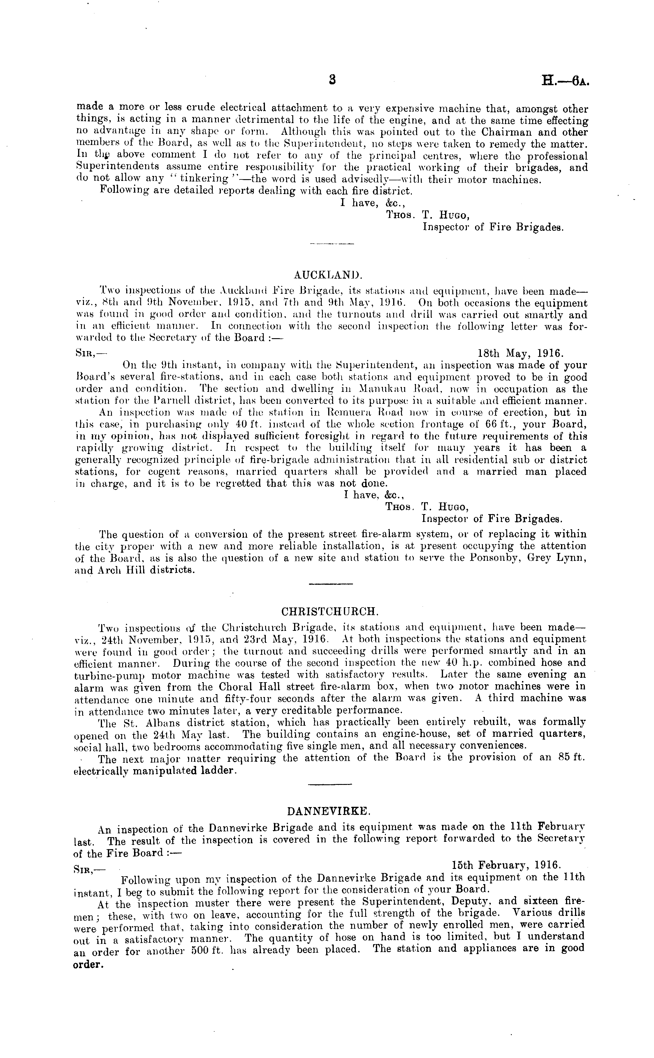 AUCKLAND. Two inspections of the Auckland Fire Brigade, its stations and equipment, have been made—■ viz, Bth and 9th November. 1915. and 7th and 9th May, 1916. On both occasions the equipment was found in good order and condition, and the turnouts and drill was carried out smartly and in an efficient manner. In connection with the second inspection the following letter was forwarded to the Secretary of the Board : — Sir,— 18th May, 1916. On the 9th instant, in company with the Superintendent, an inspection was made of your Board's several fire-stations, and in each case both stations and equipment jM'oved to be in good order and condition. The section and dwelling in Manukati Road, now in occupation as the station for the Parnell district, has been converted to its purpose in a suitable and efficient manner. An inspection was made of the station in Remuera Road now in course of erection, but in this case, in purchasing only 40 ft. instead of the whole section frontage of 66 ft., your Board, in my opinion, has not displayed sufficient foresight in regard to the future requirements of this rapidly growing district. In respect to the building itself for many years it has been a generally recognized principle of fire-brigade administration that in all residential sub or district stations, for cogent reasons, married quarters shall be provided and a married man placed in charge, and it is to be regretted that this was not done. I have, &c, Thos. T. Hugo, Inspector of Fire Brigades. The question of a conversion of the present street fire-alarm system, or of replacing it within the city propei' with a new and more reliable installation, is at present occupying the attention of the Board, as is also the question of a new site and station to serve the Ponsonby, Grey Lynn, and Arch Hill districts.