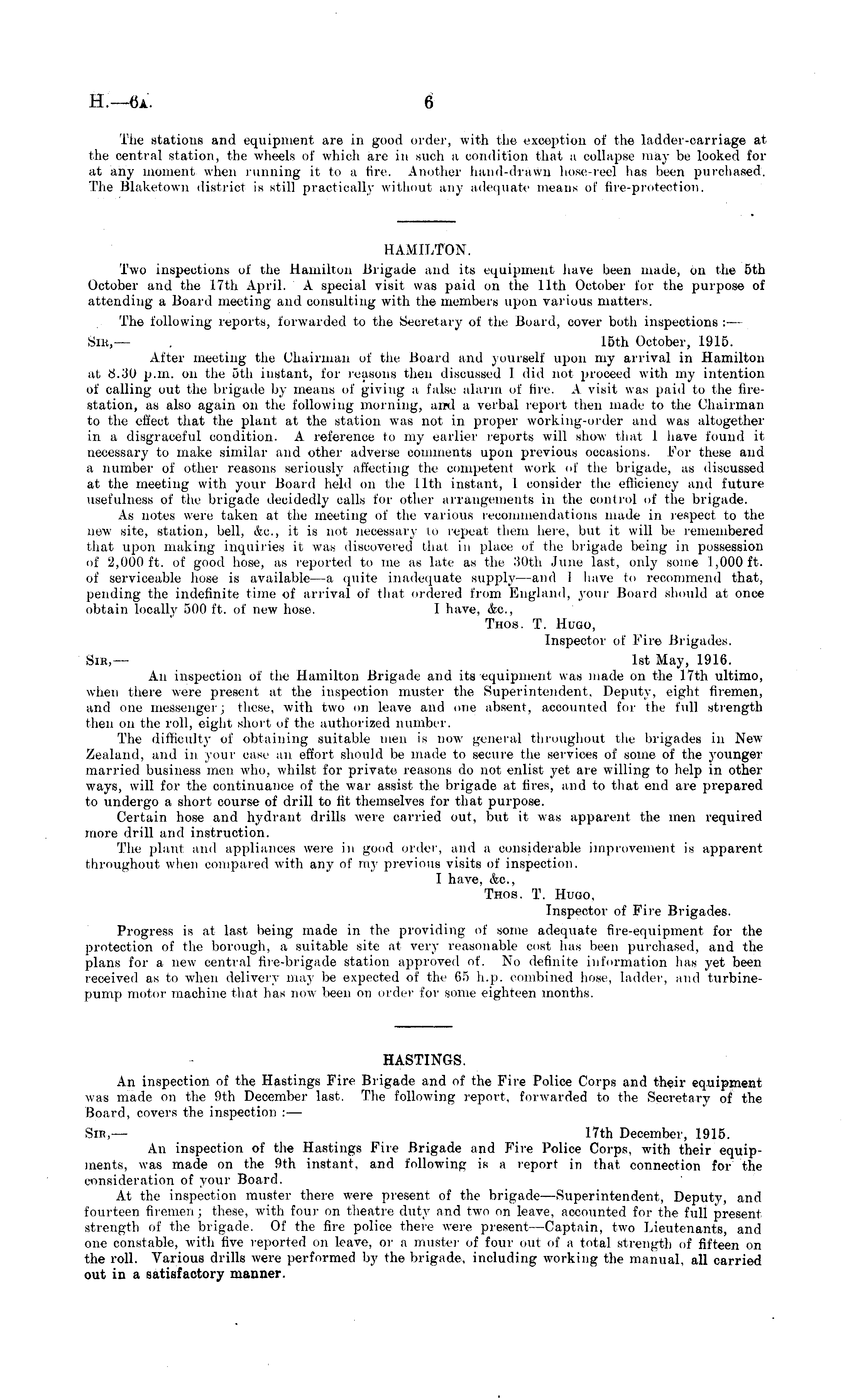 HASTINGS. An inspection of the Hastings Fire Brigade and of the Fire Police Corps and their equipment was made on the 9th December last. The following report, forwarded to the Secretary of the Board, covers the inspection : — Sir,— 17th December, 1915. An inspection of the Hastings Fire Brigade and Fire Police Corps, with their equipments, was made on the 9th instant, and following is a report in that connection for the consideration of your Board. At the inspection muster there were present of the brigade —Superintendent, Deputy, and fourteen firemen; these, with four on theatre duty and two on leave, accounted for the full present strength of the brigade. Of the fire police there were present —Captain, two Lieutenants, and one constable, with five reported on leave, or a muster of four out of a total strength of fifteen on the roll. Various drills were performed by the brigade, including working the manual, all carried out in a satisfactory manner.