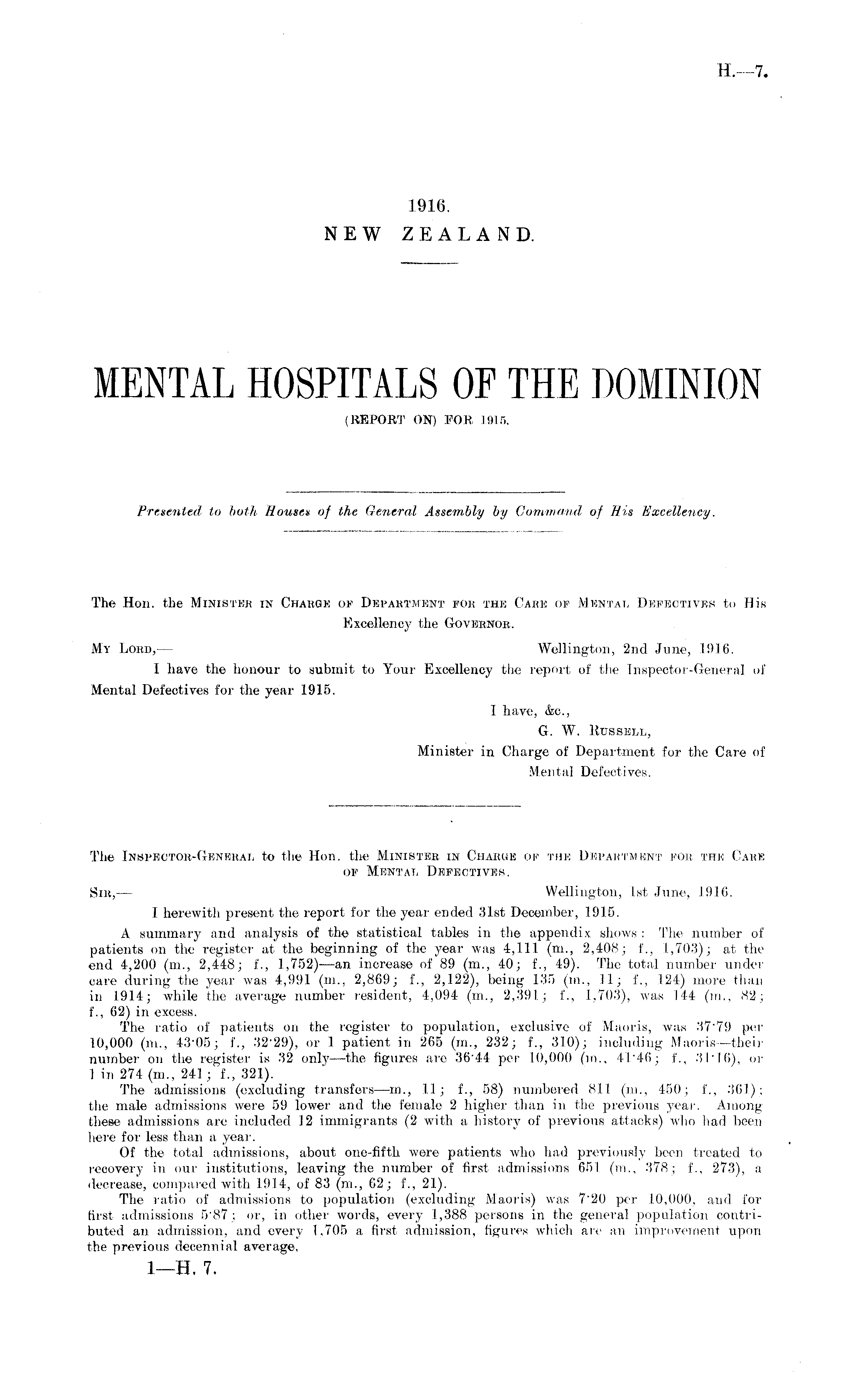 The Inspector-General to the Hon. the Minister in Charge of the Department for the Care of Mental Defectives. Sir,— Wellington, Ist June, 1910. I herewith present the report for the year ended 31st December, 1915. A summary and analysis of the statistical tables in the appendix shows : The number of patients on the register at the beginning of the year was 4,111 (m., 2,408; f., 1,703)j at the end 4,200 (m., 2,448; f., 1,752)— an increase of 89 (m., 40; f., 49). The total number under care during the year was 4,991 (m., 2,869; f,, 2,122), being 135 (m., 11; f., 124) more than in 1914; while the average number resident, 4,094 (in., 2,391; f., 1,703), was 144 (m., 82; f., 62) in excess. The ratio of patients on the register to population, exclusive of Maoris, was 3779 per 10,000 (fii., 4305; f., 3229), or 1 patient in 265 (m., 232; f., 310); including Maoris—their number on the register is 32 onlv —the figures are 3644 per 10,000 (in., 4146; f., 31' 16), or 1 in 274 (m., 241; f., 321). The admissions (excluding transfers —in., 11; f., 58) numbered 811 (in., 450; f., 361); the male admissions were 59 lower and the female 2 higher than in the previous year. Among these admissions arc included 12 immigrants (2 with a history of previous attacks) who had been here for less than a year. Of the total admissions, about one-fifth were patients who had previously been treated to recovery in our institutions, leaving the number of first admissions 651 (m., 378; f., 273), a decrease, compared with 1914, of 83 (m., 62; f., 21). The ratio of admissions to population (excluding Maoris) was 720 per 10,000, and for first admissions 587; or, in other words, every 1,388 persons in the general population contributed an admission, and every 1,705 a first admission, figures which are an improvement upon the previous decennial average,