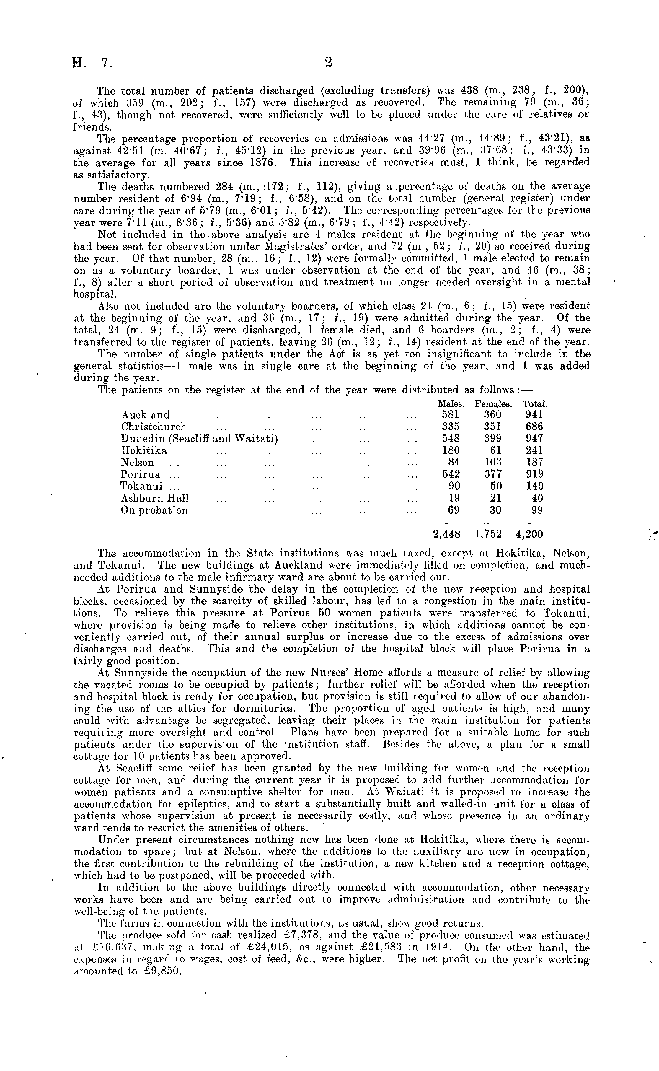 The total number of patients discharged (excluding transfers) was 438 (m., 238; f., 200), of which 359 (m., 202; f., 157) were discharged as recovered. The remaining 79 (m., 36; f'., 43), though not recovered, were sufficiently well to be placed under the care of relatives or friends. The percentage proportion of recoveries on admissions was 4427 (m., 4489; f., 4321), as against 42-51 (m. 4067; f., 4512) in the previous year, and 3996 (m., 3768; f., 4333) in the average for all years since 1876. This increase of recoveries must, I think, be regarded as satisfactory. The deaths numbered 284 (m., .172; f., 112), giving a percentage of deaths on the average number resident of 694 (m., T l9; f., 658), and on the total number (general register) under care during the year of 579 (m., 601; f., 542). The corresponding percentages for the previous year were 7'll (m., 836; f., 536) and 582 (m., 679; £~ 442) respectively. Not included in the above analysis are 4 males resident at the beginning of the year who had been sent for observation under Magistrates' order, and 72 (m., 52; f., 20) so received during the year. Of that number, 28 (m., 16; f., 12) were formally committed, 1 male elected to remain on as a voluntary boarder, 1 was under observation at the end of the year, and 46 (m., 38; f., 8) after a short period of observation and treatment no longer needed oversight in a mental hospital. Also not included are the voluntary boarders, of which class 21 (m., 6; f., 15) were resident at the beginning of the year, and 36 (m., 17; f., 19) were admitted during the year. Of the total, 24 (m. 9; f., 15) were discharged, 1 female died, and 6 boarders (m., 2; f., 4) were transferred to the register of patients, leaving 26 (m., 12; f., 14) resident at the end of the year. The number of single patients under the Act is as yet too insignificant to include in the general statistics—l male was in single care at the beginning of the year, and 1 was added during the year. The patients on the register at the end of the year were distributed as follows : — Males. Females. Total. Auckland ... ... ... ... ... 581 360 941 Christchurch ... ... ... ... ... 335 351 686 Dunedin (Seacliff and Waitati) ... ... ... 548 399 947 Hokitika ... ... ... ... ... 180 61 241 Nelson ... ... ... ... ... ... 84 103 187 Porirua ... ... ... ... ... ... 542 377 919 Tokanui ... ... ... ... ... ... 90 50 140 AshburnHall ... ... ... ... ... 19 21 40 On probation ... ... ... ... ... 69 30 99 2,448 1,752 4,200 The accommodation in the State institutions was much taxed, except at Hokitika, Nelson, and Tokanui. The new buildings at Auckland were immediately filled on completion, and muchneeded additions to the male infirmary ward are about to be carried out. At Porirua and Sunnyside the delay in the completion of the new reception and hospital blocks, occasioned by the scarcity of skilled labour, has led to a congestion in the main institutions. To relieve this pressure at Porirua 50 women patients were transferred to Tokanui, where provision is being made to relieve other institutions, in which additions cannot be conveniently carried out, of their annual surplus or increase due to the excess of admissions over discharges and deaths. This and the completion of the hospital block will place Porirua in a fairly good position. At Sunnyside the occupation of the new Nurses' Home affords a measure of relief by allowing the vacated rooms to be occupied by patients; further relief will be afforded when the reception and hospital block is ready for occupation, but provision is still required to allow of our abandoning the use of the attics for dormitories. The proportion of aged patients is high, and many could with advantage be segregated, leaving their places in the main institution for patients requiring more oversight and control. Plans have been prepared for a suitable home for such patients under the supervision of the institution staff. Besides the above, a plan for a small cottage for 10 patients has been approved. At Seacliff some relief has been granted by the new building for women and the reception cottage for men, and during the current year it, is proposed to add further accommodation for women patients and a consumptive shelter for men. At Waitati it is proposed to increase the accommodation for epileptics, and to start a substantially built and wallcd-in unit for a class of patients whose supervision at present is necessarily costly, and whose presence in an ordinary ward tends to restrict the amenities of others. Under present circumstances nothing new has been done at Hokitika, where there is accommodation to spare; but at Nelson, where the additions to the auxiliary are now in occupation, the first contribution to the rebuilding of the institution, a new kitchen and a reception cottage, which had to be postponed, will be proceeded with. In addition to the above buildings directly connected with accommodation, other necessary works have been and are being carried out to improve administration and contribute to the well-being of the patients. The farms in connection with the institutions, as usual, show good returns. The produce sold for cash realized £7,378, and the value of produce consumed was estimated at £16,637, making a total of .£24,015, as against £21,583 in 1914. On the other hand, the expenses in regard to wages, cost of feed, &c, were higher. The net profit on the year's working amounted to £9,850.