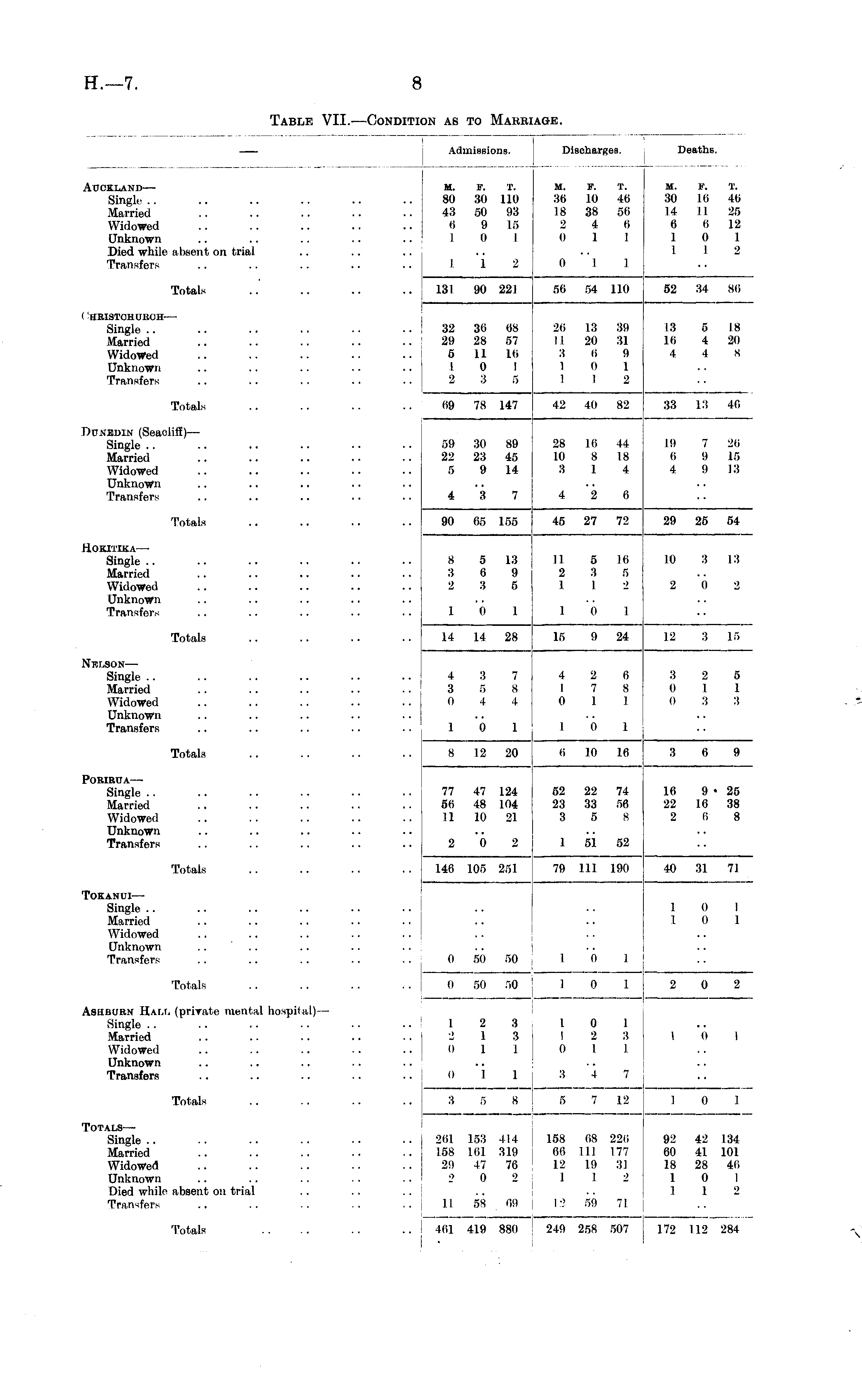 Admissions. Discharges. Deaths. AuCKIiAND— Single Married Widowed Unknown Died while absent on trial Transfers M. F. T. 80 30 110 43 50 93 6 9 15 I 0 I M. F. T. 36 10 46 18 38 56 2 4 6 0 1 1 M. F. 30 16 14 II 6 6 1 0 I 1 T. in 25 12 1 2 I 1 2 0 " 1 1 Totals 131 90 221 56 54 110 52 34 86 I HRISTUHURaH— Single Married WidoWed Unknown Transfers 32 29 5 1 2 36 28 11 0 3 68 57 16 I 5 26 II 3 1 I 13 20 6 0 I 39 31 9 I 2 13 16 4 5 4 4 18 20 8 Totals 69 78 147 42 40 82 33 13 46 Dunkdin (Seacliff) — Single Married Widowed Unknown Transfers 59 22 5 30 23 9 89 45 14 28 10 3 Hi 8 1 44 18 4 19 6 4 7 9 9 26 15 13 4 3 7 4 2 6 Totals 90 65 155 45 27 72 29 25 54 Hokitika — Single Married Widowed Unknown Transfers 8 3 2 5 6 3 13 9 5 II 2 1 5 3 1 16 5 2 10 2 3 0 13 2 1 6 1 1 0 1 Totals 14 14 28 15 9 24 12 3 15 Nelson —■ Single Married Widowed Unknown Transfers 4 3 0 3 5 4 7 8 4 4 I 0 2 7 1 li 8 1 3 0 0 2 1 3 5 1 3 1 6 1 I 0 I Totals 8 12 20 6 10 16 3 Porirua — Single Married Widowed Unknown Transfers 77 56 11 47 124 48 104 10 21 52 23 3 22 33 5 74 56 8 16 22 2 9 • 25 16 38 6 8 2 0 2 I si 52 Totals 146 105 251 79 111 190 40 31 71 Tokanui — Single Married Widowed Unknown Transfers 1 1 0 0 I 1 0 50 50 1 0 1 Totals 0 50 50 I 0 I Ashbukn HAf.i. (private mental hospital)— Single Married Widowed Unknown Transfers 1 2 3 2 1 3 0 1 I 1 0 1 I 2 3 0 1 I I 0 I oil 3 -I 7 Totals _ 1 3 5 8 l_ 5 7 12 I 0 1 Totals — Single Married Widowed Unknown Died while absent on trial Transfers 261 1.53 414 158 161 319 29 47 76 2 0 2 158 68 226 86 III 177 12 19 31 I 12 92 42 134 60 41 101 18 28 46 1 0 I I 1 2 I I 58 69 12 59 71 Totals 461 419 880 249 258 507 ! 172 112 284