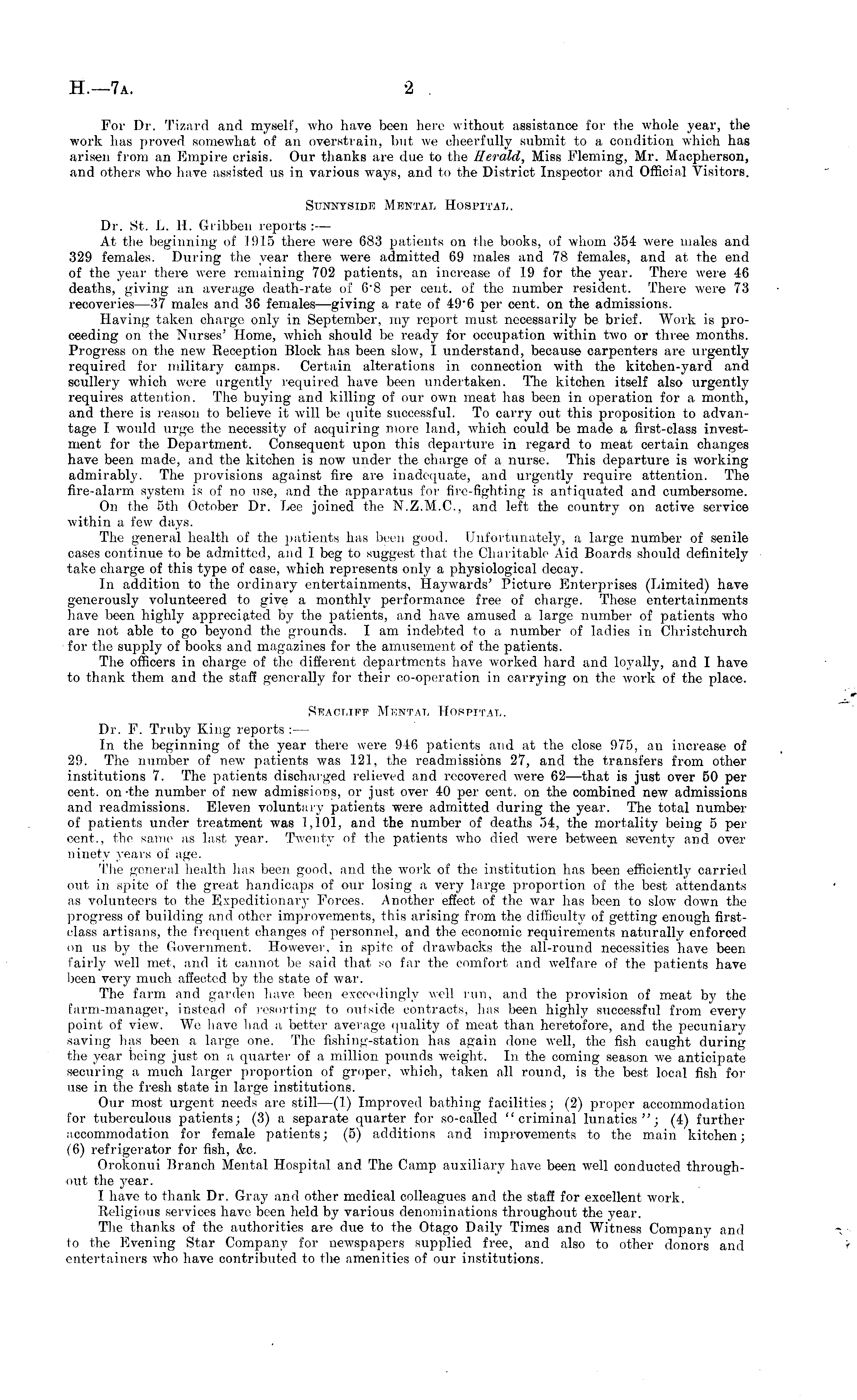 For Dr. Tizard and myself, who have been here without assistance for the whole year, the work has proved somewhat of an overstrain, but Ave cheerfully submit to a condition which has arisen from an Empire crisis. Our thanks are due to the Herald, Miss Fleming, Mr. Macpherson, and others who have assisted us in various ways, and to the District Inspector and Official Visitors. Sunnysidh Mental Hospital. Dr. St. L. H. Gribben reports : — At the beginning of 1915 there were 683 patients on the books, of whom 354 were males and 329 females. During the year there were admitted 69 males and 78 females, and at the end of the year there were remaining 702 patients, an increase of 19 for the year. There were 46 deaths, giving an average death-rate of 6'8 per cent, of the number resident. There were 73 recoveries—37 males and 36 females —giving a rate of 49'6 per cent, on the admissions. Having taken charge only in September, my report must necessarily be brief. Work is proceeding on the Nurses' Home, which should be ready for occupation within two or three months. Progress on the new Reception Block has been slow, I understand, because carpenters are urgently required for military camps. Certain alterations in connection with the kitchen-yard and scullery which were urgently required have been undertaken. The kitchen itself also urgently requires attention. The buying and killing of our own meat has been in operation for a month, and there is reason to believe it will be quite successful. To carry out this proposition to advantage I would urge the necessity of acquiring more land, which could be made a first-class investment for the Department. Consequent upon this departure in regard to meat certain changes have been made, and the kitchen is now under the charge of a nurse. This departure is working admirably. The provisions against fire are inadequate, and urgently require attention. The fire-alarm system is of no use, and the apparatus for fire-fighting is antiquated and cumbersome. On the 5th October Dr. Lee joined the N.Z.M.C., and left the country on active service within a few days. The general health of the patients has been good. Unfortunately, a large number of senile cases continue to be admitted, and I beg to suggest that the Charitable Aid Boards should definitely take charge of this type of case, which represents only a physiological decay. In addition to the ordinary entertainments, Haywards' Picture Enterprises (Limited) have generously volunteered to give a monthly performance free of charge. These entertainments have been highly appreciated by the jsatients, and have amused a large number of patients who are not able to go beyond the grounds. I am indebted to a number of ladies in Christchurch for the supply of books and magazines for the amusement of the patients. The officers in charge of the different departments have worked hard and loyally, and I have to thank them and the staff generally for their co-operation in carrying on the work of the place. Skaolifp Mental Hospital. Dr. F. Truby King reports : — In the beginning of the year there were 946 patients and at the close 975, an increase of 29. The number of new patients was 121, the readmissibns 27, and the transfers from other institutions 7. The patients discharged relieved and recovered were 62 —that is just over 50 per cent, on -the number of new admissions, or just over 40 per cent, on the combined new admissions and readmissions. Eleven voluntary patients were admitted during the year. The total number of patients under treatment was 1,101, and the number of deaths 54, the mortality being 5 per cent., the same as last year. Twenty of the patients who died were between seventy and over ninety years of age. The general health has been good, and the work of the institution has been efficiently carried out in spite of the great handicaps of our losing a very large proportion of the best attendants as volunteers to the Expeditionary Forces. Another effect of the war has been to slow down the progress of building and other improvements, this arising from the difficulty of getting enough firstclass artisans, the frequent changes of personnel, and the economic requirements naturally enforced on us by the Government. However, in spite of drawbacks the all-round necessities have been fairly well met, and it cannot be said that so far the comfort and welfare of the patients have been very much affected by the state of war. The farm and garden have been exceedingly well run, and the provision of meat by the farm-manager, instead, of resorting to outside contracts, has been highly successful from every point of view. We have had a better average quality of meat than heretofore, and the pecuniary saving has been a large one. The fishing-station has again done well, the fish caught during the year being just on a quarter of a million pounds weight. In the coming season we anticipate securing a much larger proportion of groper, which, taken all round, is the best local fish for use in the fresh state in large institutions. Our most urgent needs are still —(1) Improved bathing facilities; (2) proper accommodation for tuberculous patients; (3) a separate quarter for so-called "criminal lunatics"; (4) further accommodation for female patients; (5) additions and improvements to the main kitchen; (6) refrigerator for fish, &c. Orokonui Branch Mental Hospital and The Camp auxiliary have been well conducted throughout the j'ear. I have to thank Dr. Gr.Ty and other medical colleagues and the staff for excellent work. Religious services have been held by various denominations throughout the year. The thanks of the authorities are due to the Otago Daily Times and Witness Company and to the Evening Star Company for newspapers supplied free, and also to other donors and entertainers who have contributed to the amenities of our institutions.