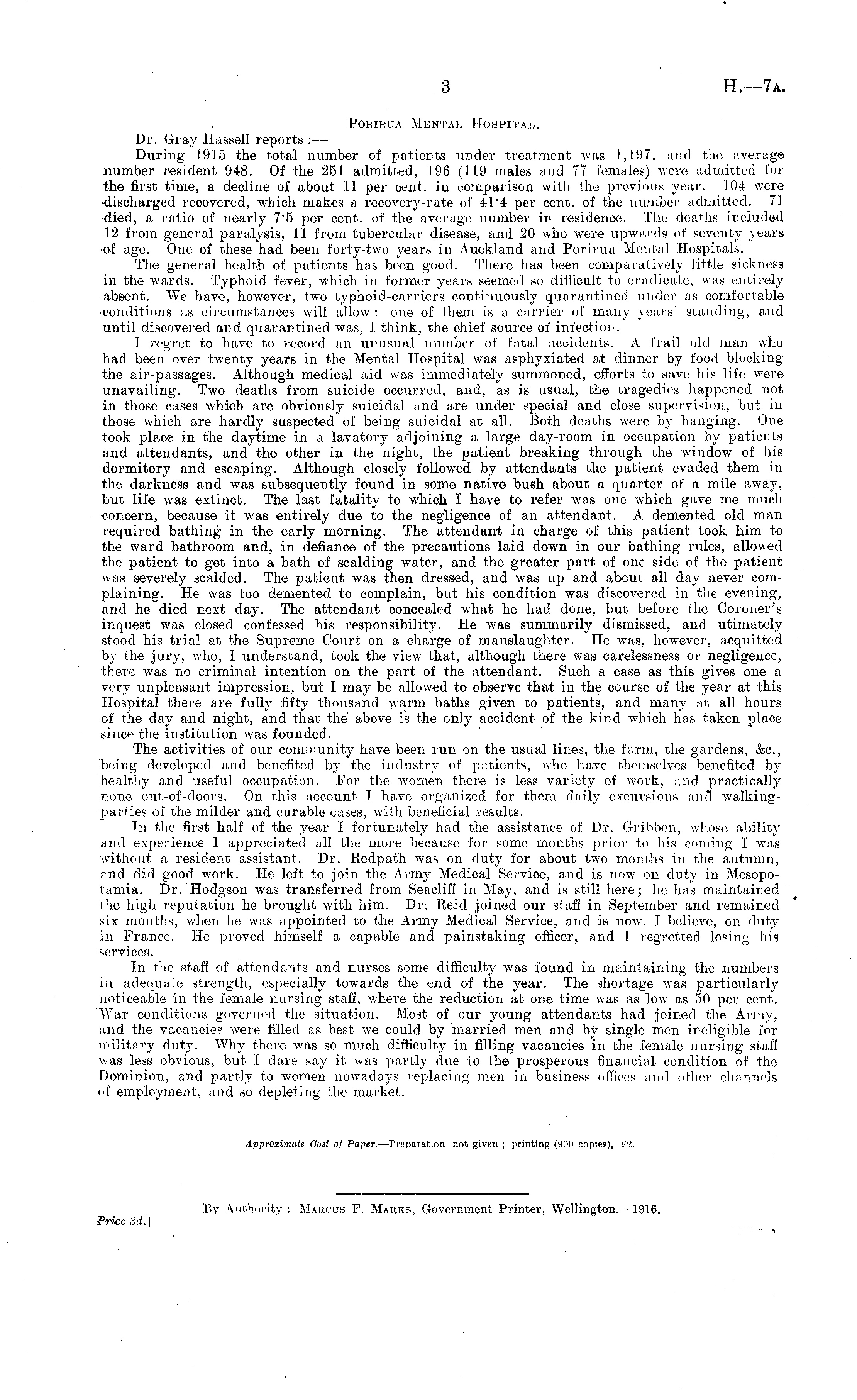 Pobirua Mental Hospital. Dr. Gray Hassell reports : — During 1915 the total number of patients under treatment was 1,197, and the average number resident 948. Of the 251 admitted, 196 (119 males and 77 females) were admitted for the first time, a decline of about 11 per cent, in comparison with the previous year. 104 were discharged recovered, which makes a recovery-rate of 4L4 per cent, of the number admitted. 71 died, a ratio of nearly 7"5 per cent, of the average number in residence. The deaths included 12 from general paralysis, II from tubercular disease, and 20 who were upwards of seventy years •of age. One of these had been forty-two years in Auckland and Porirua Mental Hospitals. The general health of patients has been good. There has been comparatively little sickness in the wards. Typhoid fever, which in former years seemed so difficult to eradicate, was entirely absent. We have, however, two typhoid-carriers continuously quarantined under as comfortable conditions us circumstances will allow ; one of them is a carrier of many years' standing, and until discovered and quarantined was, I think, the chief source of infection. I regret to have to record an unusual number of fatal accidents. A frail old man who had been over twenty years in the Mental Hospital was asphyxiated at dinner by food blocking the air-passages. Although medical aid was immediately summoned, efforts to save his life were unavailing. Two deaths from suicide occurred, and, as is usual, the tragedies happened not in those cases which are obviously suicidal and are under special and close supervision, but in those which are hardly suspected of being suicidal at all. Both deaths were by hanging. One took place in the daytime in a lavatory adjoining a large day-room in occupation by patients and attendants, and the other in the night, the patient breaking through the window of his dormitory and escaping. Although closely followed by attendants the patient evaded them in the darkness and was subsequently found in some native bush about a quarter of a mile away, but life was extinct. The last fatality to which I have to refer was one which gave me much concern, because it was entirely due to the negligence of an attendant. A demented old man required bathing in the early morning. The attendant in charge of this patient took him to the ward bathroom and, in defiance of the precautions laid down in our bathing rules, allowed the patient to get into a bath of scalding water, and the greater part of one side of the patient was severely scalded. The patient was then dressed, and was up and about all day never complaining. He was too demented, to complain, but his condition was discovered in the evening, and he died next day. The attendant concealed what he had done, but before the Coroner's inquest was closed confessed his responsibility. He was summarily dismissed, and utimately stood his trial at the Supreme Court on a charge of manslaughter. He was, however, acquitted by the jury, who, I understand, took the view that, although there was carelessness or negligence, there was no criminal intention on the part of the attendant. Such a case as this gives one a very unpleasant impression, but I may be allowed to observe that in the course of the year at this Hospital there are fully fifty thousand warm baths given to patients, and many at all hours of the day and night, and that the above is the only accident of the kind which has taken place since the institution was founded. The activities of our community have been run on the usual lines, the farm, the gardens, &c, being developed and benefited by the industry of patients, who have themselves benefited by healthy and useful occupation. For the women there is less variety of work, and practically none out-of-doors. On this account I have organized for them daily excursions ami walkingparties of the milder and curable cases, with beneficial results. In the first half of the year I fortunately had the assistance of Dr. Gribben, whose ability and experience I appreciated all the more because for some months prior to his coming I was without a resident assistant. Dr. Redpath was on duty for about two months in the autumn, and did good work. He left to join the Army Medical Service, and is now on duty in Mesopotamia. Dr. Hodgson was transferred from Seacliff in May, and is still here; he has maintained the high reputation he brought with him. Di\ Reid joined our staff in September and remained six months, when he was appointed to the Army Medical Service, and is now, I believe, on duty in France. He proved himself a capable and painstaking officer, and I regretted losing his services. In the staff of attendants and nurses some difficulty was found in maintaining the numbers in adequate strength, especially towards the end of the year. The shortage was particularly noticeable in the female nursing staff, where the reduction at one time was as low as 50 per cent. War conditions governed the situation. Most of our young attendants had joined the Army, and the vacancies were filled as best we could by married men and by single men ineligible for military duty. Why there was so much difficulty in filling vacancies in the female nursing staff was less obvious, but I dare say it was partly due to the prosperous financial condition of the Dominion, and partly to women nowadays replacing men in business offices and other channels of employment, and so depleting the market.