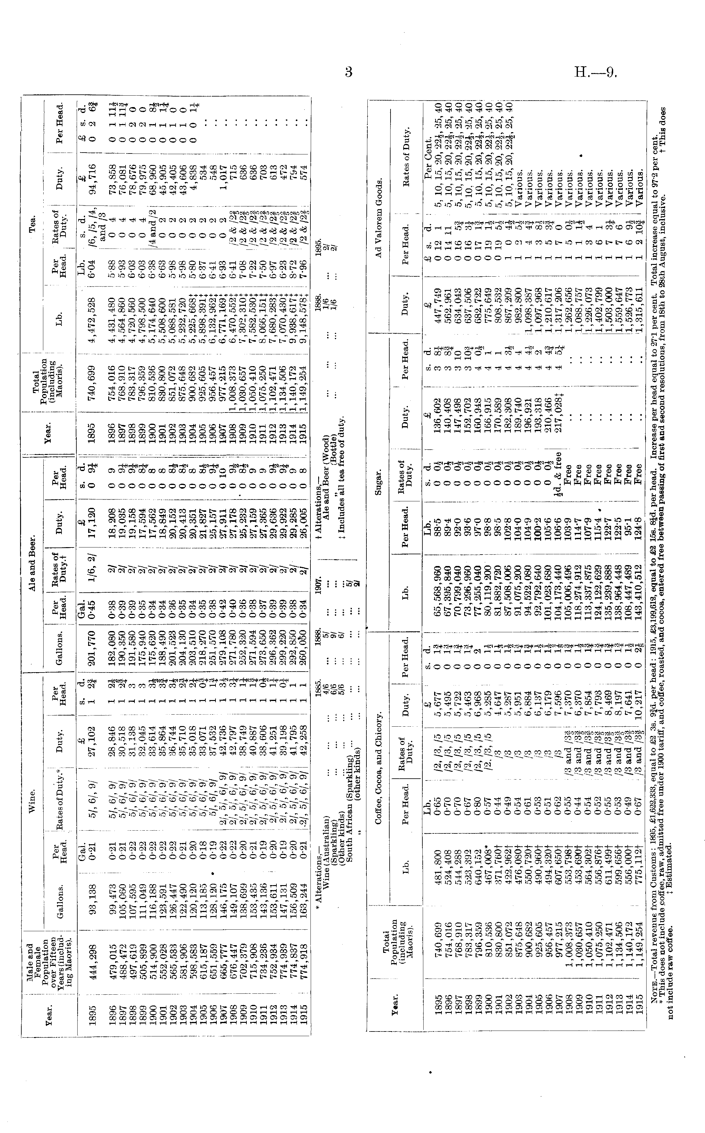 Year. | Total Population (including Maoris). Lb. Coffee, Cocoa, and Chicory. Per Head. E Q„t° f | Duty. Per Head. Per Head. E^ y oi Sugar. Duty. Per Head. Duty. Per Head. Ad Valorem Goods. Rates of Duty. Lb. 1895 1896 1897 1898 1899 1900 1901 1902 1903 1904 1905 1906 1907 1908 1909 1910 1911 1912 1913 1914 1915 740,699 754,016 768,910 783,317 796,359 810,536 830,800 851,072 875,648 900,682 925,605 956,457 977,215 1,008,373 1,030,657 1,050,410 1,075,250 1,102,471 1,134,506 1.140,172 1,149,254 481,800 524,408 544,288 523,392 640,152 467,008* 371,760t 422,962f 476,080f 550,720f 490,960f 494,320f 607,650f 553,798f 453,690t 564,302f 556,876t 611,499t 599,656f 556,0001 775,1121 Lb. 0-65 0-70 0-70 0-67 0-80 057 0-44 0-49 054 0-61 0-53 0-51 0-62 0-55 0-44 0-54 0-52 0-55 0-53 0-49 0-67 /2,/3, /5 12, IS, 15 12,13.15 1% IS, /5 12, IS, It 12. IS, It IS IS /3 /3 /3 /3 and /3| /3 and /3f /3 and /3§ /3 and /3f /3 and /3§ /3 and /3f /3 and /3| /3 and /3f £ 5,677 5,495 5,722 5,463 6,968 5,285 4,647 5,287 5,951 6,884 6,137 6,179 7,596 ; 7,370 j 6,370 7,854 7,793 8,469 8,197 7,641 10,217 s. d. 0 1} 0 If 0 1} 0 lj 0 2 0 lj 0 l| 0 l| 0 1| 0 1| 0 1J 0 li 0 l| 0 li 0 1J 0 1| 0 1J 0 1| 0 lj 0 li 0 2| 65,568,960 67,395,840 70,799,040 73,296,960 77,255,040 80,119,200 81,882,720 87,508,006 91,075,200 94,522,080 92,792,640 101,023,680 104,173,440 105,006,496 118,274,912 113,337,875 124,122,629 135,239,888 138,964,448 108,447,489 143,410,512 Lb. s. d. 88-5 0 0i 89-4 0 0* 92-0 0 0| 93-6 0 Oj 97-0 0 0i 98-8 0 0J 98-5 0 0i 102-8 0 0| 104-0 0 oi 104-9 0 0i 100-2 0 oi 105-6 0 0| 106-6 id. & free 103-9 Free 114-7 Free 107-9 Free 115-4 . Free 122-7 Free 122-5 Free 95-1 Free 124-8 Free ' £ 136,602 140,408 147,498 152,702 160,948 166,915 170,589 182,308 189,740 196,921 193,318 210,466 217,028} s. d. £ 3 8} 447,749 3 8| 562.961 3 10 634,043 3 10 j 637,506 4 0J 682,722 4 1 775,649 4 1 808,532 4 3i 867,209 4 4 982,800 4 4| 1,098,387 4 2 1,097,968 4 4| 1,210,617 4 5} 1,317,206 1,262,656 1,088,757 1,226,073 1,402,799 1,503,000 1,559,647 1,526,773 1,315,611 £ s. d. I Per Cent. 0 12 1 5, 10,15, 20, 22i, 25, 40 0 14 11 : 5, 10,15, 20, 22J, 25, 40 0 16 5| 5,10, 15, 20, 22|, 25, 40 0 16 3} 5,10, 15, 20, 22i, 25, 40; 0 17 1| 5,10, 15, 20, 22i,25, 401 0 19 l| 5,10, 15, 20, 22i, 25, 40 0 19 5J 5, 10,15, 20, 22i, 25, 40; 1 0 4} 5,10, 15, 20, 22J, 25, 40 1 2 5| Various. 1 4 4J Various. 1 3 8i Various. 1 5 3§ Various. 17 0 Various. 1 5 0J Various. 1 1 l| Various. . 13 4; Various. 16 1 Various. 17 3}; Various. 17 6: Various. 1 6 9i Various. 1 2 lOf I Various. Note.— Total revenue from Customs: 1895, £1,622,333, equal to £2 3s. 9|d, per head: 1915, £3,199,612, equal to £2 15s. 8Jd. per head. Increase per head equal to 27'1 per cent. Total increase equal to 97-2 per cent. * This does not include coffee, raw, admitted free under 1900 tariff, and coffee, roasted, and cocoa, entered free between passing of first and second resolutions, from 18th to 28th August, inclusive. t This does not include raw coffee. I Estimated.