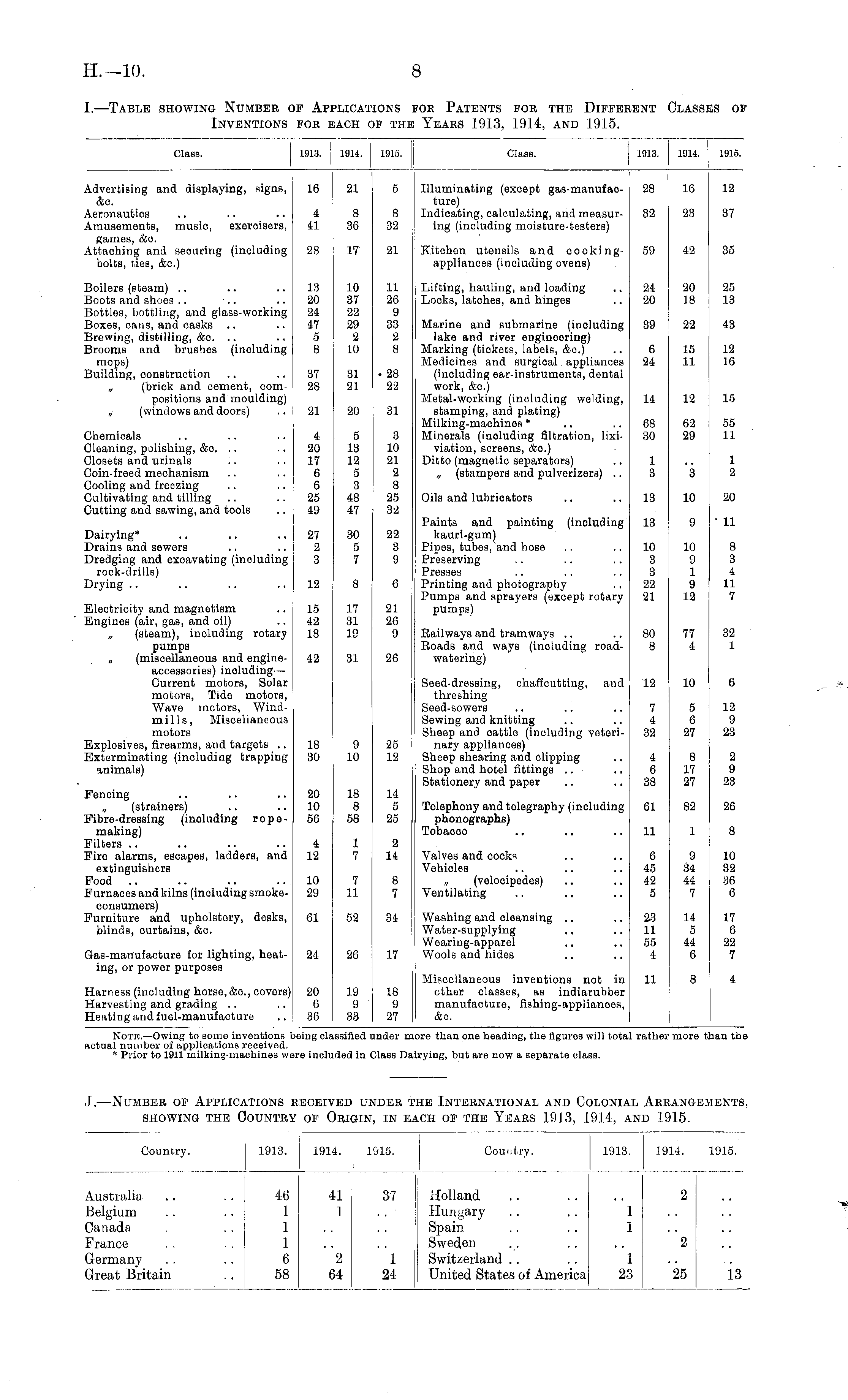 I. —Table showing Number of Applications for Patents for the Different Classes of Inventions for each of the Years 1913, 1914, and 1915.
