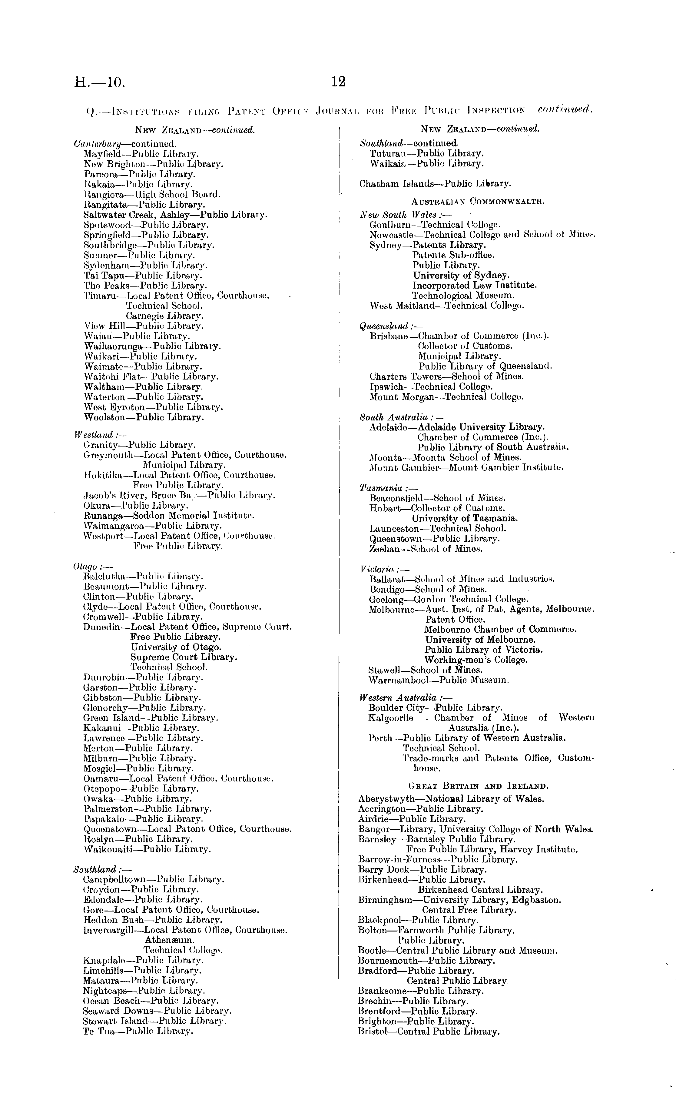 Q. —Institutions filing Patent Office Jotonal i-oi. Free Pubmc Inspection— co/ntinued. New Zealand— continued. New Zealand — continued. Canterbury —continued. Southland —continued. Mayliold—Public Library. Tuturau —Public Library. Now Brighton—Public Library. Waikaia —Public Library. Pareora—Public Library. Rakaia—Public Library. Chatham Islands—Public Library. Rangiora—High School Board. Rangitata-Public Library. Australian Common we altii. Saltwater Creek, Ashley —Public Library. New South Wales : — Spotswood—Public Library. Goulburu—Technical College. Springfield—Public Library. Newcastle—Technical College and School of Mines. Southbridgo—Public Library. Sydney—Patents Library. Sumner—Public Library. Patents Sub-office. Sydenham—-Public Library. Public Library. Tai Tapu—Public Library. University of Sydney. Tho Poaks—Public Library. Incorporated Law Institute. Timaru—Local Patent Office, Courthouse. • Technological Museum. Technical School. West Maitland—Tochnical College. Carnegie Library. View Hill—Public Library. Queensland : — Waiau—Public Library. Brisbane—-Chambor of Commerce (inc.). Waihaorunga—Public Library. Collector of Customs. Waikari—Public Library. Municipal Library. Waimate —Public Library. Public Library of Queensland. Waitohi Flat—Public Library. Charters Towers—School of Minos. Waltham —Public Library. Ipswich—Technical College. Watorton—Public Library. Mount Morgan—Tochnical College. Wost Eyreton—Public Library. Woolston—Public Library. South Australia : — Adelaide—Adelaide University Library. Westland : — Chamber of Commerce (Inc.). Granity—Public Library. Public Library of South Australia. Greymouth—Local Patont Office, Courthouse. Moonta—Moonta School of Minos. Municipal Library. Mount Gambier—Mount Gambier Institute. Hokitika—Local Patont Offico, Courthouse. Froo Public Library. Tasmania :— .Jacob's River, Bruce Bay— Public. Library. Beaconsliold—School of Mines. Okura—Public Library. Hobart—Collector of Oust oms. Runanga—Soddon Memorial Institute. University of Tasmania. Waimangaroa—Public Library. Launceston— Technical School. West-port—Local Patent Office, Courthouse. Queenstown—Public Library. Free Public Library. Zoehan--School of Mines. Otago .•— Victoria .-— Balolutha—Public Library. Ballarat—School of Mines and Industries. Beaumont—Public Library. Bondigo—School of Mines. Clinton—Public Library. Goelong—Gordon Tochnical College. Clyde—Local Patent Offico, Courthouse. Melbourne—Aust. Inst, of Pat. Agents, Melbourne. Cromwell—Public Library. Patont Office. Dunedin—Local Patent Office, Supreme Court. Molboumo Chamber of Commerce. Free Public Library. University of Melbourne. University of Otago. p uWic Library of Victoria. Supreme Court Library. Working-mon's College. Tochnical School. Stawell—School of Minos. Diinrobm—Public Library. Warrnambool—Public Museum. Garston—-Public Library. Gibbston—Public Library. Western Australia :— Glenorchy—Public Library. Boulder City—Public Library. Green Island—Public Library. Kalgoorlio — Chamber of Mines of Western Kakanui—Public Library. Australia (Inc.). Lawrenco—Public Library. Perth—Public Library of Western Australia. Morton—Public Library. Tochnical School. Milburn—Public Library. Trade-marks and Patents Office, CustomMosgiel—Public Library. house. Oamaru—Local Patont Office, Courthouse. Otopopo—Public Library. ©MAT Britain and Ireland. Owaka—Public Library. Aberystwyth—National Library of Wales. Palnierston—Public Library. Accrington—Public Library. Papakaio—-Public Library. Airdrie—Public Library. Quoonstown —Local Patont Office, Courthouse. Bangor—Library, University College of North Wales. Roslyn—Public Library. Barnsley—Barnslcy Public Library. Waikouaiti—Public Library. Free Public Library, Harvey Institute. Barrow-in-Furness —Public Library. Southland : —■ Barry Hock —Public Library. Campbolltown—Public Library. Birkenhead—Public Library. Croydon—Public Library. Birkenhead Central Library. Edondalo—Public Library. Birmingham—University Library, Edgbaston. Goro—-Local Patent Office, Courthouse. Central Free Library. Hoddon Bush—Public Library. Blackpool —Public Library. Invorcargill—Local Patont Office, Courthouse. Bolton—Farnworth Public Library. Athenseum. Public Library. Technical College. Bootle—Central Public Library and Museum. Knapdalo—Public Library. Bournemouth—Public Library. Limohills—Public Library. Bradford—Public Library. Mataura —Public Library. Central Public Library. Nightcaps—Public Library. Branksome—Public Library. Ocean Boach—Public library, Brechin —Public Library. Seaward Downs—Public Library. Brentford —Public Library. Stewart Island—Public Library. Brighton—Public Library. Te Tua—-Public Library. Bristol—Central Public Library.