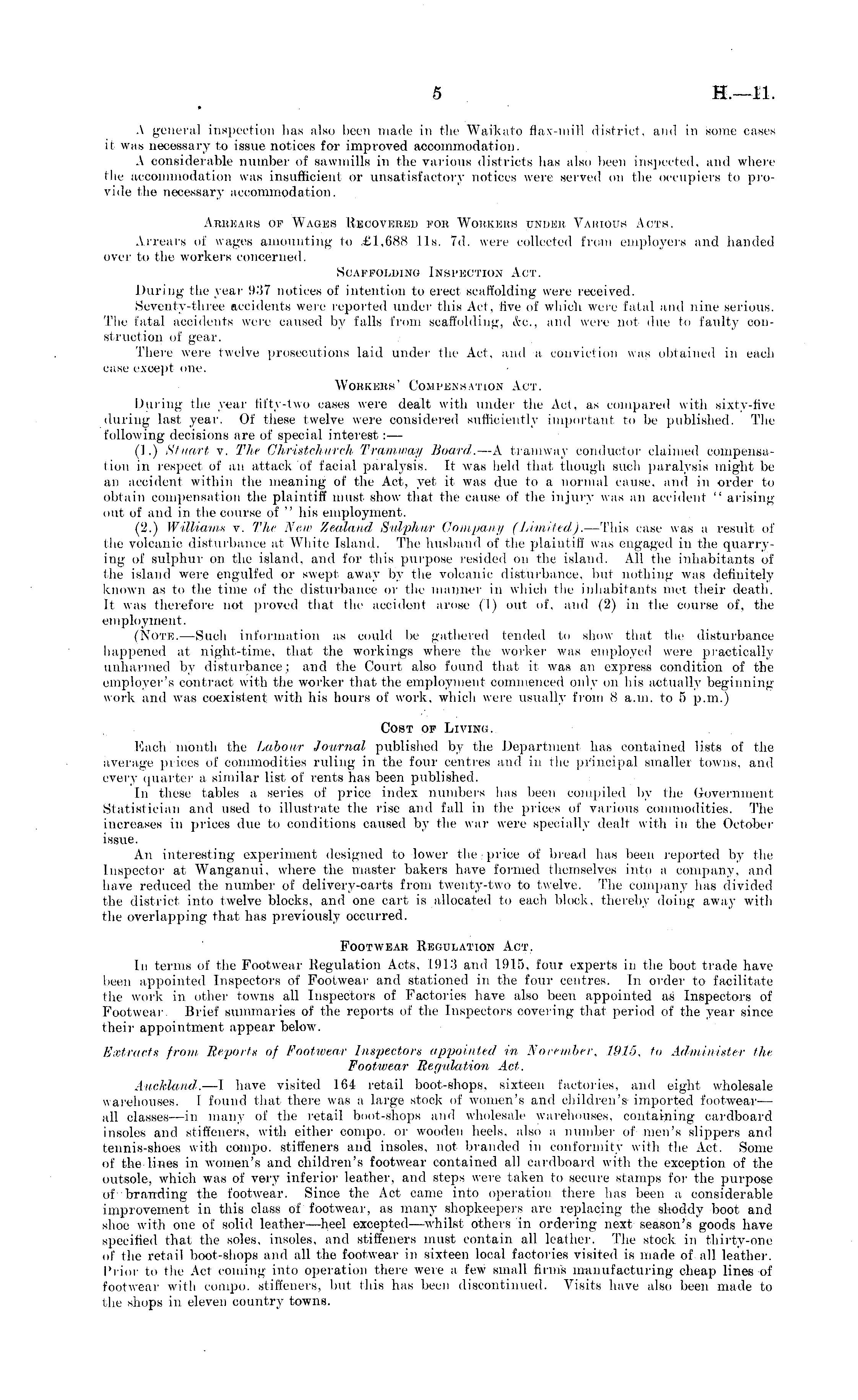 A general inspection has also been made in the Waikato flax-mill district', and in sonic cases it was necessary to issue notices for improved accommodation. A considerable number of sawmills in the various districts has also been inspected, anil where tin;' accommodation was insufficient or unsatisfactory notices were served on the occupiers to provide the necessary accommodation. Arrears of Wages Uecoverkd for Workers under Various Acts. Arrears of wages amounting lo .£1,688 lis. 7d. were collected from employers and handed over to the workers concerned. Scaffolding Inspection Act. During the year 937 notices of intention to erect scaffolding were received. Seventy-three accidents were reported under this Act, live of which were fatal anil nine serious. The fatal accidents were caused by falls from scaffolding, &v... and were not due to faulty construction of gear. There were twelve prosecutions laid under the Act, and a conviction was obtained in each case except one. Workers' Compensation Act. During the year lil'ty-two cases were dealt with under the Act. as compared with sixty-five during last year. Of these twelve were considered sufficiently important to be published. The following decisions are of special interest : — (I.) Stuart v. The Ghristchurch Tramway Board. —A tramway conductor claimed compensation in respect of an attack of facial paralysis. It was held that though such paralysis might be an accident within the meaning of the Act. yet it was due to a normal cause, and in order to obtain compensation the plaintiff must show that the cause of the injury was an accident " arising out of and in the course of " his employment. (2.) Williams v. The New Zealand Sulphur Company (Limited). —This case was a result of the volcanic disturbance at White Island. The husband of the plaintiff was engaged in the quarrying of sulphur on the island, and for this purpose resided on the island. All the inhabitants of the island were engulfed or swept away by the volcanic disturbance, but nothing was definitely known as to the time of the disturbance or the manner in which the inhabitants met their death. It was therefore not proved that the accident arose (I) out of, and (2) in the course of, the employment. (Note. —Such information as could be gathered tended to show that the disturbance happened at night-time, that the workings where the worker was employed were practically unharmed by disturbance; and the Court also found that it was an express condition of the employer's contract with the worker that the employment commenced only on his actually beginning work and was coexistent, with his hours of work, which were usually from 8 a.m. to 5 p.m.) Cost of Living. Each month the Labour Journal published by the Department has contained lists of the average prices of commodities ruling in the four centres and in the principal smaller towns, ami every quarter a similar list of rents has been published. In these tables a series of price index numbers has been compiled by (he Government Statistician and used to illustrate the rise and fall in the prices of various commodities. The increases in prices due to conditions caused by the war were specially dealt with in the October issue. An interesting experiment designed to lower the price of bread has been reported by the Inspector at Wanganui, where the master bakers have formed themselves into a company, and have reduced the number of delivery-carts from twenty-two to twelve. The company has divided the district into twelve blocks, and one cart is allocated to each block, thereby doing away with the overlapping that has previously occurred. Footwear Regulation Act. In terms of the Footwear Regulation Acts, 191.'! and 1915, four experts in the boot trade have been appointed Inspectors of Footwear and stationed in the four centres. In order to facilitate the work in other towns all Inspectors of Factories have also been appointed as Inspectors of Footwear. Brief summaries of the reports of the Inspectors covering that period of the year since their appointment appear below. Extracts front Reports of Footwear Inspectors appointed in November, 1915, to Administer the Footwear Regulation Act. Auckland. —I have visited 164 retail boot-shops, sixteen factories, and eight wholesale warehouses. 1 found that there was a large stock of women's and children's imported footwear— all classes —in many of the retail boot-shops and wholesale warehouses, containing cardboard insoles and stifieners, with either compo. or wooden heels, also a number of men's slippers ami tennis-shoes with compo. stiffeners and insoles, not branded in conformity with the Act. Some of the lines in women's and children's footwear contained all cardboard with the exception of the outsole, which was of very inferior leather, and steps were taken to secure stamps for the purpose of branding the footwear. Since the Act came into operation there has been a considerable improvement in this class of footwear, as many shopkeepers arc replacing the shoddy boot and shoe with one of solid leather —heel excepted—whilst others in ordering next season's goods have specified that the soles, insoles, and stiffeners must contain all leather. The slock in thirty-one of the retail boot-shops and all the footwear in sixteen local factories visited is made of all leather. Prior to the Act coming into operation there were a few small firms manufacturing cheap lines of footwear with compo. stiffeners, but this has been discontinued. Visits have also been made to the shops in eleven country towns.
