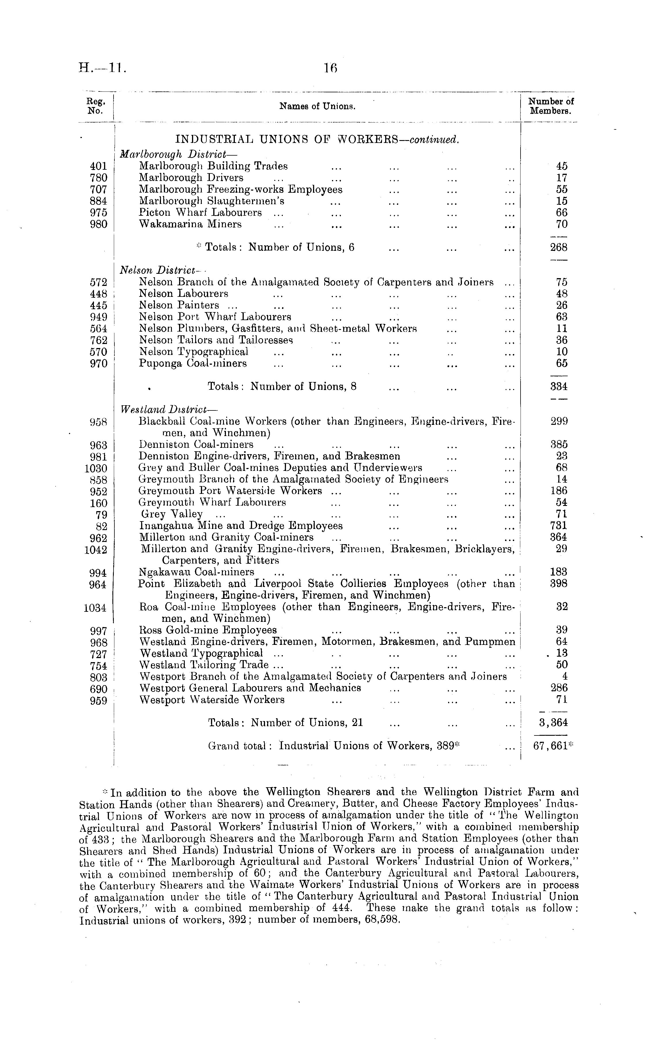 *In addition to the above the Wellington Shearers and the Wellington District Farm and Station Hands (other than Shearers) and Creamery, Butter, and Cheese Factory Employees' Industrial Unions of Workers are now in process of amalgamation under the title of "The Wellington Agricultural and Pastoral Workers' Industrial Union of Workers," with a combined membership of 433 ; the Marlborough. Shearers and the Marlborough Farm and Station Employees (other than Shearers and Shed Hands) Industrial Unions of Workers are in process of amalgamation under the title of " The Marlborough Agricultural and Pastoral Workers' Industrial Union of Workers," with a combined membership of 60; and the Canterbury Agricultural and Pastoral Labourers, the Canterbury Shearers and the Waimate Workers' Industrial Unions of Workers are in process of amalgamation under the title of "The Canterbury Agricultural and Pastoral Industrial Union of Workers," with a combined membership of 444. These make the grand totals as follow : Industrial unions of workers, 392; number of members, 68,598.