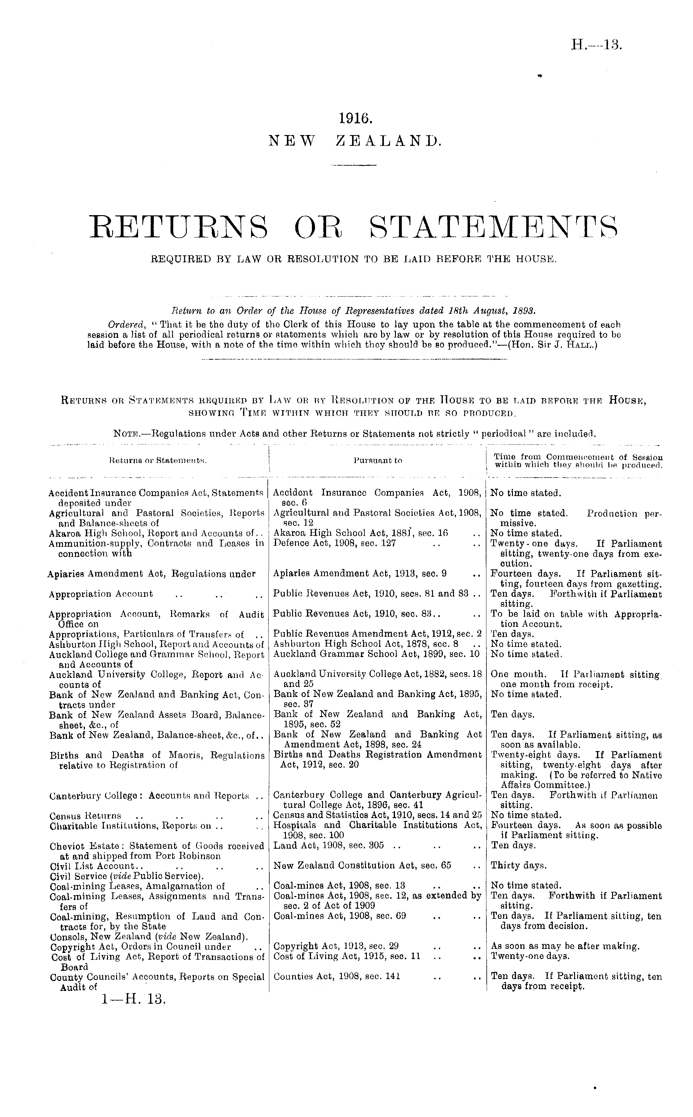 Note. —Regulations under Acts and other Returns or Statements not strictly " periodical " are included. Returns or Statements. Pursuant to \ °' S f** io ? within which they should lie produced. Acoident Insurance Companioa Act, Statements Accidont Insurance Companies Act, 1908, No time stated. deposited under sec. 6 Agricultural and Pastoral Societies, Reports Agricultural and Pastoral Societios Act, 1908, No time stated. Production perand Balance-sheets of sec. 1.2 missive. Akaroa High School, Report and Accounts of.. Akaroa High School Act, 188]', sec. 16 .. No time stated. Ammunition-supply, Contracts and Loases in Defence Aot, 1908, sec. 127 .. .. Twenty-one days. If Parliament connection with sitting, twenty-one days from execution. Apiaries Amendment Aot, Regulations under Apiaries Amendment Act, 1913, seo. 9 .. Fourteen days. If Parliament sitting, fourteen days from gazetting. Appropriation Account .. .. .. Public Revenues Act, 1910, sees. 81 and 83 .. Ten days. Forthwith if Parliament sitting. Appropriation Account, Remarks of Audit Public Revenues Act, 1910, seo. 83.. .. To be laid on table with AppropriaOffice on tion Account. Appropriations, Particulars of Transfers of .. Public Revenues Amendment Act, 1912, sec. 2 Ten days. Ashburton High School, Report and Accounts of Ashburton High School Act, 1878, sec. 8 .. No time stated. Auckland College and Grammar School, Report Auckland Grammar School Act, 1899, sec. 10 No time stated. and Accounts of Auckland University College, Report and Ac- AuoklandUnivorsity College Act, 1882, sees. 18 One month. If Parliament sitting counts of and 25 one month from roceipt. Bank of New Zealand and Banking Act, Con- Bank of New Zealand and Banking Act, 1895, No time stated. tracts under seo. 37 Bank of New Zealand Assets Board, Balance- Bank of Now Zealand and Banking Act, Ten days. sheet, &c, of 1895, see. 52 Bank of New Zealand, Balance-sheet, &c, of.. Bank of New Zealand and Banking Act Ten days. If Parliament sitting, as Amendment Act, 1898, seo. 24 soon as available. Births and Deaths of Maoris, Regulations Births and Deaths Registration Amendment Twenty-eight days. If Parliament relative to Registration of Act, 1912, seo. 20 sitting, twentyeight days aftermaking. (To be referred to Nativo Affairs Committee.) Canterbury College : Aocounts and Reports .. Canterbury Colloge and Canterbury Agricul- Ten days. Forthwith if Parliamon tural College Act, 1896, seo. 41 sitting. Census Returns .. .. .. .. Census and Statistics Act, 1910, sees. 14 and 25 No time stated. Charitable Institutions, Reports on .. ,. Hospitals and Charitable Institutions Act, Fourteendays. As soon as possible 1908, seo. 100 if Parliament sitting. Cheviot Estate : Statement of Goods received Land Act, 1908, sec. 305 .. .. .. Ten days. at and shipped from Port Robinson Civil List Account.. .. .. .. New Zealand Constitution Aot, sec. 65 .. Thirty days. Civil Service (vide Public Service). Coal-mining Leases, Amalgamation of .. Coal-mines Act, 1908, sec. 13 .. .. No time stated. Coal-mining Leases, Assignments and Trans- Coal-minea Aot, 1908, see. 12, as extended by Ten days. Forthwith if Parliament fers of seo. 2 of Aot of 1909 sitting. Coal-mining, Resumption of Land and Con- Coal-mines Aot, 1908, sec. 69 .. .. Ton days. If Parliament sitting, ten tracts for, by tho State days from decision. Consols, New Zealand (vide New Zealand). Copyright Act, Orders in Counoil under .. Copyright Act, 1913, sec. 29 .. .. As soon as may be after making. Cost of Living Act, Report of Transactions of Cost of Living Act, 1915, seo. 11 .. .. Twenty-one days. Board County Councils' Accounts, Reports on Special Counties Act, 1908, seo. 141 .. .. Ten days. If Parliamont sitting, ten Audit of days from receipt.