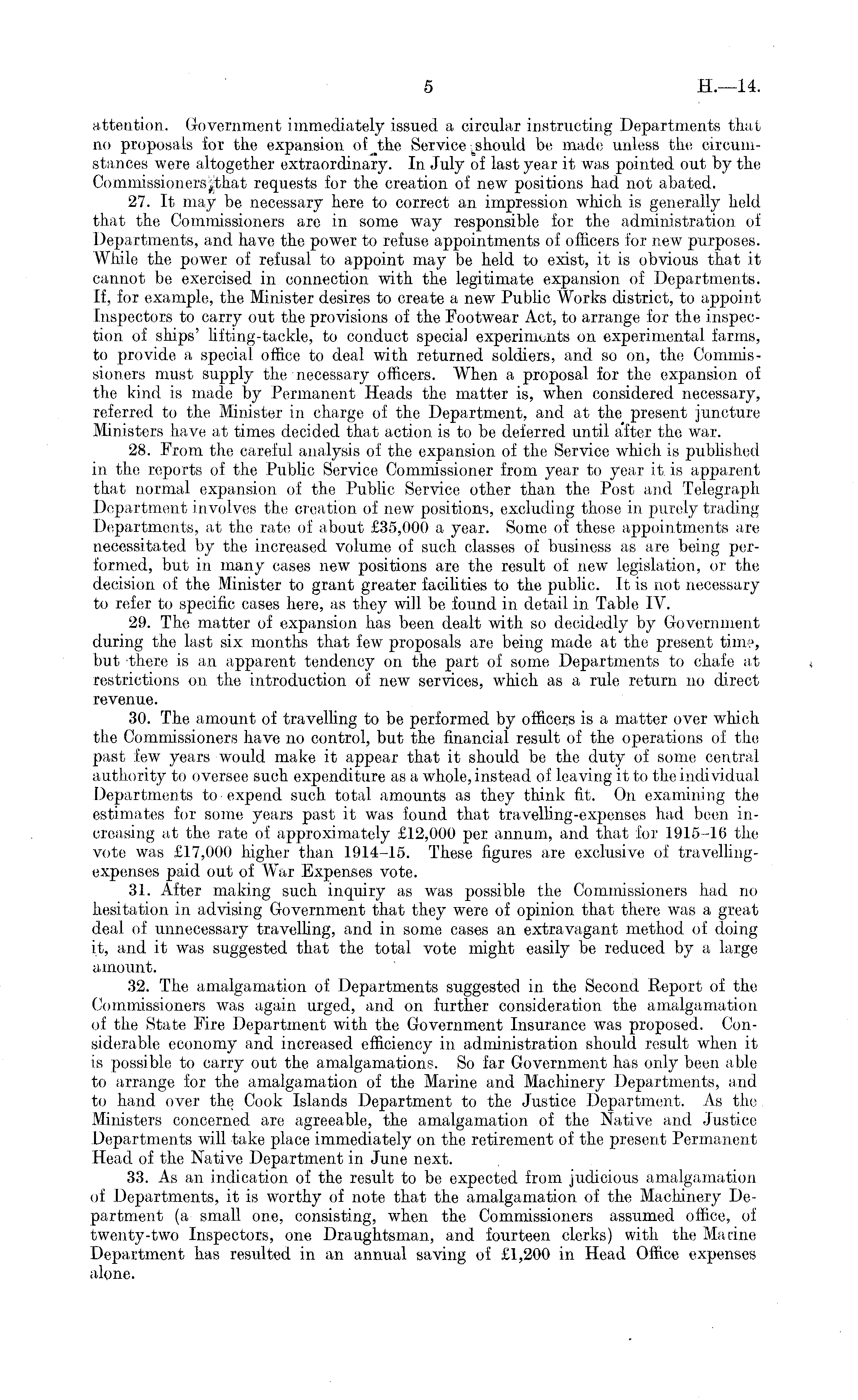 attention. Government immediately issued a circular instructing Departments that no proposals for the expansion of Jdie Service be made unless the circumstances were altogether extraordinary. In July of last year it was pointed out by the Commissionersj'that requests for the creation of new positions had not abated. 27. It may be necessary here to correct an. impression which is generally held that the Commissioners are in some way responsible for the administration, of Departments, and have the power to refuse appointments of officers for new purposes. While the power of refusal to appoint may be held to exist, it is obvious that it cannot be exercised in connection with the legitimate expansion of Departments. If, for example, the Minister desires to create a new Public Works district, to appoint Inspectors to carry out the provisions of the Footwear Act, to arrange for the inspection of ships' lifting-tackle, to conduct special experiments on experimental farms, to provide a special office to deal with returned soldiers, and so on, the Commissioners must supply the necessary officers. When a proposal for the expansion of the kind is made by Permanent Heads the matter is, when considered necessary, referred to the Minister in charge of the Department, and at the present juncture Ministers have at times decided that action is to be deferred until after the war. 28. From the careful analysis of the expansion of the Service which is published in the reports of the Public Service Commissioner from year to year it. is apparent that normal expansion of the Public Service other than the Post and Telegraph Department involves the creation of new positions, excluding those in purely trading Departments, at the rate of about £35,000 a year. Some of these appointments are necessitated by the increased volume of such classes of business as are being performed, but in many cases new positions are the result of new legislation, or the decision of the Minister to grant greater facihties to the public. It is not necessary to refer to specific cases here, as they will be found in detail in Table IV. 29. The matter of expansion has been dealt with so decidedly by Government during the last six months that few proposals are being made at the present time, but there is an apparent tendency on the part of some Departments to chafe at restrictions on. the introduction of new services, which as a rule return no direct revenue. 30. The amount of travelling to be performed by officers is a matter over which the Commissioners have no control, but the financial result of the operations of the past few years would make it appear that it should be the duty of some central authority to oversee such expenditure as a whole, instead of leaving it to the individual Departments to expend such total amounts as they think fit. On examining the estimates for some years past it was found that travelling-expenses had been increasing at the rate of approximately £12,000 per annum, and that for 1915-16 the vote was £17,000 higher than 1914-15. These figures are exclusive of travellingexpenses paid out of War Expenses vote. 31. After making such inquiry as was possible the Commissioners had no hesitation in. advising Government that they were of opinion, that there was a great deal of unnecessary travelling, and in some cases an extravagant method of doing it, and it was suggested that the total vote might easily be reduced by a large amount. 32. The amalgamation of Departments suggested in the Second Report of the Commissioners was again urged, and on further consideration the amalgamation of the State Fire Department with the Government Insurance was proposed. Considerable economy and increased efficiency in administration should result when it is possible to carry out the amalgamations. So far Government has only been able to arrange for the amalgamation of the Marine and Machinery Departments, and to hand over the Cook Islands Department to the Justice Department. As the. Ministers concerned are agreeable, the amalgamation of the Native and Justice Departments will take place immediately on. the retirement of the present Permanent Head of the Native Department in June next. 33. As an indication of the result to be expected from judicious amalgamation of Departments, it is worthy of note that the amalgamation of the Machinery Department (a small one, consisting, when the Commissioners assumed office, of twenty-two Inspectors, one Draughtsman, and fourteen clerks) with the Marine Department has resulted in an annual saving of £1,200 in Head Office expenses alone.