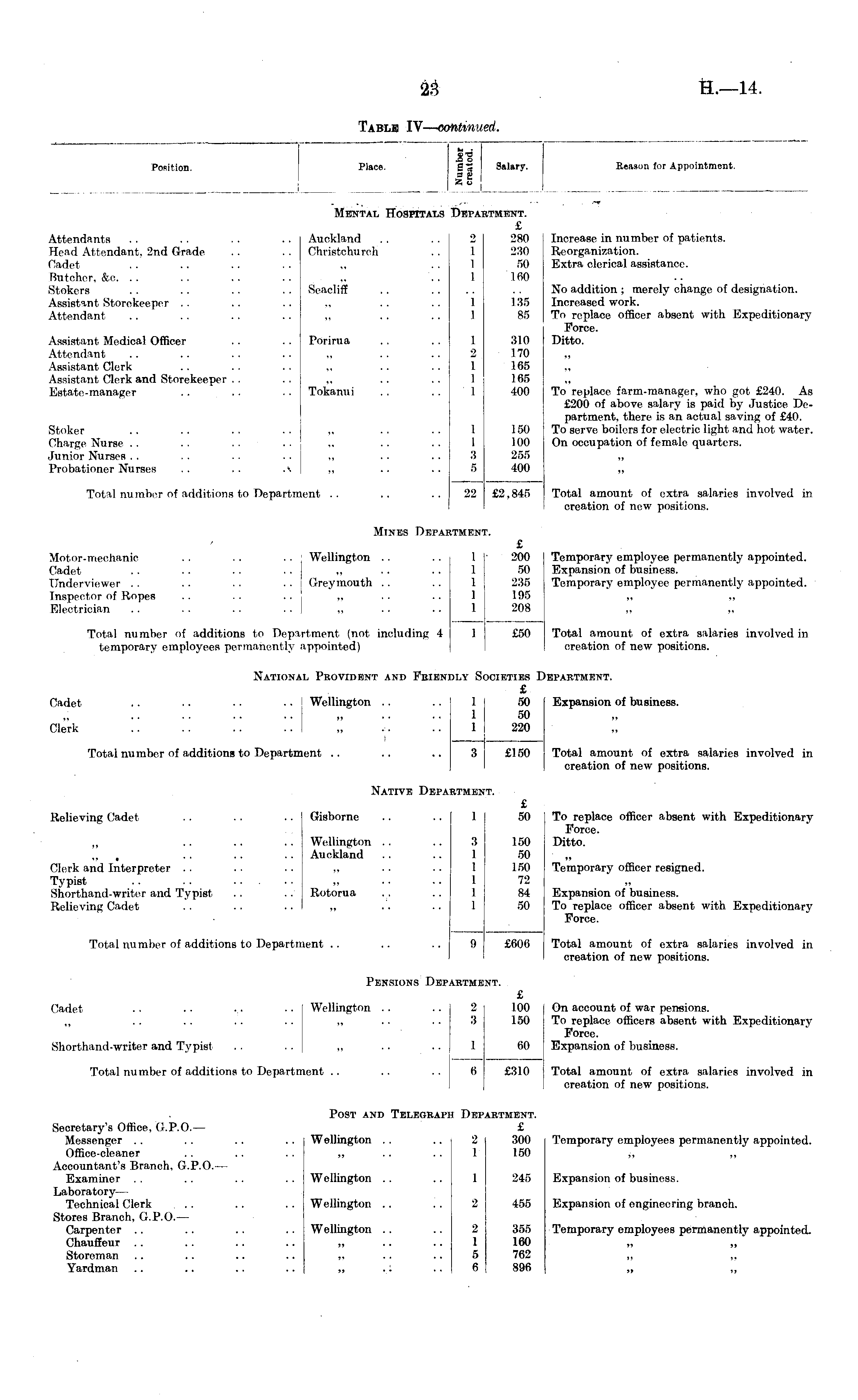 II Position Place. Sa Salary. Benson for Appointment. *J Benson for Appointment. Mental Hospitals Department. £ Attendants . . . . . . .. Auckland . . .. 2 280 Increase in number of patients. Head Attendant, 2nd Grade .. .. Christchurch . . 1 230 Reorganization. Cadet .. .. .. ■• .. ..1 50 Extra clerical assistance. Butcher, &c. . . . . .. .. ,. 1 100 Stokers . . . . .. .. Seacliff .. .. .. . . No addition; merely change of designation. Assistant Storekeeper .. .. .. „ . . .. 1 135 Increased work. Attendant .. .. . . .. ,, . . . . I 85 To replace officer absent with Expeditionary Force. Assistant Medical Officer .. . . Porirua . . . . 1 310 Ditto. Attendant .. .. .. .. „ . . . . 2 170 Assistant Clerk .. .. .. ,, .. .. 1 165 Assistant Clerk and Storekeeper . . .. ,, .. .. 1 165 Estate-manager ... .. .. Tokanui .. .. 1 400 To replace farm-manager, who got £240. As £200 of above salary is paid by Justice Department, there is an actual saving of £40. Stoker .. .. .. .. „ .. .. I 150 To servo boilers for electric light and hot water. Charge Nurse .. .. .. .. „ .. .. 1 100 On occupation of female quarters. Junior Nurses . . . . .. .. ,, . . . . 3 255 ,, Probationer Nurses . . .. .\ „ .. .. 5 400 „ 5 Total number of additions to Department .. .. .. 22 £2,845 Total amount of extra salaries involved in creation of now positions. 22 £2,845 Mines Department. tTMENI r. £ £ 200 50 235 195 208 Motor-mechanic .. .. .. Wellington .. .. 1 ' 200 Temporary employee permanently appointed. Cadet .. .. .. . • ,, . . .. 1 50 Expansion of business. Tlndervicwer . . .. . . . . Greymouth .. .. 1 235 Temporary employee permanently appointed. Inspector of Ropes .. .. .. „ .. ..1 195 „ „ Electrician .. . . . . .. „ .... 1 208 Total number of additions to Department (not including 4 1 £50 Total amount of extra salaries involved in temporary employees permanently appointed) creation of new positions. 1 £50 National Provident and Friendly Societies Department. £ Cadet . . .. .. . - I Wellington .. .. 1 50 Expansion of business. .... | „ .. ..1 50 Clerk .. .. .. ..I „ .:. ..1 220 ILY Si 1 1 1 L1CIETIES D £ 50 50 220 Total numbor of additions to Department .. .. .. 3 £150 Total amount of extra salaries involved in creation of new positions. £150 Native Department. rr. itme: £ Relieving Cadet .. . . .. Gisborne .. .. 1 50 To replace officer absent with Expeditionary Force. .. Wellington . . .. 3 150 Ditto. ,, , . . .. .. Auckland .. .. 1 50 „ Clerk and Interpreter . . .. . . ,, . . .. 1 150 Temporary officer resigned. Typist .. . . „ • • .. 1 72 Shorthand-writer and Typist .. .. Rotorua .. .. 1 84 Expansion of business. Relieving Cadet .. .. .. „ .'. .. 1 50 To replace officer absent with Expeditionary Force. 1 £ 50 3 150 50 150 72 84 50 Total number of additions to Department .. .. .. 9 £606 Total amount of extra salaries involved in creation of new positions. 9 Pensions Department. I.TM £ Cadet .. .. .,. •• Wellington .. .. 2 100 On account of war pensions. ,, .. .. .', .. „ .. .. 3 150 To replace officers absent with Expeditionary Force. Shorthand-writer and Typist .. . . ,, .. .. 1 60 Expansion of businoss. Total number of additions to Department .. .. .. 6 £310 Total amount of extra salaries involved in creation of new positions. 2 3 1 6 Post and Telegraph Department. Secretary's Office, G.P.O. — £ Messenger .. .. .. .. Wellington . . .. 2 300 Temporary employees permanently appointed. Office-cleaner .. .. .. „ .. ..1 150 ,, ,, Accountant's Branch, G.P.O. — Examiner .. .. .. .. Wellington . . .. 1 245 Expansion of business. Laboratory— Technical Clerk ... .. .. Wellington .. .. 2 455 Expansion of engineering branch. Stores Branch, G.P.O.— Carpenter .. .. .. .. Wellington .. .. 2 355 Temporary employees permanently appointed. Chauffeur .. .. .. .. „ .. ..1 160 Storeman .. .. .. .. ,. .. 5 762 Yardman .. .. .. .. „ .1 .. 6 896 „ ,, Dep, 2 1 1 2 2 1 5 6