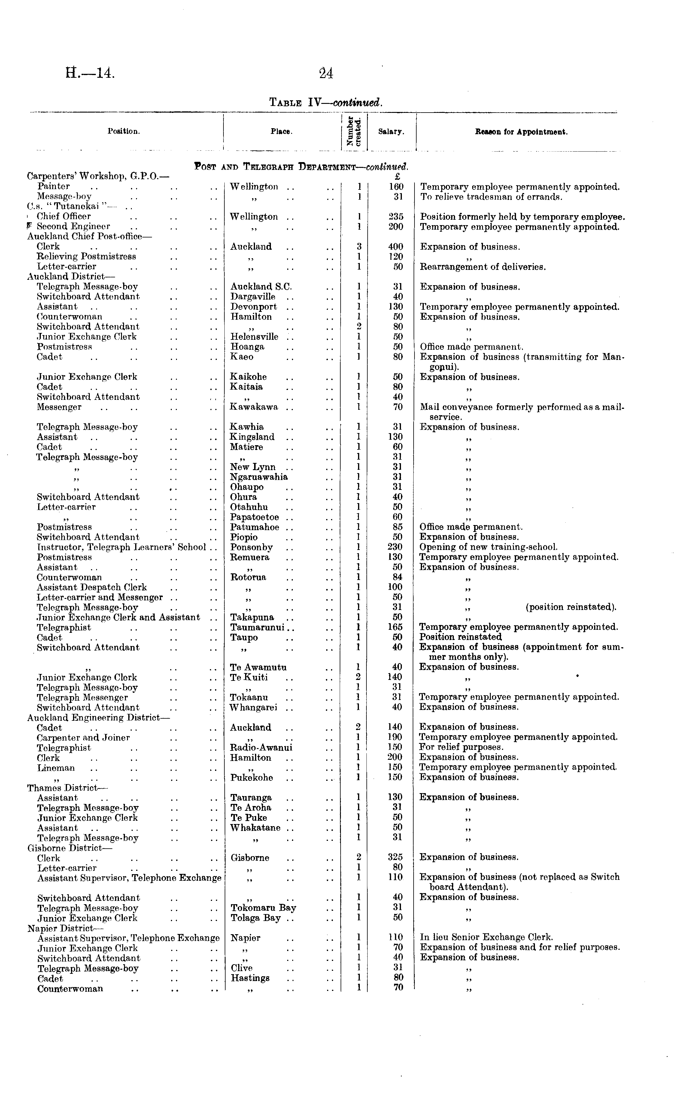 Position. Place. Si 11 IS Salary. Reuon for Appointment. i Post and Telegraph Departm: Carpenters'Workshop, G.P.O.— Painter .. .. . . .. Wellington Message-boy . . . . . . ,, C.s. "Tutanekai " — .. Chief Officer .. .. .. Wellington . . * Second Engineer .. . . .. „ Auckland Chief Post-office — Clerk .. .. . . . . Auckland Relieving Postmistress .. . . ,, Letter-carrier .. .. .. „ Auckland District— Telegraph Message-boy .. .. Auckland S.C. Switchboard Attendant .. .. Dargaville Assistant .. .. .. . . Devonport Counterwoman . . . . .. Hamilton Switchboard Attendant . . . . „ Junior Exchange Clerk . . . . Helensville Postmistress .. .. . . Hoanga Cadet .. .. .. . . Kaeo !NT —COyniinned. £ 160 Temporary employee permanently appointed. 31 To relieve tradesman of errands. 235 Position formerly held by temporary employee 200 Temporary employee permanently appointed. 400 Expansion of business. 120 50 Rearrangement of deliveries. Junior Exchange Clerk .. .. Kaikohe Cadet .. .. . . .. Kaitaia Switchboard Attendant Messenger .. .. .. . . Kawakawa Telegraph Mossage-boy .. .. Kawhia Assistant .. .. .. .. Kingsland Cadet .. .. .. .. Matiere Telegraph Mossage-boy .. .. „ „ .. .. .. New Lynn .. ,, .. .. .. Ngaruawahia ,, .. , . .. Ohaupo Switchboard Attendant .. .. Ohura Letter-carrier . . .. .. Otahuhu „ .. .. .. Papatoetoe Postmistress . . .. .. Patumahoe Switchboard Attendant .. .. Piopio Instructor, Telegraph Learners' School . . Ponsonby Postmistress .. .. .. Romuera Assistant .. .. .. .. „ Counterwoman .. .. .. Rotorua Assistant Despatch Clerk .. .. ,, Letter-carrior and Messenger .. .. „ Telegraph Message-boy .. .. ,, Junior Exchange Clerk and Assistant .. Takapuna Telegraphist .. .. .. Taumarunui Cadet . . .. .. .. Taupo Switchboard Attendant .. .. ,, 31 Expansion of business. 40 130 Temporary employee permanently appointed. 50 Expansion of business. 80 50 50 Office made permanent. 80 Expansion of business (transmitting for Man gopui). 50 Expansion of business. 80 40 70 Mail conveyance formerly performed as a mail, service. 31 Expansion of business. 130 60 31 31 31 31 40 50 60 85 Office made permanent. 50 Expansion of business. 230 Opening of new training-school. 130 Temporary employee permanently appointed. 50 Expansion of business. 84 100 50 31 „ (position reinstated). 50 165 Temporary employee permanently appointed. 50 Position reinstated 40 Expansion of business (appointment for summer months only). 40 Expansion of business. 140 31 31 Temporary employee permanently appointed. 40 Expansion of business. ,, .. Te Awamutu Junior Exchange Clork . . Te Kuiti Telegraph Message-boy .. .. ,, Telegraph Messenger .. .. Tokaanu Switchboard Attendant . . . . Whangarei Auckland Engineering District — Cadet . . .. .. .. Auckland Carpenter and Joiner .. .. ,, Telegraphist .. . . .. Radio-Awanui Clerk .. .. .. .. Hamilton Lineman .. .. .. .. „ „ .. . . .. . . Pukekohe Thamos District— Assistant .. .. .. .. Tauranga Telegraph Message-boy .. Te Aroha Junior Exchange Clerk .. Te Puke Assistant .. . . .. .. Whakatane Telegraph Message-boy .. .. „ Gisborne District — Clerk .. .. .. .. Gisborne Letter-carrier .. .. .. ,, Assistant Supervisor, Telephone Exchange ,, 140 Expansion of business. 190 Temporary employee permanently appointed. 150 For rolief purposes. 200 Expansion of business. 150 Temporary employee permanently appointed. 150 Expansion of business. 130 Expansion of business. 31 50 50 31 325 Expansion of business. 80 110 Expansion of business (not replaced as Switch board Attendant). 40 Expansion of business. 31 50 Switchboard Attendant . . . . ,, Telegraph Message-boy . . . . Tokomaru Bay Junior Exchange Clerk .. .. Tolaga Bay Napier District — Assistant Supervisor, Telephone Exchange Napier Junior Exchango Clerk .. .. ,, Switchboard Attendant .. .. ,, Telegraph Message-boy .. .. Clive Cadet .. .. .. . . Hastings Counterwoman .. .. .. „ 110 In liou Senior Exchange Clerk. 70 Expansion of businoss and for relief purposes. 40 Expansion of business. 31 80 70