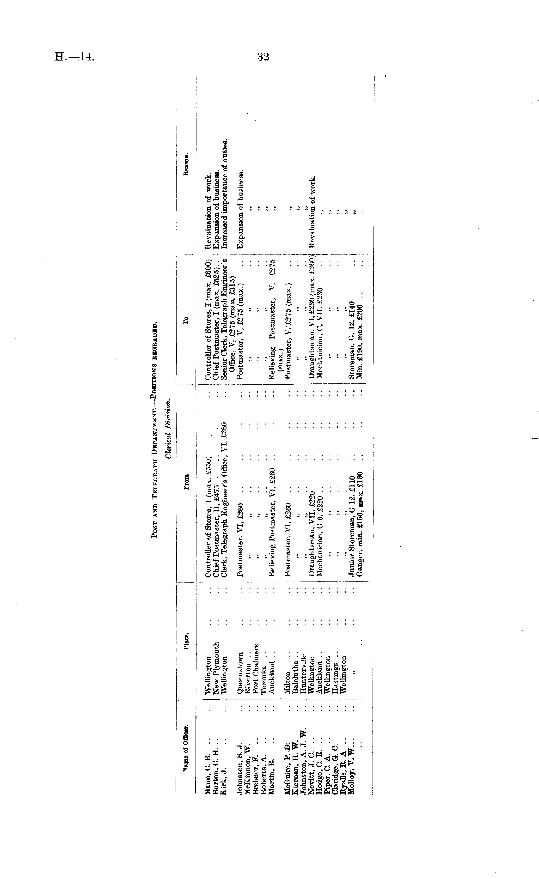 Clerical Division. Name of Officer. ! Place. Place. From From To Reaso». To Mann, C. B. Burton, C. H. .. Kirk, J. Johnston, S. J. McKinnon, W. Brebner, F. Roberts, A. Martin, R. Wellington New Plymouth Wellington Queenstown Riverton . . Port Chalmers Temuka .. Auckland . . Milton Balclutha .. Hunterville Wellington Auckland .. Wellington Hastings . . Wellington I Controller of Stores, I (max. £550) . .. .. Chief Postmaster, II, £47.5 .. Clerk, Telegraph Engineers Office, VI. £260 .. Postmaster, VI, £260 Relieving Postmaster, VI, £260 . . .. Postmaster, VI, £260 .. .. Draughtsman, VII, £220 .. Mechanician, G 6, £220 Junior Storeman, G 12, £110 Ganger, min. £150, max. £180 i Controller of Stores, I (max. £600) Revaluation of work. Chief Postmaster, I (max. £525).. Expansion of business. Senior Clerk. Telegraph Engineer's Increased importance of duties. Office, V, £275 (mass. £315) Postmaster, V, £275 (max.) .. Expansion of business. Relieving Postmaster, V, £275 ,, (max.) Postmaster, V, £275 (max.) .. „ Draughtsman, VI, £230 (max. £260) Revaluation of work. .. Mechanician, C, VII, £230 .. Storeman. G. 12, £140 .. ,', .. Min. £190, max. £200 .. McGuire, P. D. Kiernan, H. W. Johnston, A. J. W. Nevitt, J. C. Hodge, C. E. Piper, C. A. Claridge, G. C. Ryalls. R, A. .. Molloy, V.W...