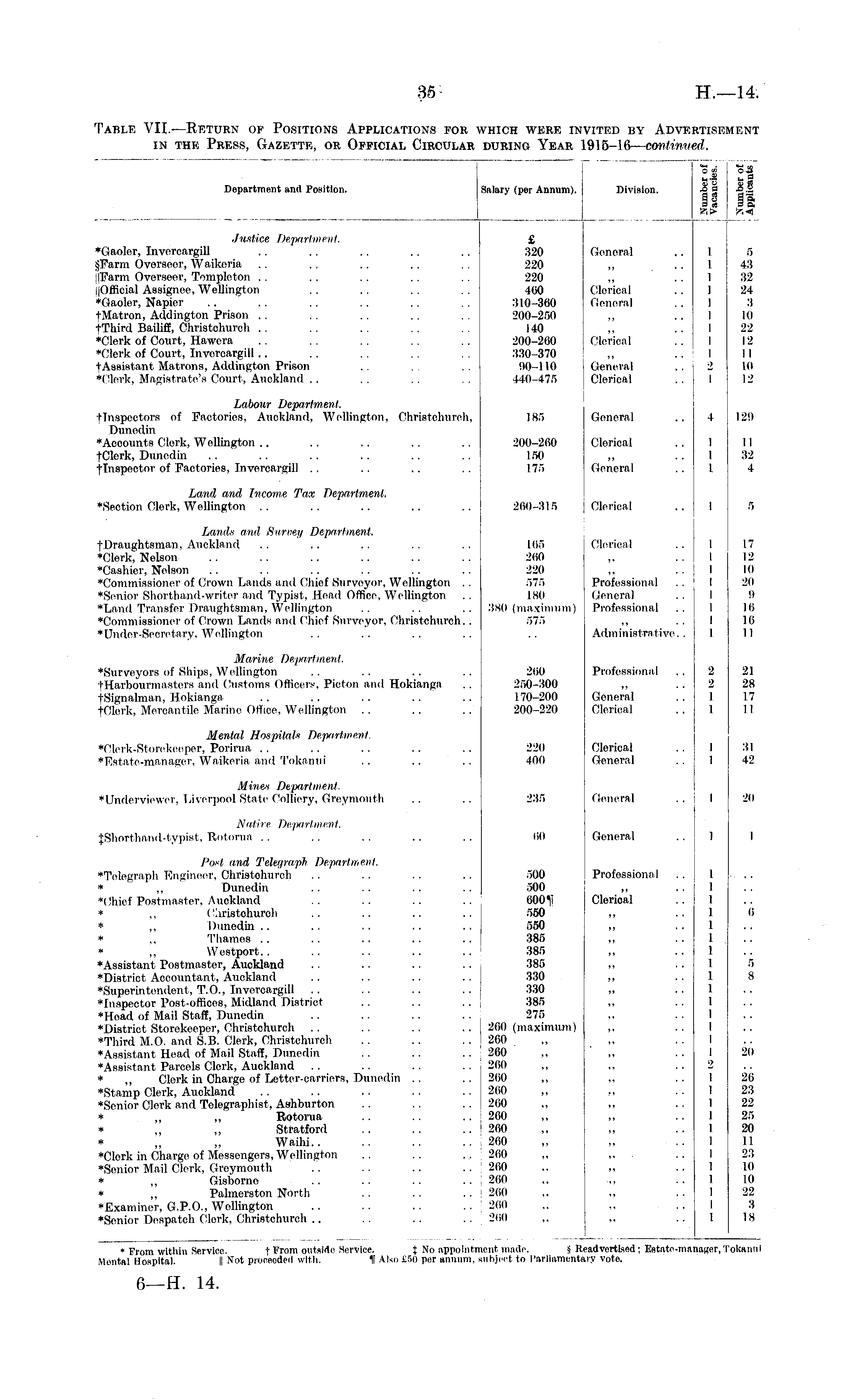 Department and Position. Salary (per Annum). Division. as u 2$ § & y,< Justice Department. £ 320 220 220 460 310-360 200-250 140 200-260 330-370 90-110 440-475 General 5 43 32 24 3 10 22 12 I I 10 12 ♦Gaoler, Invercargill sjFarm Overseer, Waikoria j|Farm Overseer, Templeton ijOfficial Assignee, Wellington ♦Gaoler, Napier fMatron, Addington Prison fThird Bailiff, Christchurch ♦Clerk of Court, Hawera ♦Clerk of Court, Invercargill fAssistant Matrons, Addington Prison ♦Clerk, Magistrate's Court, Auckland Clerical General Clerical General Clerical Labour Department. flnspectors of Factories, Auckland, Wellington, Christchurch, Dunedin ♦Accounts Clerk, Wellington fClerk, Dunedin fInspector of Factories, Invercargill 185 200-260 150 175 General Clerioal 4 1 I I 129 II 32 4 General Land and Income Tax Department. ♦Section Clerk, Wellington 200-315 Clerical I 5 Lands and Survey Department f Draughtsman, Auckland ♦Clerk, Nelson ♦Cashier, Nelson ♦Commissioner of Crown Lands and Chief Surveyor, Wellington ♦Senior Shorthand-writer and Typist, Head Office. Wellington ♦Land Transfer Draughtsman, Wellington ♦Commissioner of Crown Lands and Chief Surveyor. Christchurch. . ♦Under-Secretary. Wellington 165 200 220 575 180 3so (maximum) 575 Clerioal Professional (leneral Professional I I 1 I I I I I 17 12 10 20 9 10 16 11 Administrative.. Marine Department ♦Surveyors of Ships, Wellington tHarbourmasters and Customs Officers, Picton and Hokianga f Signalman, Hokianga fClerk, Mercantile Marine Office, Wellington 200 250-800 170-200 200-220 Professional General Clerical 2 2 I I 21 28 17 11 Mental Hospitals Department. ♦Clerk-Storekeeper, Porirua ♦Estate-manager, Waikeria and Tokanui 220 400 Clerical General I 1 31 42 Mines Department ♦IJnderviewer, Liverpool State Colliery, Greymouth 235 General I 20 Native Department. {Shorthand-typist, Rotorua 60 General I 1 Post and Telegraph Department. ♦Telegraph Engineer, Christolmroh * ,, Dunedin ♦Chief Postmaster, Auckland * ,, Cliristohuroh * ,, Dunedin * ,, Thames .. * ,, Westport. . ♦Assistant Postmaster, Auckland ♦District Accountant, Auckland ♦Superintendent, TO., Invercargill ♦Inspector Post-offices, Midland District ♦Head of Mail Staff, Dunedin ♦District Storekeeper, Christchurch ♦Third M.O. and S.B. Clerk, Christchurch ♦Assistant Head of Mail Staff, Dunedin ♦Assistant Parcels Clerk, Auckland * ,, Clerk in Charge of Letter-carriers, Dunedin ♦Stamp Clerk, Auckland ♦Senior Clerk and Tolegraphist, Ashburton * ,, ,, Rotorua * ,, ,, Stratford * ,, ,, Waihi.. ♦Clork in Charge of Messengers, Wellington ♦Senior Mail Clerk, Greymouth * ,, Gisborne * ,, Palmerston North ♦Examiner, G.P.O., Wellington ♦Senior Despatch Clork, Christchurch .. 500 500 600 % 550 550 385 385 385 330 330 385 275 200 (maximum) 260 260 260 260 260 260 200 260 200 260 260 260 260 260 200 Professional Clerical ,, I I I I I I 1 I I 1 I I I I I 2 I I I I I I I I 1 I I I 6 5 8 20 26 23 22 25 20 II 23 10 10 22 3 18 * From within Service. t From outside Service. f No appoint! Mental Hospital. II Not proceeded with. II Also £50 per annum, lent ninili'. 8 Readvnrtised; Estate-mailfyrer, Tokanni inbject to Parliamentary vote.