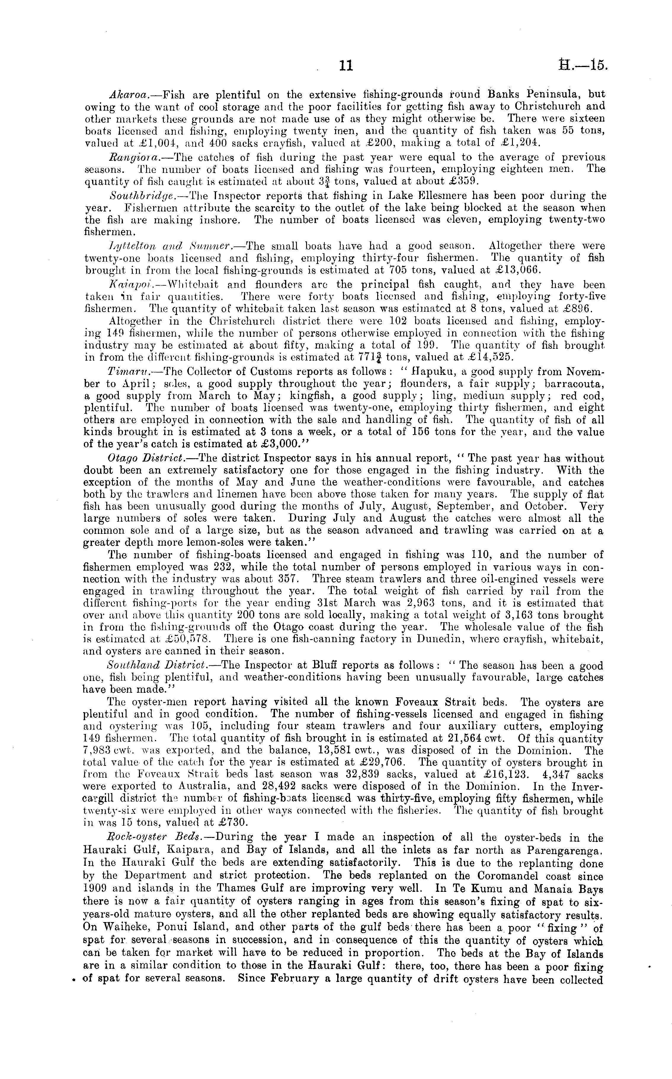 Akaroa. —Fish are plentiful on the extensive lishing-grounds round Banks Peninsula, but owing to the want of cool storage and the poor facilities for getting fish away to Christchurch and other markets these grounds are not made use of as they might otherwise be. There were sixteen boats licensed and fishing, employing twenty men, and the quantity of fish taken was 55 tons, valued at £1,004, and 400 sacks crayfish, valued at £200, making a total of £1,204. Rangiora. —The catches of fish during the past year were equal to the average of previous seasons. The number of boats licensed and fishing was fourteen, employing eighteen men. The quantity of fish caught is estimated at about 3f tons, valued at about £359. Southbridge. —The Inspector reports that fishing in Lake Kllesmere has been poor during the year. Fishermen attribute the scarcity to the outlet of the lake being blocked at the season when the fish are making inshore. The number of boats licensed was eleven, employing twenty-two fishermen. Lyttelton and, Sumner. —The small boats have had a good season. Altogether there were twenty-one boats licensed and fishing, employing thirty-four fishermen. The quantity of fish brought in from the local fishing-grounds is estimated at 705 tons, valued at £13,066. Kaiapoi. —Whitebait and flounders are the principal fish caught, and they have been taken in fair quantities. There were forty boats licensed and fishing, employing forty-five fishermen. The quantity of whitebait taken last season was estimated at 8 tons, valued at £896. Altogether in the Christchurch district there were 102 boats licensed and fishing, employing 149 fishermen, while the number of persons otherwise employed in connection with the fishing industry may be estimated at about fifty, making a total of 199. The quantity of fish brought in from the different fishing-grounds is estimated at 771f tons, valued at £14,525. Timaru.—The Collector of Customs reports as follows : " Hapuku, a good supply from November to April; soles, a good supply throughout the year; flounders, a fair supply; barracouta, a good supply from March to May; kingfish, a good supply; ling, medium supply; red cod, plentiful. The number of boats licensed was twenty-one, employing thirty fishermen, and eight others are employed in connection with the sale and handling of fish. The quantity of fish of all kinds brought in is estimated at 3 tons a week, or a total of 156 tons for the year, and the value of the year's catch is estimated at £3,000." Otago District. —The district Inspector says in his annual report, " The past year has without doubt been an extremely satisfactory one for those engaged in the fishing industry. With the exception of the months of May and June the weather-conditions were favourable, and catches both by the trawlers and linemen have been above those taken for many years. The supply of flat fish has been unusually good during the months of July, August, September, and October. Very large numbers of soles were taken. During July and August the catches were almost all the common sole and of a large size, but as the season advanced and trawling was carried on at a greater depth more lemon-soles were taken." The number of fishing-boats licensed and engaged in fishing was 110, and the number of fishermen employed was 232, while the total number of persons employed in various ways in connection with the industry was about 357. Three steam trawlers and three oil-engined vessels were engaged in trawling throughout the year. The total weight of fish carried by rail from the different fishing-ports for the year ending 31st March was 2,963 tons, and it is estimated that over and above this quantity 200 tons are sold locally, making a total weight of 3,163 tons brought in from the fishing-grounds off the Otago coast during the year. The wholesale value of the fish is estimated at £50,578. There is one fish-canning factory in Dunedin, where crayfish, whitebait, and oysters are canned in their season. Southland District. —The Inspector at Bluff reports as follows : " The season has been a good one, fish being plentiful, and weather-conditions having been unusually favourable, large catches have been made." The oyster-men report having visited all the known Foveaux Strait beds. The oysters are plentiful and in good condition. The number of fishing-vessels licensed and engaged in fishing and oystering was 105, including four steam trawlers and four auxiliary cutters, employing 149 fishermen. The total quantity of fish brought in is estimated at 21,564 cwt. Of this quantity 7,983 cwt. was exported, and the balance, 13,581 cwt., was disposed of in the Dominion. The total value-of the catch for the year is estimated at £29,706. The quantity of oysters brought in from the Foveaux Strait beds last season was 32,839 sacks, valued at £16,123. 4,347 sacks were exported to Australia, and 28,492 sacks were disposed of in the Dominion. In the Invercargill district the number of fishing-baats licensed was thirty-five, employing fifty fishermen, while twenty-six were employed in other ways connected with tho fisheries. The quantity of fish brought in was 15 tons, valued at £730. Rock-oyster Beds. —During the year I made an inspection of all the oyster-beds in the Hauraki Gulf, Kaipara, and Bay of Islands, and all the inlets as far north as Parengarenga. In the Hauraki Gulf the beds are extending satisfactorily. This is due to the replanting done by the Department and strict protection. The beds replanted on the Coromandel coast since 1909 and islands in the Thames Gulf are improving very well. In Te Kumu and Manaia Bays there is now a fair quantity of oysters ranging in ages from this season's fixing of spat to six-years-old mature oysters, and all the other replanted beds are showing equally satisfactory results. On Waiheke, Ponui Island, and other parts of the gulf beds there has been a poor "fixing" of spat for several seasons in 