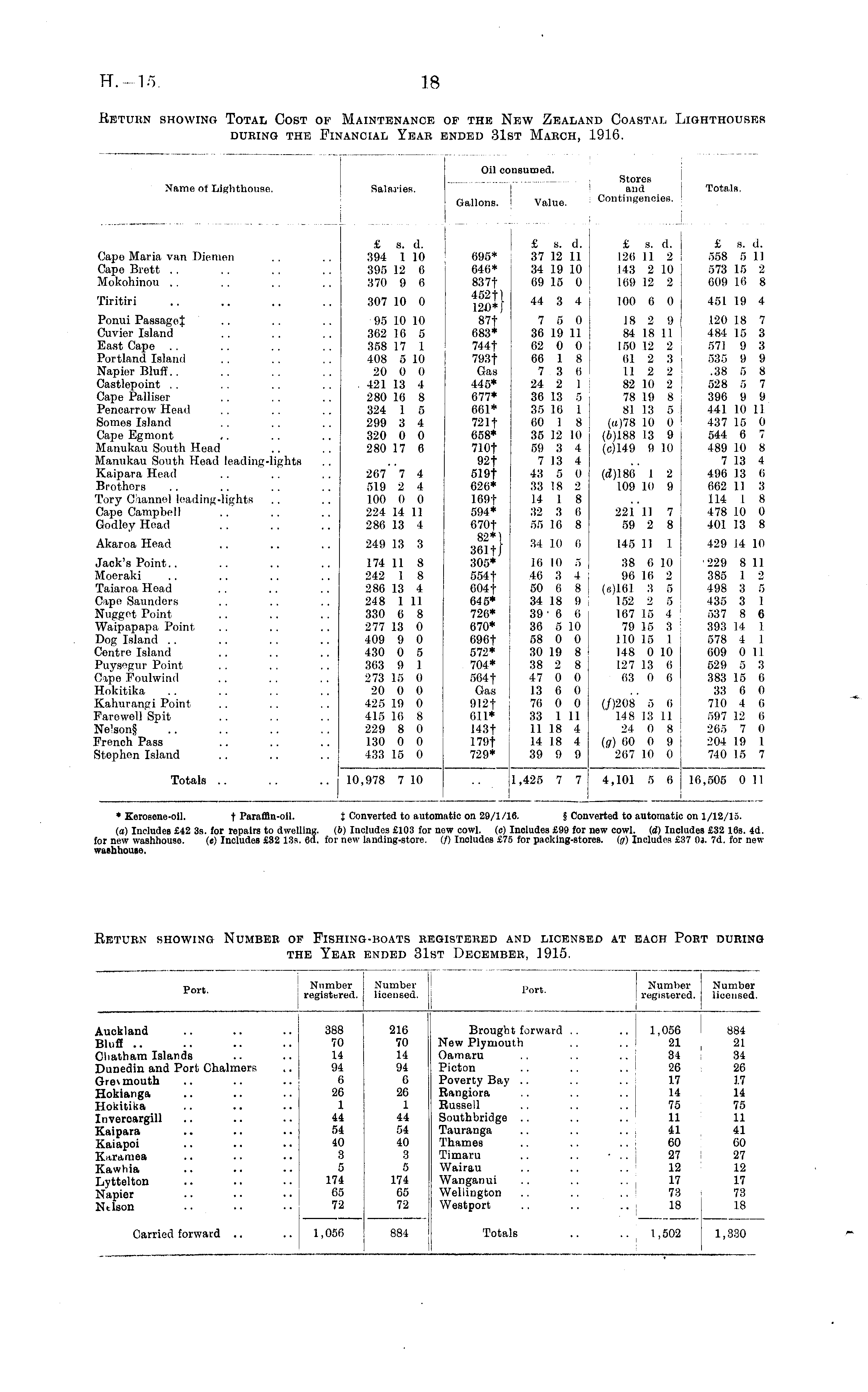 Oil oi msumed. Stores and Contingencies. Name of Lighthouse. Salaries. Totals. Gallons. Value. Cape Maria van Diemen Cape Brett Mokohinou £ s. d. 394 1 10 395 12 6 370 9 6 695* 646* 83 7f 452+) 120* f 87t 683* 744f 793+ Gas 445* 677* 661* 72] t 658* 710f 92f 519t 626* 169f 594* 670f 82*1 36111 305* 5541 6041 645* 726* 670* 696+ 572* 704* 5641 Gas 912+ 011* 143+ 179+ 729* £ s. d. 37 12 11 34 19 10 69 15 0 £ s. d. 126 11 2 .1.43 2 10 169 12 2 £ s. d. 558 5 11 573 15 2 609 16 8 Tiritiri 307 10 0 44 3 4 100 6 0 451 19 4 Ponui PassagoJ Cuvier Island East Cape Portland Island Napier Bluff. . Castlepoint Capo Palliser Pencarrow Head Somos Island Cape Egmont Manukau South Head Manukau South Head leading-lights Kaipara Head Brothors Tory Channel leading-lights Cape Campbell Godley Head 95 1.0 10 362 16 5 358 17 I 408 5 10 20 0 0 . 421 13 4 280 16 8 324 1 5 299 3 4 320 0 0 280 17 6 7 5 0 36 19 11 62 0 0 66 1 8 7 3 6 24 2 1 36 13 5 35 16 1 60 1 8 35 12 10 59 3 4 7 13 4 43 5 0 33 18 2 14 I 8 32 3 6 55 16 8 18 2 9 84 18 I I 150 12 2 lil 2 3 11 2 2 82 10 2 78 19 8 81 13 5 (a)78 10 0 (4)188 13 9 (0)140 9 10 120 18 7 484 15 3 571 9 3 .535 9 9 .38 5 8 528 5 7 396 9 9 441 10 11 437 15 0 544 6 7 489 10 8 7 13 4 496 13 6 662 11 3 114 I 8 478 10 0 401 13 8 267 7 4 519 2 4 100 0 0 224 14 11 286 13 4 0)186 1 2 109 10 9 221 11 7 59 2 8 Akaroa Head 249 13 3 34 10 (i 145 11 1 429 14 10 Jack's Point.. Moeraki Taiaroa Head Cape Saunders Nugget Point Waipapapa Point Dog Island Centre Island Puysegur Point Cape Foulwind Hokitika Kahurangi Point Farewell Spit Nelson§ French Pass Stephen Island 174 11 8 242 I 8 286 13 4 248 1 11 330 6 8 277 13 0 409 9 0 430 0 5 363 9 1 273 15 0 20 0 0 425 19 0 415 16 8 229 8 0 130 0 0 433 15 0 16 10 5 46 3 4 50 6 8 34 18 9 39' 6 6 36 5 10 58 0 0 30 19 8 38 2 8 47 0 0 13 6 0 76 0 0 33 1 11 11 18 4 14 18 4 39 9 9 38 6 10 96 16 2 («)16I 3 5 152 2 5 167 15 4 79 15 3 110 15 1 148 0 10 127 13 6 63 0 (i '229 8 11 385 1 2 498 3 5 435 3 1 537 8 6 393 14 1 578 4 1 009 0 11 529 5 3 383 15 6 33 6 0 710 4 6 597 12 6 265 7 0 204 19 1 740 15 7 (/)208 5 6 148 13 11 24 0 8 (.7) 60 0 9 267 10 0 Totals 10,978 7 10 1,425 7 7 4,101 5 6 10,505 0 11 * Kerosene-oil. t Paraffin-oil. (a) Includes £42 3s. for repairs to dwelling, i tor new washhouse. (e) Includes £32 13s. 6d. to; vvashhouBe. X Converted to autom ,b) Includes £103 for n< :■ new landing-store. ( atlcon 29/1/1 ;w cowl, (c) /) Includos £7; 16. § Coi Includes £99 foi 5 for packing-stt lverted to automatic new cowl, (d) Incl ires. lg) Includes £1 i on 1/12/15. ludes £32 10s. 4d. 37 Oi. 7d. for new