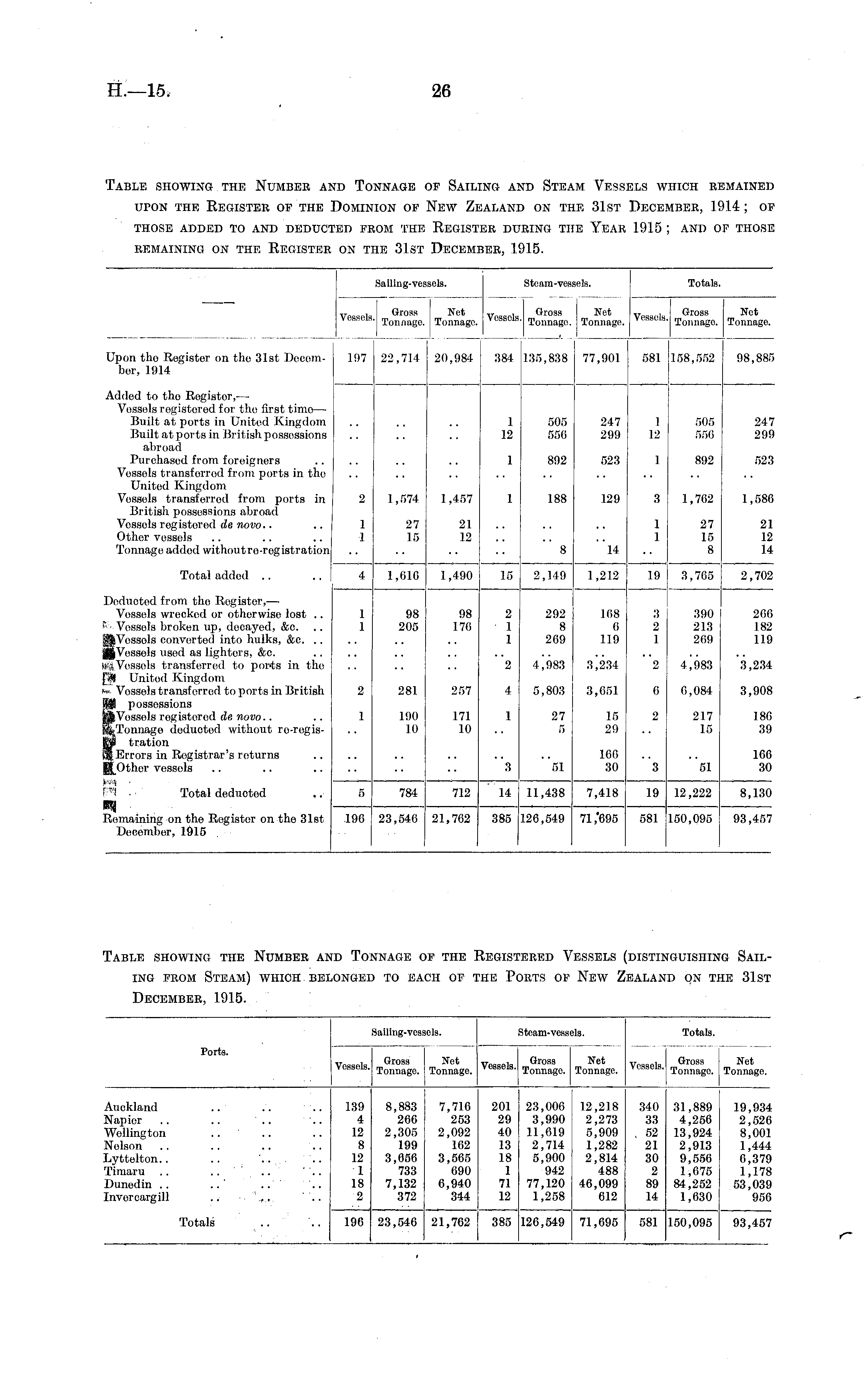 Table showing the Number and Tonnage of Sailing and Steam Vessels which remained upon the Register of the Dominion of New Zealand on the 31st December, 1914; of those added to and deducted from the Register during the Year 1915; and of those remaining on the Register on the 31st December, 1915.