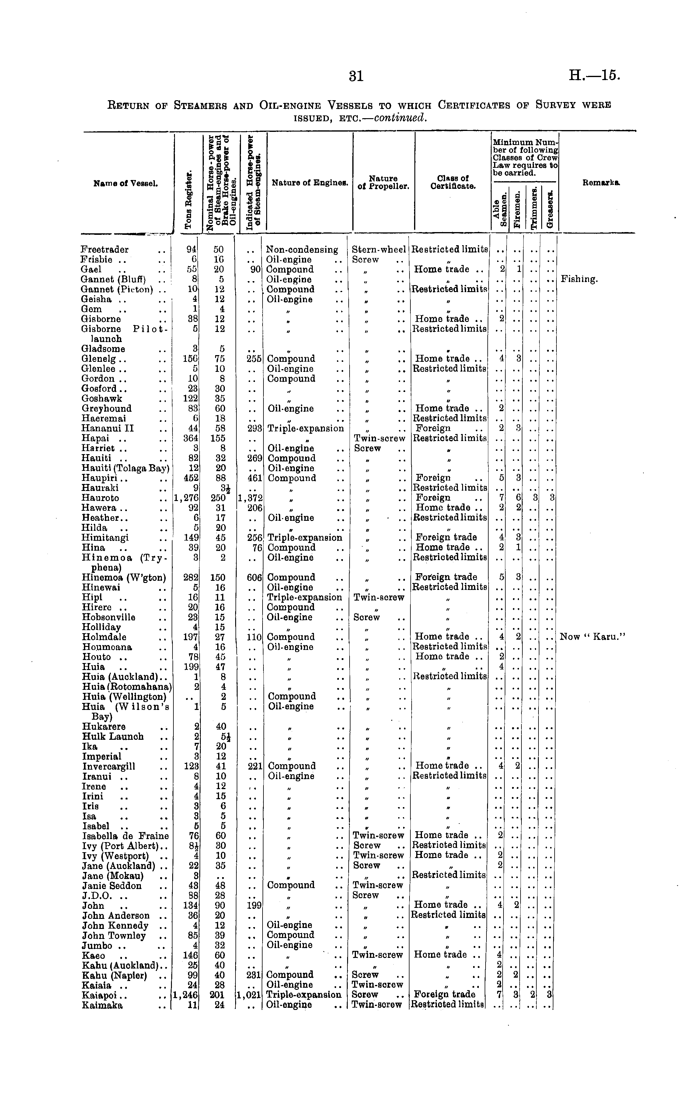 Name of Vessel. u CD -<►-> CD i ea a o to l-rrJ+4 IS K a S 0 -. P Oigte ' 3 B ll! Ifli Bio •si" 5 s cd ( "an B5 o ofZK Z £ i raC Bf Kg all Nature of Engines. Nature of Propeller. Class of Certificate. Mil bet Cla I.abe 1 nlmum Num- ■ of following isses of Crew w requires to carried. Remarks. CD 3 ti S - lis a a to ill h D CD Freetrader Fcisbie Gael Gannet (Bluff) .. Gannet (Pit-ton) .. Geisha .. .. 1 Gem Gisborne Gisborne Pilotlaunch Gladsome Glenelg Glenlee Gordon Gosford Goshawk Greyhound Haeremai Hananui II Hapai Harriet Hauiti Hauiti (Tolaga Bay) Haupiri Hauraki Hauroto Hawera Heather.. Hilda Himitangi Hina Hinemoa (Tryphena) Hinemoa (W'gton) Hinewai Hipi Hirero Hobsonville Holliday Holmdale Houmoana Houto Huia Huia (Auckland).. Huia I' Rotomahana) Huia (Wellington) Huia (Wilson's Bay) Hukarere Hulk Launoh Ika Imperial Invercargill Iranui Irene Irini Iris Isa Isabel Isabella de Fraino Ivy (Port Albert).. Ivy (Westport) .. Jane (Auokland) .. Jane (Mokau) Janie Seddon J.D.O. .. John John Anderson .. John Kennedy .. John Townley Jumbo Kaeo Kahu (Auokland).. Kahu (Napier) .. Kaiaia Kaiapoi.. .. '. Kaimaka 91 6 55 8 10 4 1 38 5 3 156 5 10 23 122 83 6 44 364 3 82 12 452 9 1,276 92 6 5 149 39 3 282 5 16 20 23 4 197 4 78 199 1 I 2 1 2 2 7 3 123 8 4 4 3 3 5 76 84 4 22 3 43 88 134 36 4 85 4 146 25 99 24 1,246 11 50 16 20 5 12 12 4 12 12 5 75 10 8 80 35 60 18 58 155 8 32 20 88 34 250 31 17 20 45 20 2 150 16 11 16 15 15 27 16 45 47 8 4 2 5 '90 255 293 269 461 1,372 206 256 76 606 Non-condensing Oil-engine Compound Oil-engine Compound Oil-engine Compound Oil-engine Compound Oil-engine Triple-expansion Oil-engine Compound Oil-engine Compound Oil-engine Triple-expansion Compound Oil-engine Compound Oil-engine Triple-expansion Compound Oil-engine Stern-whoel Screw « . • Twin-screw Screw Twin-screw Screw Restrictedlimits Home trade .. Restrictedlimits Home trade .. Restrictedlimits Home trade .. Restrictedlimits Home trade .. Restrictedlimits Foreign Restrioted limits Foreign Restricted limits Foreign Homo trade .. Restrictedlimits Foreign trade Home trade .. Restrioted limits Foreign trade Restricted limits "i 2 5 *2 2 "4 2 2 5 7 2 1 3 '3 3 *6 2 3 1 3 .. '.'! 3 Fishing. iio Compound Oil-engine Home trade .. Restrioted limits Home trade .. "4 '2 4 2 Now " Karu." Restrioted limits Compound Oil-engine 40 51 20 12 41 10 12 15 6 5 5 60 30 10 35 221 Compound Oil-engine Home trade .. Restrioted limits "i 2 Twin-screw Sorew Twin-screw Screw Homo trade .. Restrioted limits Home trade .. 2 2 2 Restricted limits 48 28 90 20 12 39 32 60 40 40 28 201 24 Compound Twin-screw Sorew 199 Home trade .. Restricted limits '1 *2 Oil-engine Compound Oil-engine Twin-sorew Home trade .. 4 2 2 2 7 231 Compound Oil-engine Triple-expansion Oil-engine Screw Twin-screw Sorew Twin-sorew 2 1,021 Foreign trade Restrioted limits 3 *2