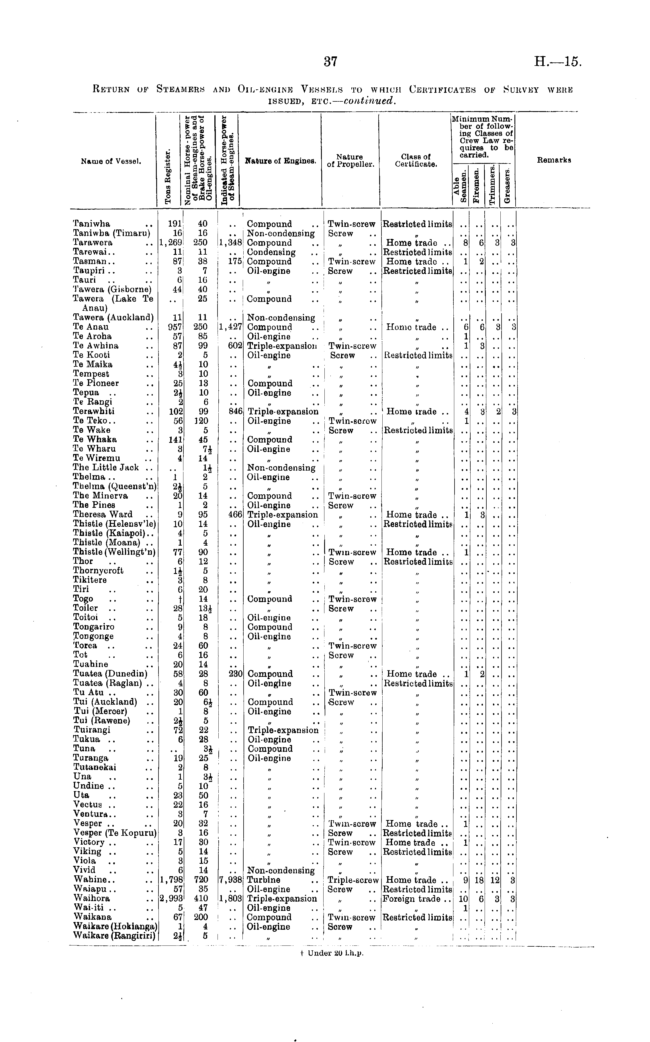 Name of VesseliD Eg '& 1 Xt a 3 H tacrj-aa £ fl° £ S ta 0 0 o!2g 1 a o (D--5 a 2fl<S W a o © "3 £ w 2 © co a mi it A OofQO CD o . P*to S a li to cd •a a M i tdaa .!« Nature of Engines. Nature of Propeller. CIhrr of Cer tine ate. Mini bei Or qu cai imm ir of g Ch ow ] lireB rriec nNi foil, isset law to 1 I. *)W1 of rebe Remarks fl tD CD s l CO a CD a ft CD U CD a I 'u EH CO 3 CD H 0 Taniwha Taniwha (Timaru) Tarawera Tarowai.. TaBman Taupiri Tauri Tawera (Gisborne) Tawera (Lake Te Anau) Tawera (Auckland) Te Anau Te Aroha Te Awhina Te Kooti Te Maika Tempest Te Pioneer Tepua .. Te Rangi Terawhiti TeTeko.. Te Wake Te Whaka Te Wharu Te Wiremu The Little Jack .. Tholma Thelma (Queenst'n) The Minerva The Pines Theresa Ward Thistle (Helensv'le) Thistle (Kaiapoi).. Thistle (Moana) .. Thistle (Wellingt'n) Thor Thornycroft Tikitere Tiri .. .. Togo Toiler Toitoi Tongariro Tongonge Torea Tot Tuahine Tuatea (Dunedin) Tuatoa (Raglan) .. Tu Atu .. Tui (Auckland) .. Tui (Meroer) Tui (Rawene) Tuirangi Tukua Tuna .. Turanga Tutanekai Una Undine Uta Vectus .. Ventura.. Vesper Vesper (To Kopuru) Victory .. Viking Viola .. Vivid Wahine.. Waiapu Waihora Wai-iti .. Waikana Waikare (Hokianga) Waikare (Rangiriri) 19 11 1,26! i: 8' 40 10 250 11 38 7 10 40 25 1,348 : Compound .. ' Twin-scrow Non-condensing I Screw Compound Condensing .. » Compound .. Twin-sorew Oil-engine .. Screw Restrictedlimits Home trado .. Restrioted limits Home trade .. Restrictedlimits '8 *6 's 3 175 i *2 44 Compound 11 957 57 87 2 44 3 25 24 2 102 56 3 141 3 4 11 250 85 99 5 10 10 13 10 6 99 120 5 45 74 14 14 2 5 14 2 95 14 5 4 90 12 5 8 20 14 13£ 18 8 8 60 16 14 28 8 60 64 8 5 22 28 34 25 8 34 10 50 16 7 32 16 30 14 15 14 720 35 410 47 200 4 5 1,427 C02 Non-condensing „ Compound .. „ Oil-engine Triple-expansion Twin-screw Oil-engine Screw Compound .. „ Oil-engine .. I „ Triple-expansion Oil-engine .. Twin-sorew .. Screw Compound Oil-engine Homo trade .. Restrictod limits 6 1 1 *6 3 3 s 846 Homo trade .. 4 1 3 2 3 Restrictedlimits i 24 20 1 9 10 4 1 77 6 14 3 6 t 28 5 9 4 24 6 20 58 4 30 20 1 24 72 6 Non-oondensing Oil-engine 466 Compound .. i Twin-scrow Oil-engine .. Screw Triple-expansion 1 „ Oil-engine .. „ Homo trade .. Restrictedlimits i 3 .. I Twin-screw .. I Screw Home trade .. Rostrioted limits i " Compound .. Twin-screw .. Screw Oil-engine .. „ Compound Oil-engine .. Twin-screw .. 1 Screw Compound Oil-engine .. Twin-screw Compound .. Screw Oil-engine „ „ .. 230 1 Homo trade .. Restrictedlimits i '2 1 • • Triple-expansion „ Oilengine Compound Oil-engine 19 2 1 5 23 22 3 20 3 17 5 3 6 1,798 57 2,993 5 67] 1 _2il I " 1 " " .. Twin-screw .. 1 Sorew „ .. j Twin-scrow .. I Screw Home trade .. Restrictedlimits Home trado .. Restricted limits i i 7,938 1,803 ./ • • j ., Non-condensing „ Turbine .. ' Triple-scrow Oil-engine .. , Sorew Triple-expansion „ Oil-engine .. „ Compound .. Twin screw Oil-engine .. 1 Screw Home trade .. Restrictedlimits! Foreign trade .. 9 10 1 18 6 i2 3 8 3 Restrictod limits, ... t Under 20 i.h.p.