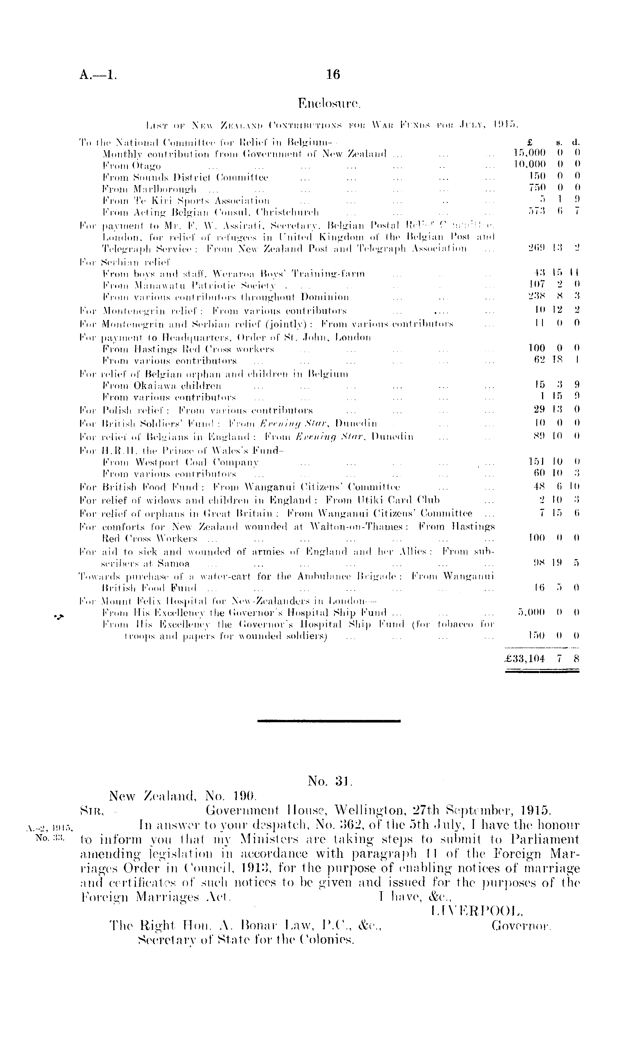 Enclosure. List of Xkw Zealand Contributions pod Wah Frans fob .li-i.y, 1915, To the National Committee for Relief in Belgium-— £ s. d. Monthly contribution from Government of New- Zealand ... ... ... 15,000 0 0 From Otago ... 10,000 0 0 Krom Sounds District Committee ... ... •■■ •■• ■•■ '- r '" 0 0 From Marlborough ... ... ... ... ... ... 750 0 0 From Te Kiri Sports Association ... ... ... ... 5 1 9 From Acting Belgian Consul, Christchurch ... ... ... ... 573 6 i For payment to Mr, F, W. Assirati, Secretary, Belgian Postal Rcli '' C urrettrp. London, for relief of refugees in United Kingdom of the Belgian Post and Telegraph Service: From New Zealand Post and Telegraph Association ... 209 18 2 For Serbian relief— From boys and staff, Woraroa Boys' Training-farm ... ... ... t-'i 15 II From Manawatu Patriotic Society . ... ... ... ... ... 107 "2 0 From various contributors throughout Dominion ... ... ... 288 H .'! For Montenegrin relief: From various contributors ... .... 10 12 2 For Montenegrin and Serbian relief (jointly): From various contributors ... II 0 0 For payment to Headquarters, Order of St. John, London Prom Hastings Red Cross workers ... ... ... ... ... 100 0 0 From various contributors ... ... ... ... ... ... 82 IS I For relief of Belgian orphan and children in Belgium— From Okaiawa children ... ... ... ... ... ... 15 3 9 From various contributors ... ... ... ... ... ... 115 9 For Polish relief: From various contributors ... ... ... ... 29 13 0 For British Soldiers' Fund : From Evening Star, Dunedin ... ... ... 10 0 0 For relief of Belgians in England : Prom Evening Star. Dunedin ... ... 89 10 f) For H.R.11. the Prince of Wales's bund— Prom Westpoi-t Coal Company ... ... ... ... ... 151 10 0 Prom various contributors ... ... ... ... ... ... 60 10 .'i For British Pood Fund: From Wanganui Citizens' Committee ... ... 48 (i lo For relief of widows and children In England: From CJtiki Card Club ... 2 10 •'! For relief of orphans in Great Britain : From Wanganui Citizens' Committee ... 7 15 ti For comforts for New Zealand wounded at Walton-on-Thames : From Hastings Red Cross Workers ... ... ... ... ... ... ... 100 0 0 For aid to sick and wounded of armies of England and her Allies : From subscribers at Samoa ... ... ... ... ... ... ... OS 19 5 Towards purchase of a water-cart for the Ambulance Brigade: Prom Wanganui British Pood Fund ... ... ... ... ... ... ... L 6 5 0 for Mount Pclix Hospital for New Zralandcrs in London — From His Excellency the Governor's Hospital Ship Fund ... ... ... 5,000 0 0 From His Excellency the Governor's Hospital Ship Fund (for tobacco for troops and papers for wounded soldiers) ... ... ... ... 150 0 0 £33,104 7 8