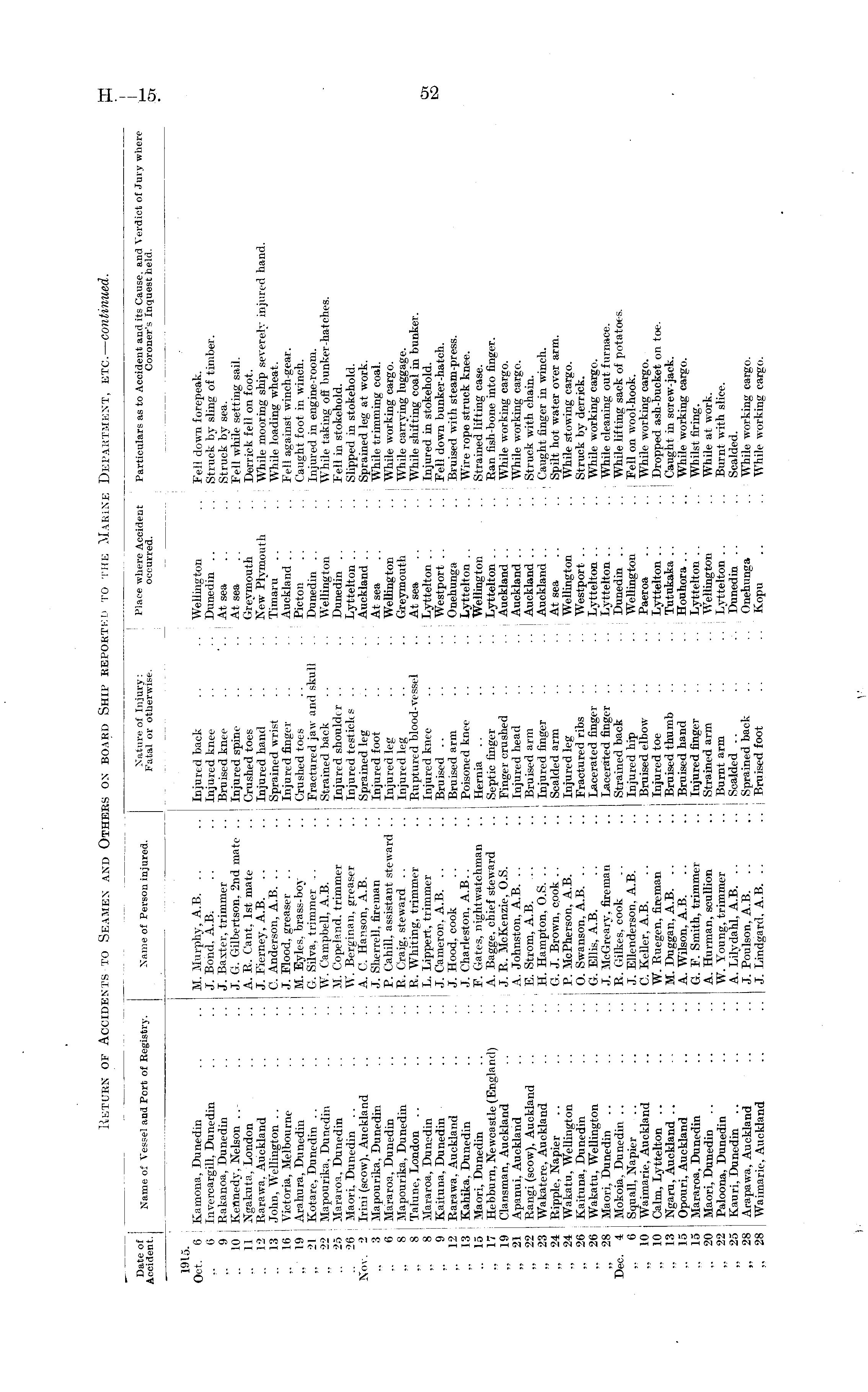 Date of Accident. Name of Vessel and Port of Registry. Name of Person injured. Nature of Injury: Fatal or otherwise. [ Place where Accident Particulars as to Accident and its Cause, and Verdict of Jury where occurred. Coroner's Inquest held. I I I I 1915. Oct. 6 i Kamona, Dunedin ,. 6 Invercargill, Dunedin 9 Rakanoa, Dunedin 10 Kennedy, Nelson 11 Ngakuta, London 12 Rarawa, Auckland ,. 13 John, Wellington .. ,, 16 Victoria, Melbourne „ 19 Arahura, Dunedin ,, 21 Kotare, Dunedin „ 22 Mapourika, Dunedin 25 Mararoa, Dunedin 26 Maori, Dunedin Nov. 2 Irini (scow). Auckland ,, 3 : Mapourika. Dunedin 6 Mararoa, Dunedin ,, 8 Mapourika, Dunedin ,, 8 Talune, London 8 Mararoa, Dunedin ,. 9 Kaituna, Dunedin ,. 12 Raraw-a, Auckland 13 Kahika. Dunedin 15 Maori, Dunedin „ 17 Hebburn, Newcastle (England) „ 19 Clansman, Auckland „ 21 Apanui, Auckland ,, 22 Rangi (scow). Auckland „ 23 Wakatere, Auckland „ 24 Ripple, Napier „ 24 ' Wakatu, Wellington ,. 26 Kaituna, Dunedin „ 26 j Wakatu, Wellington „ 28 Maori, Dunedin Dee. 4 j Mokoia, Dunedin .. ,, 6 Squall, Napier „ 10 Waimarie, Auckland „ 10 Calm, Lyttelton „ 13 Ngaru, Auckland .. ,. 15 Opouri, Auckland 15 Mararoa, Dunedin „ 20 Maori, Dunedin „ 22 Paloona, Dunedin „ 25 Kauri, Dunedin .. „ 28 Arapawa, Auckland „ 28 Waimarie, Auckland 191 r.. Oct. 6 ! E 0 I ,. 9 I a. 10 l a. 11 I ,. 12 I .. 13 0 „ 16 A „ 19 1 „ 21 I „ 22 3 .. 25 I .. 26 : Nov. 2 1 3 1 6 1 8 1 8 : 8 : 9 1 .. 12 1 ,. 13 h .. 15 : ., 17 : „ 19 ( „ 21 . „ 22 ] „ 23 „ 24 ] „ 24 „ 26 , : ,. 26 i „ 28 : Dec. 4 I : ,. 6 „ 10 „ 10 i „ 13 „ 15 ,, 15 „ 20 ,, 22 • „ 25 „ 28 ,. 28 Kamona, Dunedin Invercargill, Dunedin Rakanoa, Dunedin Kennedy, Nelson Ngakuta, London Rarawa. Auckland John, Wellington Victoria, Melbourne Arahura, Dunedin Kotare, Dunedin Mapourika, Dunedin Mararoa, Dunedin Maori, Dunedin Irini (scow), Auckland Mapourika. Dunedin Mararoa, Dunedin Mapourika, Dunedin Talune, London Mararoa, Dunedin Kaituna, Dunedin Rarawa, Auckland Kahika. Dunedin Maori, Dunedin Hebburn, Newcastle (England) Clansman, Auckland Apanui, Auckland Rangi (scow), Auckland Wakatere. Auckland Ripple, Napier Wakatu. Wellington Kaituna, Dunedin Wakatu, Wellington Maori, Dunedin Mokoia, Dunedin Squall, Napier Waimarie, Auckland Calm, Ly-ttelton Ngaru, Auckland Opouri, Auckland Mararoa, Dunedin Maori, Dunedin Paloona, Dunedin Kauri, Dunedin Arapawa, Auckland Waimarie, Auckland . . M. Murphy, A.B. .. . . J. Bond, A.B. J. Baxter, trimmer J. G. Gilbertson, 2nd mate .. A. R. Cant, 1st mate J. Fierney, A.B. C. Anderson, A.B. . . J. Flood, greaser M. Eyles, brass-boy G. Silva, trimmer .. . . W. Campbell, A.B. . . | M. Copeland. trimmer W. Berginan, greaser .. A.C. Hanson,'A.B. J. Sherrell, fireman P. Cahill, assistant steward .. R. Craig, steward R. AVhiting, trimmer L. Lippert, trimmer J. Cameron, A.B. .. J. Hood, cook J. Charleston, A.B . . F. Gates, nightwatchman A. Bagge. chief steward .. J. R. McKenzie, O.S. A. Johnston, A.B. . . E. Strom, A.B. . . H. Hampton, O.S. .. G. J. Brown, cook .. .. P. McPherson, A.B. 0. Swanson. A.B. . . .. G. Ellis, A.B. J. McGreary, fireman R. Gilkes, cook J. Ellenderson. A.B. .. C. Keller, A.B. W. Ruegen, fireman M. Duagan. A.B. .. .. A. Wilson, A.B. G. F. Smith, trimmer A. Hurman, scullion W. Young, trimmer .. A. Lilvdahl, A.B. .. .. J. Poulson, A.B. .. J. Lindgard, A.B. . J J . 3 . C . J 1 I I 1 1 i i i ,. i M. Murphy, A.B. .. J. Bond. A.B. J. Baxter, trimmer J. G. Gilbertson, 2nd mate A. R. Cant, 1st mate J. Fierney, A.B. C. Anderson, A.B. .. J. Flood, greaser .. M. Eyles, brass-boy G. Silva. trimmer .. W. Campbell, A.B. M. Copeland. trimmer W. Berginan, greaser A. C. Hanson,'A.B. J. Sherrell, fireman P. Cahill, assistant stewart R. Craig, steward .. R. AVhiting, trimmer L. Lippert, trimmer J. Cameron, A.B. .. J. Hood, cook J. Charleston, A.B.. F. Gates, nightwatohman A. Bagge. chief steward J. R. McKenzie, O.S. A. Johnston, A.B. . . E. Strom, A.B. H. Hampton, O.S. .. G. J. Brown, cook .. P. McPherson, A.B. O. Swanson. A.B. .. G. Ellis, A.B. J. McGreary, fireman R. Gilkes, cook J. Ellenderson, A.B. C. Keller, A.B. W. Ruegen, fireman M. Duagan. A.B. .. A. Wilson, A.B. G. F. Smith, trimmer A. Hurman, scullion W. Young, trimmer A. Lilvdahl, A.B. .. J. Poulson, A.B. .. J. Lindgard, A.B. . . e ■d " i Injured back Injured knee Bruised knee Injured spine Crushed toes Injured hand Sprained wrist Injured finger Crushed toes Fractured jaw and skull Strained back Injured shoulder . . Injured testicks .. Sprained leg Injured foot Injured leg Injured leg Ruptured blood-vessel Injured knee Bruised Bruised arm Poisoned knee Hernia Septic finger Finger crushed Injured head Bruised arm Injured finger Scalded arm Injured leg Fractured ribs Lacerated finger Lacerated finger . . Strained back Injured hip Bruised elbowInjured toe : Bruised thumb Bruised hand Injured finger Strained arm Burnt arm Scalded .. Sprained back Bruised foot Wellington .. Fell down forepeak. •. ; Dunedin .. .. Struck by sling of timber. '. . I At sea .. .. I Struck by sea. .. At sea .. . . ! Fell while setting sail. Greymouth . . Derrick fell on foot. New Plymouth . . While mooring ship severely injured hand. Timaru .. .. I While loading wheat. .. , Auckland .. .. Fell against winch-gear. Picton . . . . j Caught foot in winch. Dunedin .. .. Injured in engine-room. Wellington . . While taking off bunker-hatches. Dunedin .. . . Fell in stokehold. Lyttelton .. . . Slipped in stokehold. Auckland .. . . Sprained leg at work. At sea .. .. While trimming coal. Wellington .. While working cargo. Greymouth .. While carrying luggage. At sea .. . . While shifting coal in bunker. Lyttelton . . . . 1 Injured in stokehold. Westport .. .. j Fell down bunker -hatch. Onehunga .. Bruised with steam-press. Ly r ttelton . . .. Wire rope struck knee. Wellington . .. I Strained lifting case. Lyttelton . . . . Ran fish-bone into finger. Auckland . . .. While w-orking cargo. . . . Au