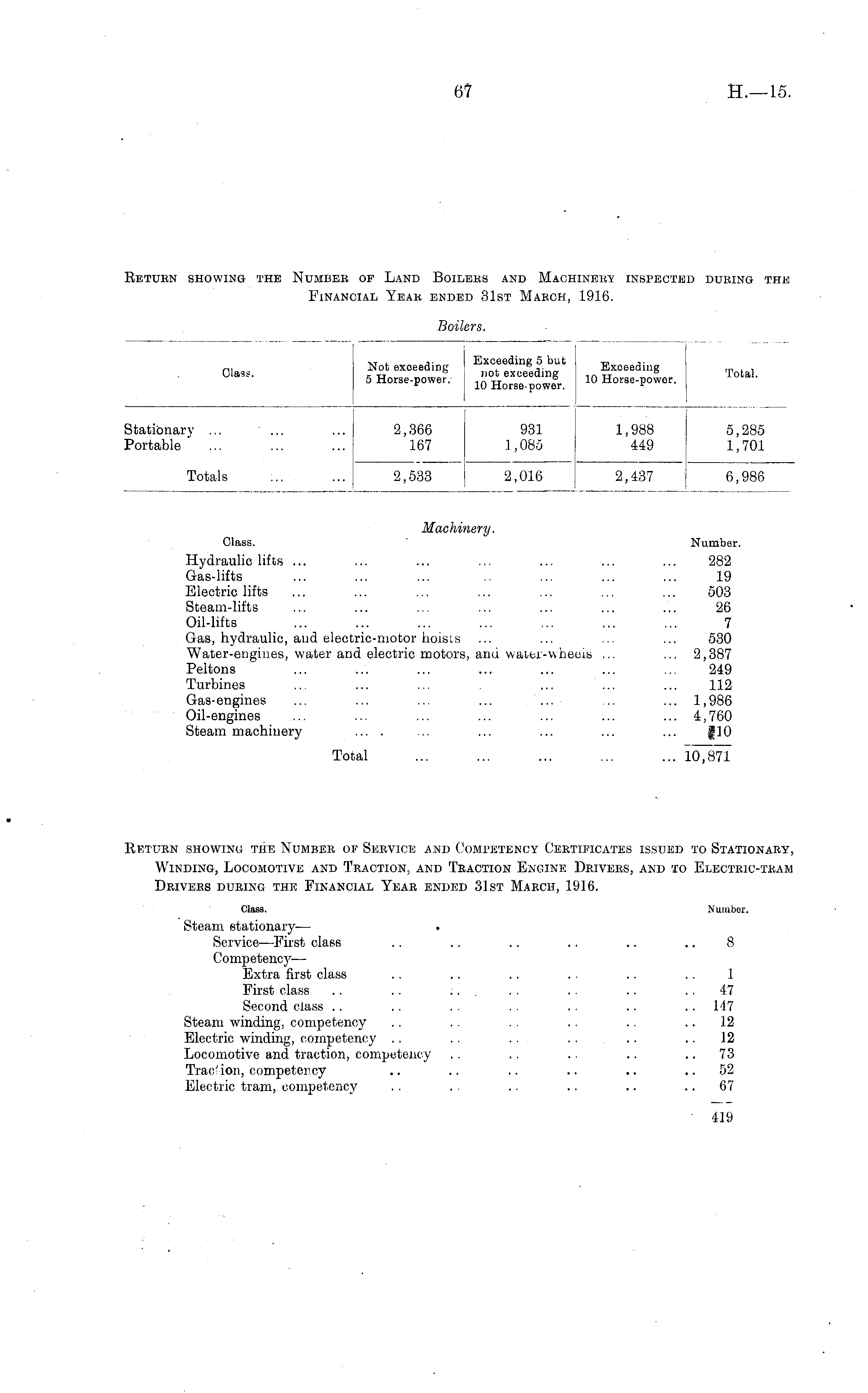Machinery. Class. Number. Hydraulic lifts ... ... ... ... ... ... ... 282 Gas-lifts ... ... ... .. ... ... ... 19 Electric lifts ... ... ... ... ... ... ... 503 Steam-lifts ... ... ... ... ... ... ... 26 Oil-lifts ... ... ... ... ... ... ... 7 Gas, hydraulic, and electric-motor hoists ... ... ... ... 530 Water-engines, water and electric motors, and water-wheels ... ... 2,387 Peltons ... ... ... ... ... ... ... 249 Turbines ... ... ... . ... ... ... 112 Gas-engines ... ... ... ... ... .. ... 1,986 Oil-engines ... ... ... ... ... ... ... 4,760 Steam machinery .... ... ... ... ... ... |]0 Total ... ... ... ... ... 10,871 Return showing the Number of Service and Competency Certificates issued to Stationary, Winding, Locomotive and Traction, and Traction Engine Drivers, and to Electric-tram Drivers during the Financial Year ended 31st March, 1916. Class. Number. Steam stationary— Service—First class .. .. .. .. .. .. 8 Competency— Extra first class .. .. .. . . . . . . I First class .. .. ... . . .. .. 47 Second class .. .. .. .. .. .. .. 147 Steam winding, competency .. .. .. .. ..12 Electric winding, competency .. .. .. .. .. ..12 Locomotive and traction, competency . . .. .. .. 73 Traotion, competency .. .. .. .. .. 52 Electric tram, competency .. . . .. .. .. 67 419