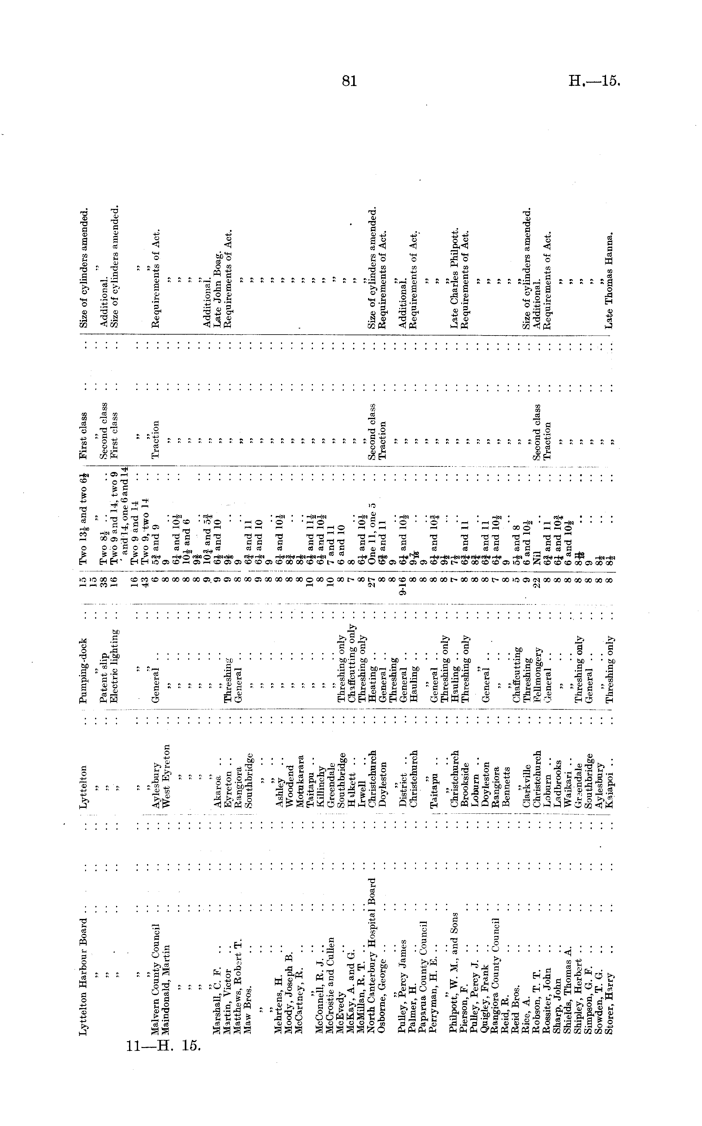Lyttelton Harbour Board .. Lyttelton Pumping -dock .. I 15 .-15 Patent slip .. ! 38 Electric lighting .. 16 Two 134- and two 6J First class Size of cylinders amended. Malvern County Council Maindonald, Martin Marshall, C. F. .. .. '.'. Martin, Victor Matthews, Robert T. Maw Bros. Mehrtens, H. Moody, Joseph B. McCartney, R. .. ... McConne'll, R. J. .. McCrostic and Cullen McEvedy McKay, A. and G. McMillan, R. T. .. -North Canterbury Hospital Board .. Osborne, George .. j Aylesbury .. ! West Eyreton .. : Akaroa . . Eyreton .. Rangiora Southbridge .. Ashley .. Woodend Motukarara Taitapu .. Killinchy Greendale .. ! Southbridge .. Halkett . . Irwell Christchurch Doyleston .. | 16 43 General .. .. 6 „ .. 8 8 8 8 9 9 Threshing .. 9 General .. .. 8 8 9 8 ■• -• 8 8 8 ..10 8 10 Threshing only .. 8 Chaffcutting only .. 7 Threshing only .. 8 Heating .. .. 27 General .. .. 8 Threshing .. 8 General .. .. 9-16 Hauling .. .. 8 8 General .. .. 8 Threshing only .. 8 Hauling .. .. 7 Threshing only .. 8 •■8 General .. .. 8 8 Chaffcutting .. o Threshing .. 9 Fellmongery .. ' 22 General . . .. I 8 8 8 Threshing only .. 8 General .. .. 8 Threshing only .. I 8 Two 84 • ■ .. Second class Two 9 and 14, two 9 First class ' and 14, one 6 and 14 Two 9 and 14 Two 9, two 14 of and 9 .. Traction 9 6J and 10fj 10A and 6 lOf and 5} 6J and 10 9 .. 6|andll 64 and 10 .. „ 9" 64. and 10* 6|-and 11 J 6J and 10J 7 and 11 .. „ 6 and 10 8 6i and 10 J One 11, one 5 .. Second class 6f and 11 .. Traction 9 64. and 104 9 6i and lOf 7* 6|and 11 8 3 6|andli .. "„ 6J and 10J 9 54 and 8 .. „ 6 and 104Nil .. .. Second class 6f and 11 .. Traction 61 and 10J 6 and 10-J 8* 9 8J 84 Additional. Size of cylinders amended. Requirements of Act. Additional. Late John Boag. Requirements of Act. Size of cylinders amended. Requirements of Act. Pulley, Percy James Palmer, H. Paparua County Council Perryman, H. E. .. District .. Christchurch .. ; Taitapu .. Additional. Requirements of Act. Philpott, W. M., and Sons Pierson, F. Pulley, Percy J. .. Quigley, Frank Rangiora County Council Reid, R. Reid Bros. Rice, A. Robson, T. T. Rossiter, John Sharp, John Shields, Thomas A. Shipley, Herbert Simpson, G. F. .. Sowden, T. G. Storer, Harry Christchurch .. 1 Brookside .. | Loburn .. .. j Doyleston Rangiora .. ! Bennetts .. I Clarkville .. j Christchurch Loburn .. Ladbrooks .. ! Waikari .. .. ; Gr;endale .. : Southbridge .. j Aylesbury . . ' Kaiapoi .. Late Charles Philpott. Requirements of Act. ,, Size of cylinders amended. Additional. Requirements of Act. Late Thomas Hanna.