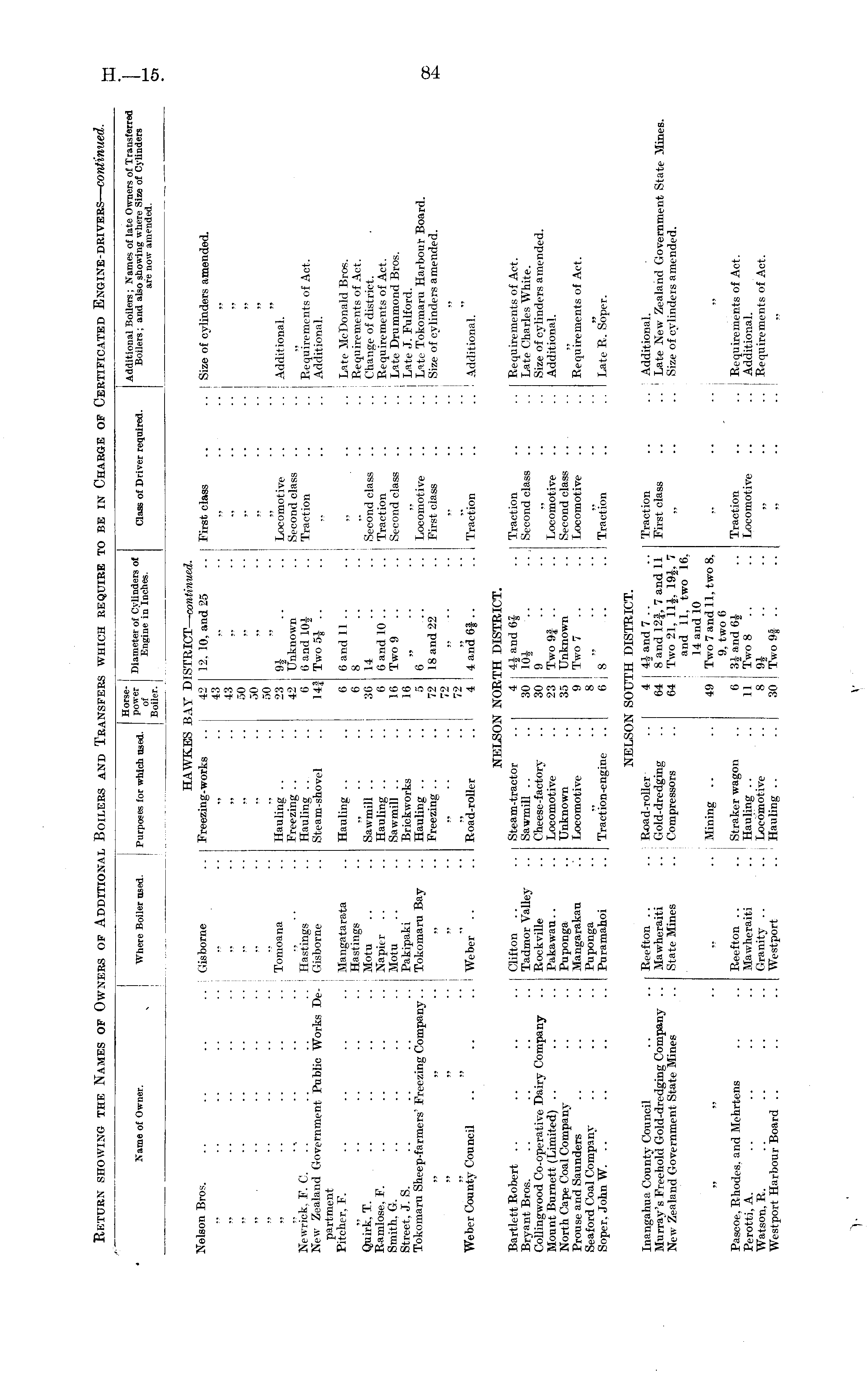 Name of Owner. i Where Boiler used. Purposes for which used. Horsepower Diameter of Cylinders of of Engine in Inches. Boiler. Class of Driver required. Additional Boilers ; Names of late Owners of Transferred Boilers ; and also showing where Size of Cylinders are now amended. Nelson Bros. .. .. .. .. I Gisborne HAWKES 1 .. I Freezing-works AT DISTRICT— continued. 42 12, 10. and 25 43 43 50 50 .50 23 9$ 42 Unknown 6 6 and 10$ 14f Two 5$ First class .. | Size of cylinders amended. .. I ,. - ,, .. .. .. .. Tomoana Newriek. F. C. .. .. .. .. Hastings New Zealand Government Public Works De- ; Gisborne partment Pitcher. F. .. .. .. .. j Mangatarata .. ! Hastings Quirk. T. .. .. .. .. j Motu Ramlose, F. .. .. .. .. I Napitr Smith. G. .. .. .. .. Motu Street, J. S. .. .. .. .. Pakipaki Tokomaru Sheep-farmers' Freezing Company.. Tokomaru Bay Hauling Freezing Hauling Steam-shovel Hauling Sawmill Hauling Sawmill Brickworks Hauling Freezing .. 6 6 and 11.. 6 8 .. .. ; 36 14 6 6 and 10 .. 16 Two 9 .. 16 5 6 72 18 and 22 72 „ 72 4 4 and Of .. Locomotive Second class Traction Second class Traction Second class Locomotive First class Additional. Requirements of ActAdditional. .. ! Late McDonald Bros. .. j Requirements of Act. Change of district. .. ! Requirements of Act. .. i Late Drummond Bros. .. Late J. Fulford. .. j Late Tokomaru Harbour Board. .. ! Size of cylinders amended. Weber County Council .. .. .. I Weber .. I Road-roller Traction .. ' Additional. NELSO. f NORTH DISTRICT. 4 4$ and 6$ 30 10$ 30 9 23 Two9| .. 35 Unknown 9 Two 7 .. 8 I 6 j 8 Traction Second class Locomotive Second class Locomotive Requirements of Act. Late Charles White. Size of cylinders amended. Additional. Requirements of Act. Bartlett Robert .. .. .. .. Clifton .. Bryant Bros. .. .. .. .. Tadmor Valley Collingwood Co-operative Dairy Company .. Rockville Mount Burnett (Limited) .. .. .. Pakawau.. North Cape Coal Company .. .. Puponga Prouse and Saunders .. .. .. Mangarakau Seaford Coal Company .. .. .. Puponga Soper, John W. .. .. .. .. Puramahoi Steam-tractor Sawmill Cheese-factory Locomotive Unknown Locomotive Traction-engine Traction . . I Late R. Soper. nelso: I SOUTH DISTRICT. Traction First class .. I Additional. .. I Late New Zealand Government State Mines. Size of cylinders amended. Inangahua County Council .. .. Reefton .. Murray's Freehold Gold-dredging Company- .. Mawheraiti New Zealand Government State Mines .. State Mines Road-roller .. j Gold-dredging Compressors 4 41 and 7 .. 64 8"and 12f, 7 and 11 64 Two 21, 11$, 191. 7 and 11, two 16. 14 and 10 49 Two 7 and 11, two 8. 9. two 0 6 31 and 6$ 1 1 Two 8 .. 8 91 30 Two 9f .. Mining | Pascoe, Rhodes, and Mehrtens .. .. Reefton .. Perotti, A. .. .. .. .. Mawheraiti Watson, R. .. .. .. .. Granity .. Westport Harbour Board .. .. .. Westport .. j Straker wagon Hauling Locomotive Hauling Traction Locomotive .. j Requirements of Act. .. ! Additional. .. I Requirements of Act.