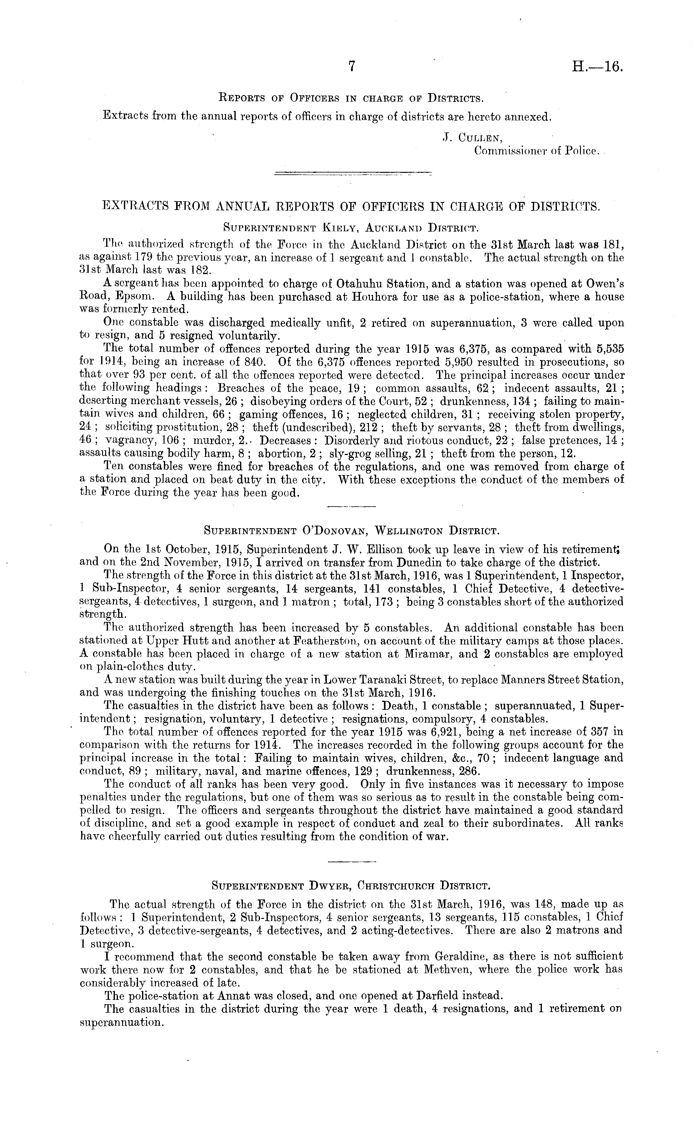 EXTRACTS FROM ANNUAL REPORTS OF OFFICERS IN CHARGE OF DISTRICTS. Superintendent Kiely, Auckland District. The authorized strength of the Force in the Auckland District on the 31st March last was 181, as against 179 the previous year, an increase of 1 sergeant and I constable. The actual strength on the 31st March last was 182. A sergeant has been appointed to charge of Otahuhu Station, and a station was opened at Owen's Road, Epsom. A building has been purchased at Houhora for use as a police-station, where a house was formerly rented. One constable was discharged medically unfit, 2 retired on superannuation, 3 were called upon to resign, and 5 resigned voluntarily. The total number of offences reported during the year 1915 was 6,375, as compared with 5,535 for 1914, being an increase of 840. Of the 6,375 offences reported 5,950 resulted in prosecutions, so that over 93 per cent, of all the offences reported were detected. The principal increases occur under the following headings : Breaches of the peace, 19 ; common assaults, 62 ; indecent assaults, 21 ; deserting merchant vessels, 26 ; disobeying orders of the Court, 52 ; drunkenness, 134 ; failing to maintain wives and children, 66 ; gaming offences, 16 ; neglected children, 31 ; receiving stolen property, 24 ; soliciting prostitution, 28 ; theft (undcscrfbed), 212 ; theft by servants, 28 ; theft from dwellings, 46 ; vagrancy, 106 ; murder, 2.- Decreases : Disorderly and riotous conduct, 22 ; false pretences, 1.4 ; assaults causing bodily harm, 8 ; abortion, 2 ; sly-grog selling, 21 ; theft from the person, 12. Ten constables were fined for breaches of the regulations, and one was removed from charge of a station and placed on beat duty in the city. With these exceptions the conduct of the members of the Force during the year has been good.