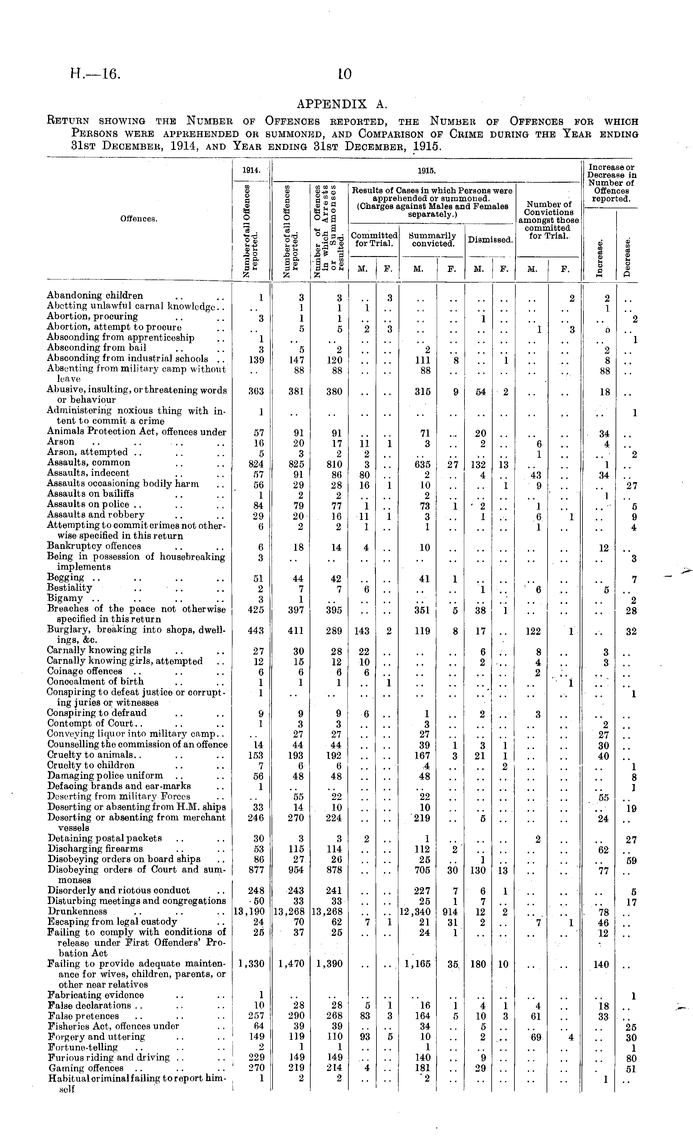 APPENDIX A. Return showing the Number of Offences reported, the Number of Offences for which Persons were apprehended or summoned, and Comparison of Crime during the Year ending 31st December, 1914, and Year ending 31st December, 1915.