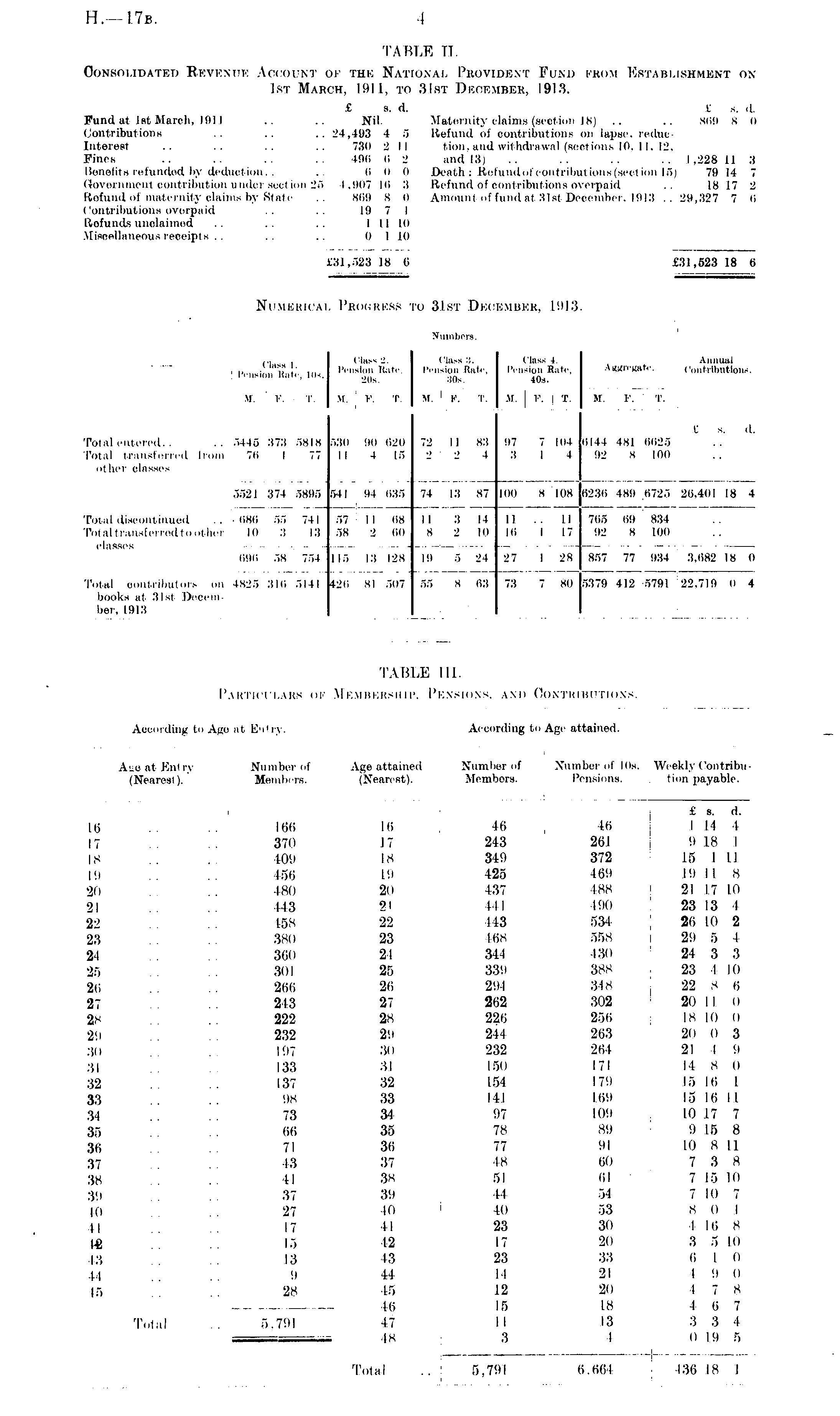 Numbers. rti QQH i Class 2. Class 3. Class 4. , , Animal Ponoioi Botn mo Pension Hate, Pension Rate, Pension Bate, Aggregate. Contributions. I jreiision .twite, xys, 2 0». 80s. 40s. M. | F. | T. M. | F. | T. M. V. T. M. j F. 'I'. M. j F. i T. £ s. d. Total entered,. . .. 5445 373 5818 530 i 90 020 72 1 ] 83 97 j 7 104 0144 48] 6625 Total transferred from 76 I j 77 11. 4 j 15 2 2 4 3 | I 4 92 8 100 other classes ■ ,l_ 5521 374 5895 541 94 635 74 13 87 100 8 108 6236 489 6725 26,401 18 4 Total discontinued .. -686 55 741 57 I I 68 11 3 14 11 .. 11 765 69 834 Total transferred to other 10 13 58 2 60 8 2 10 16 i 17 92 8 100 classes ; — 696 58 754 115 S 13 128 1 9 5 2 4 2 7 1 2 8 857 77 934 3,682 1 8 0 Total contributors on 4825 316 5141 426 j 81 507 55 8 63 73 7 80 5379 412 5791 22,719 0 4 books at 31st December, 1913 __ '• 1 I i L _ _ _ J