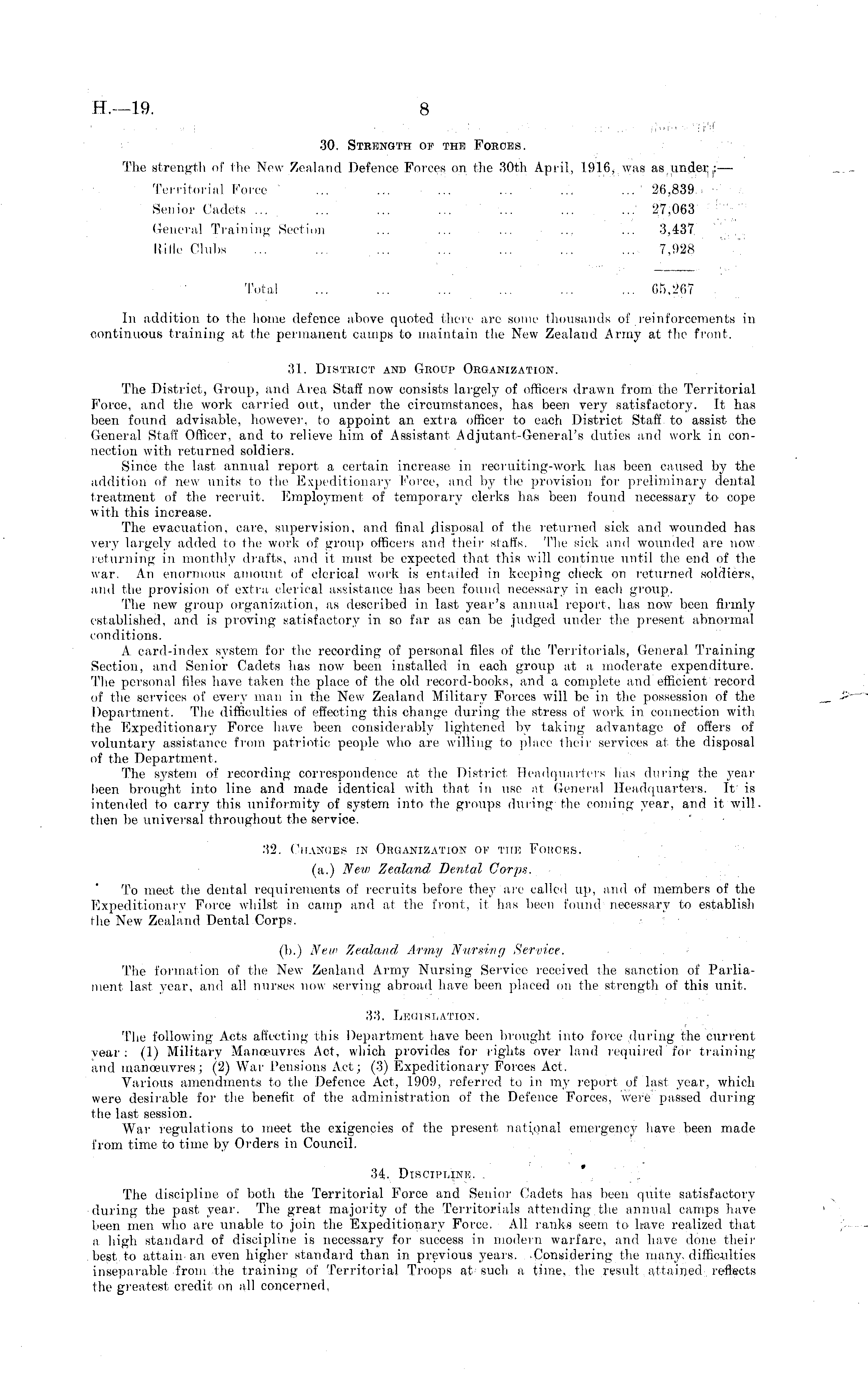30. Strength of the Forces. The strength of the New Zealand Defence Forces on the 30th April, 1916, was as under; — Territorial Force ... ... ... ... ... ... ' 26,839 , Senior Cadets ... ... ... ... ... ... ...' 27,063 Genera] Training Seel inn ... ... ... ... ... 3,437, Rifle Clubs ... ... ... ... ... 7,928 Total ... ... ... ... ... ... 65,267 In addition to the home defence above quoted there are some thousands of reinforcements in continuous training at the permanent camps to maintain the New Zealand Army at the front. 31. District and Group Organization. The District, Group, and Area Staff now consists largely of officers drawn from the Territorial Force, and the work carried out, under the circumstances, has been very satisfactory. It has been found advisable, however, to appoint an extra officer to each District Staff to assist the General Staff Officer, and to relieve him of Assistant Adjutant-General's duties and work in connection with returned soldiers. Since the last annual report a certain increase in recruiting-work has been caused by the addition of new units to the Expeditionary Force, and by the provision for preliminary dental treatment of the recruit. Employment of temporary clerks has been found necessary to cope with this increase. The evacuation, care, supervision, and final disposal of the returned sick and wounded has very largely added to the work of group officers and their si all's. The sick and wounded are now returning in monthly drafts, and it must be expected that this will continue until the end of the war. An enormous amount of clerical work is entailed in keeping check on returned soldiers, and the provision of extra clerical assistance has been found necessary in each group. The new group organization, as described in last year's annual report, has now been firmly established, and is proving satisfactory in so far as can be judged under the present abnormal conditions. A card-index system for the recording of personal files of the Territorials, General Training Section, and Senior Cadets has now been installed in each group at a moderate expenditure. The personal files have taken the place of the old record-books, and a, complete and efficient record of the services of every man in the New Zealand Military Forces will be in the possession of the Department. The difficulties of effecting this change during the stress of work in connection with the Expeditionary Force have been considerably lightened by taking advantage of offers of voluntary assistance from patriotic people who are willing to place their services at the disposal of the Department. The system of recording correspondence at (lie District Headquarters has during the year been brought into line and made identical with that in use at General Headquarters. It is intended to carry this uniformity of system into the groups during the coining year, and it will then be universal throughout the service. 32. Changes in Organization ok the Forces'. (a.) New Zealand Dental Corps. To meet the dental requirements of recruits before they arc called up, ami of members of the Expeditionary Force whilst in camp and al the front, it lias been found necessary to establish the New Zealand Dental Corps. (b.) New Zealand Army Nursing Sernice. The formation of the New Zealand Army Nursing Service received the sanction of Parliament last year, and all nurses now serving abroad have been placed on the strength of this unit. 33. Legislation". The following Acts affecting this Department have been brought into force during the current year: (1) Military Manoeuvres Act, which provides for rights over land required'for training and manoeuvres; (2) War Pensions Act; (3) Expeditionary Forces Act. Various amendments to the Defence Act, 1909, referred to in my report of last, year, which were desirable for the benefit of the administration of the Defence Forces, were passed during the last session. War regulations to meet the exigencies of the present national emergency have been made from time to time by Orders in Council. 34. Discipline, The discipline of both the Territorial Force and Senior Cadets has been quite satisfactory during the past year. The great majority of the Territorials attending the annual camps have been men who are unable to join the Expeditionary Force. All ranks seem to have realized that a high standard of discipline is necessary for success in modern warfare, and have done their best to attain an even higher standard than in previous years. Considering the many, difficulties inseparable from the training of Territorial Troops at such a time, the result attained reflects the greatest credit on all concerned,