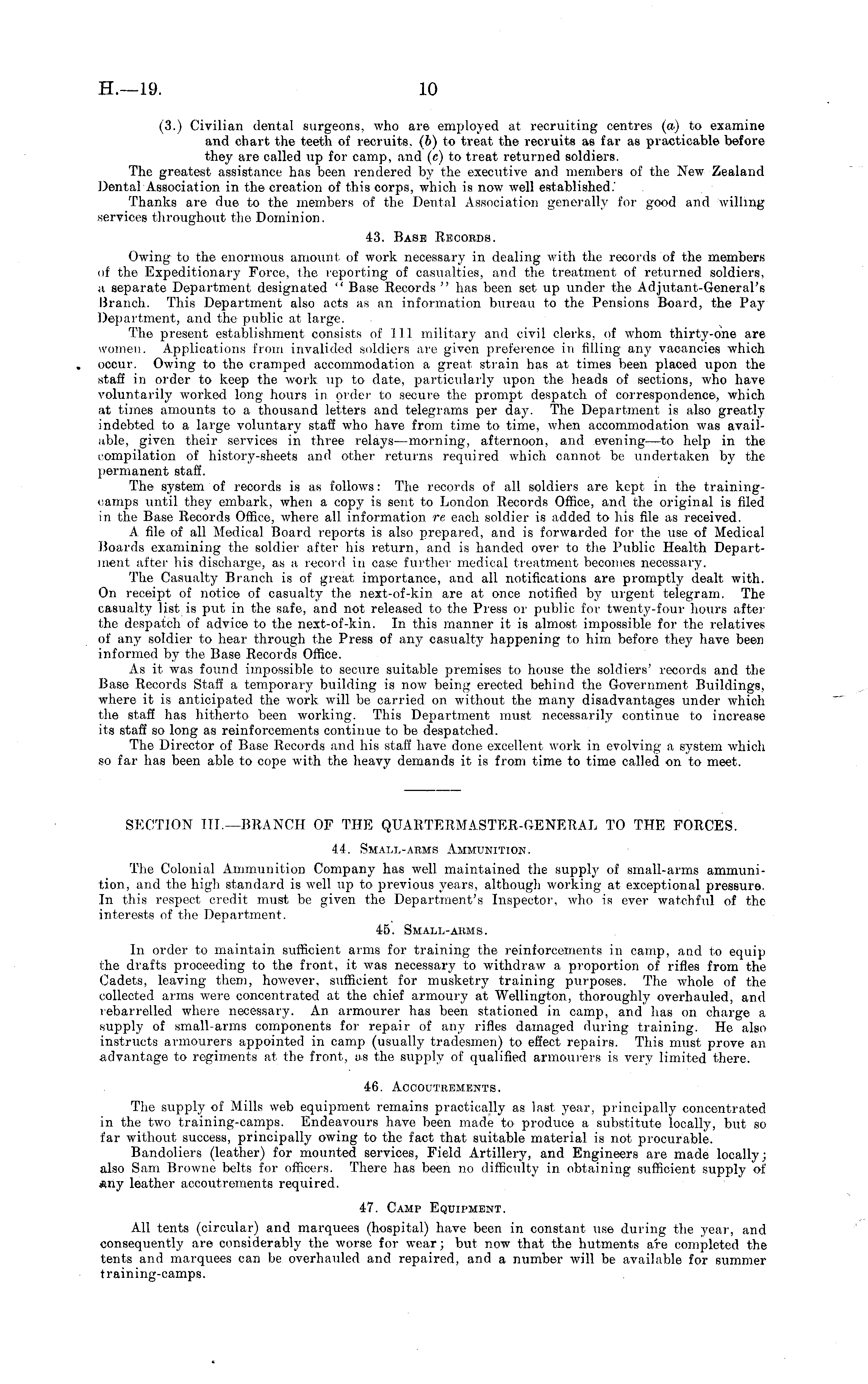 (3.) Civilian dental surgeons, who are employed at recruiting centres (a) to examine and chart the teeth of recruits, (b) to treat the recruits as far as practicable before they are called up for camp, and (c) to treat returned soldiers. The greatest assistance has been rendered by the executive and members of the New Zealand Dental Association in the creation of this corps, which is now well established.' Thanks are due to the members of the Dental Association generally for good and willing services throughout the Dominion. 43. Base Records. Owing to the enormous amount, of work necessary in dealing with the records of the members of the Expeditionary Force, the reporting of casualties, and the treatment of returned soldiers, a separate Department designated " Base Records " has been set up under the Adjutant-General's Branch. This Department also acts as an information bureau to the Pensions Board, the Pay Department, and the public at large. The present establishment consists of 111 military and civil clerks, of whom thirty-one are women. Applications from invalided soldiers are given preference in filling any vacancies which occur. Owing to the cramped accommodation a great strain has at times been placed upon the staff in order to keep the work up to date, particularly upon the heads of sections, who have voluntarily worked long hours in order to secure the prompt despatch of correspondence, which at times amounts to a thousand letters and telegrams per day. The Department is also greatly indebted to a large voluntary staff who have from time to time, when accommodation was available, given their services in three relays' —morning, afternoon, and evening—to help in the compilation of history-sheets and other returns required which cannot be undertaken by the permanent staff. The system of records is as follows: The records of all soldiers are kept in the trainingcamps until they embark, when a copy is sent to London Records Office, and the original is filed in the Base Records Office, where all. information re each soldier is added to his file as received. A file of all Medical Board reports is also prepared, and is forwarded for the use of Medical Boards examining the soldier after his return, and is handed over to the Public Health Department after his discharge, as a record in case further medical treatment becomes necessary. The Casualty Branch is of great importance, and all notifications are promptly dealt with. On receipt of notice of casualty the next-of-kin are at once notified by urgent telegram. The casualty list is put in the safe, and not released to the Press or public for twenty-four hours after the despatch of advice to the next-of-kin. In this manner it is almost impossible for the relatives of any soldier to hear through the Press of any casualty happening to him before they have been informed by the Base Records Office. As it was found impossible to secure suitable premises to house the soldiers' records and the Base Records Staff a temporary building is now being erected behind the Government Buildings, where it is anticipated the work, will be carried on without the many disadvantages under which the staff has hitherto been working. This Department must necessarily continue to increase its staff so long as reinforcements continue to be despatched. The Director of Base Records and his staff have done excellent work in evolving a system which so far has been able to cope with the heavy demands it is from time to time called on to meet.
