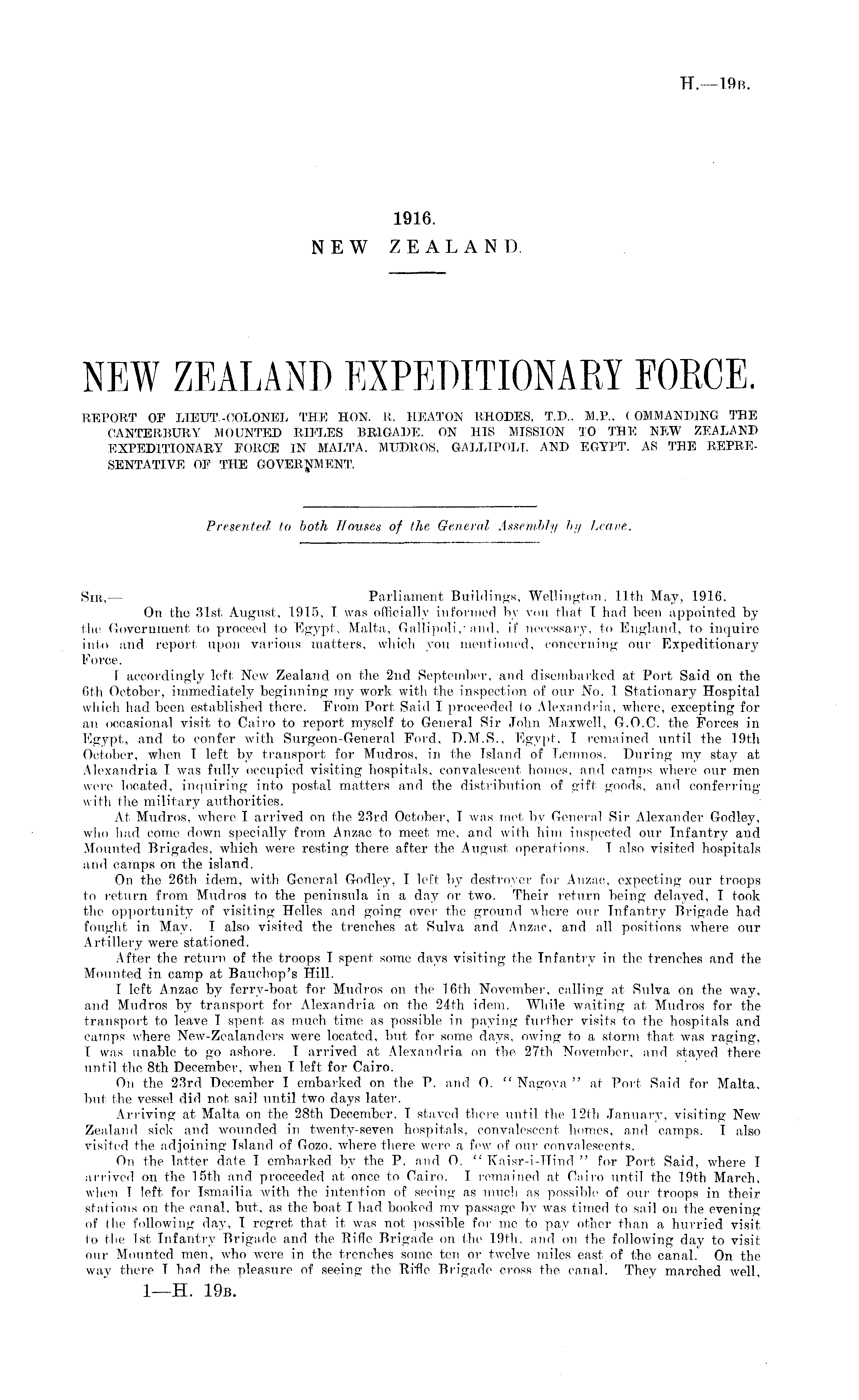 NEW ZEALAND EXPEDITIONARY FORCE. REPORT OF LIEUT.-COLONEL THE HON. R. HEATON RHODES, T.D., M.P.. COMMANDING THE CANTERBURY MOUNTED RIFLES BRIGADE, ON HIS MISSION TO THE NEW ZEALAND EXPEDITIONARY FORCE IN MALTA, MUDROS, GALLIPOLI, AND EGYPT, AS THE REPRESENTATIVE OF THE GOVERNMENT.