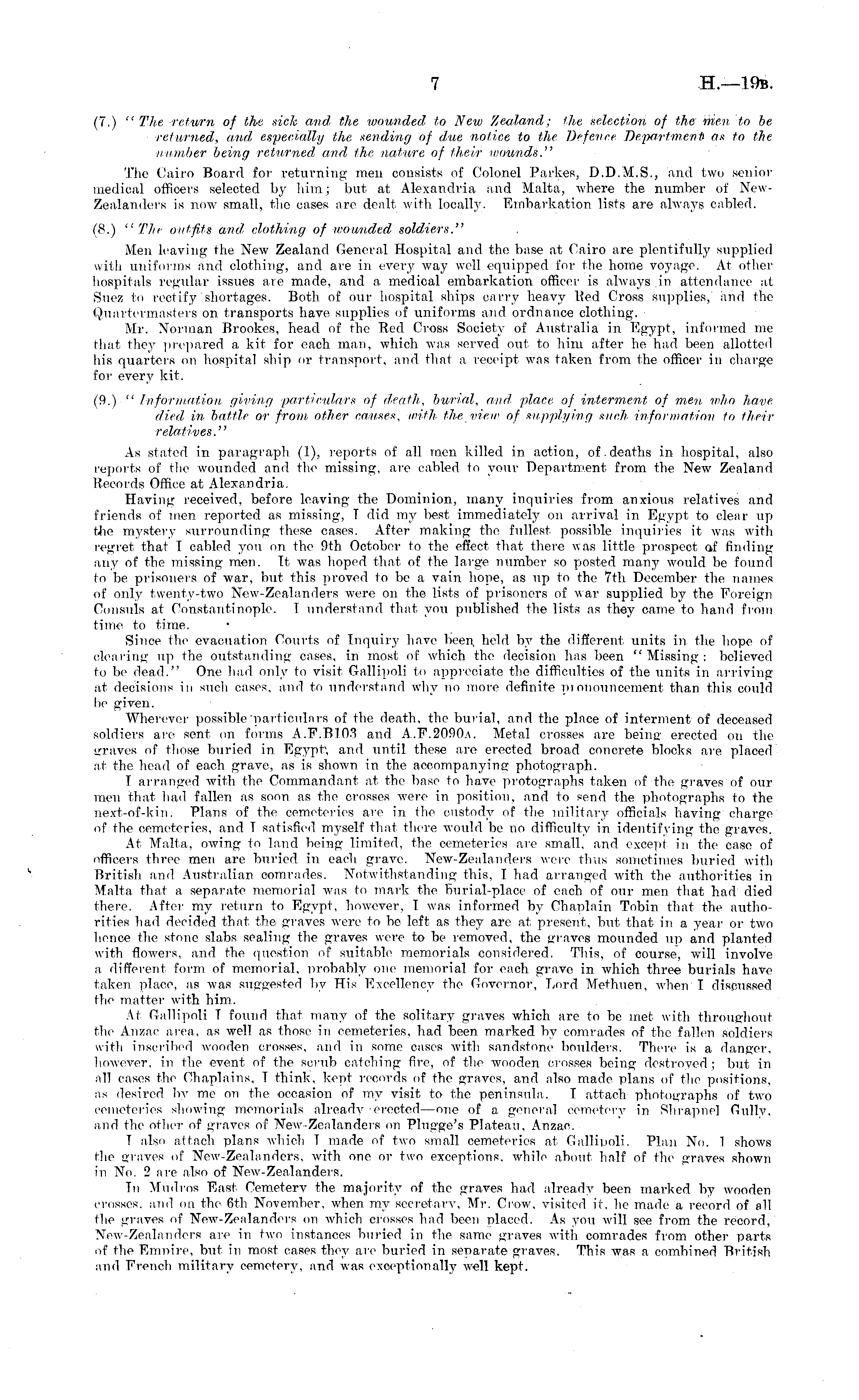 (7.) "The, return of the sick and the wounded to Ncto Zealand; the selection of the men to be returned, and, especially the sending of due notice to the Defence Department as to the number being returned and the nature of their wounds." The Cairo Board for returning men consists of Colonel Parkes, D.D.M.8., and two senior medical officers selected by him; but at Alexandria and Malta, where the number of NewZealamlers is now small, the eases are dealt, with locally. Embarkation lists are always cabled. (8.) " Tin outfits and clothing of wounded soldiers." Men leaving the New Zealand General Hospital and the base at Cairo are plentifully supplied with uniforms and clothing, and are in every way well equipped for the home voyage. At other hospilals regular issues are made, and a medical embarkation, officer is always in attendance at Suez to rectify shortages. Both of our hospital ships carry heavy Red Cross supplies, and the Quartermasters on transports have supplies of uniforms and ordnance clothing. Mr. Norman Brookes, head of the Red Cross Society of Australia in Egypt, informed me that they prepared a kit for each man, which was served out to him after he had been allotted his quarters on hospital ship or transport, and that a receipt was taken from the officer in charge for every kit. (9.) " Information, giving particulars of death, burial, and place of interment of men who have diid in battle or from other causes, with the view of supplying such informal inn to their relatives." As stated in paragraph (1), reports of all men killed in action, of.deaths in hospital, also reports of the wounded and the missing, are cabled to your Department from the New Zealand Records Office at Alexandria. Having received, before leaving the Dominion, many inquiries from anxious relatives and friends of men reported as missing, T did my best immediately cut arrival in Egypt to clear up the mystery surrounding these eases. After making the fullest possible inquiries it, was with regret that T cabled you on the 9th October to the effect, that there was little prospect of finding any of the missing men. It was hoped that of the large number so posted manjr would be found to be prisoners of war, but this proved to be a vain hone, as up to the 7th December the names of only twenty-two New-Zealanders wore on the lists of prisoners of war supplied by the Foreign Consuls at Constantinople. T understand that you published the lists as they came to hand from time to time. Since the evacuation Courts of Inquiry have been held by the different units in the hope of clearing up the outstanding cases, in most of which the decision lias been "Missing: believed to be dead." One had only (o visit, Gallipoli to appreciate the difficulties of the units in arriving at decisions in such cases, and to understand why no more definite pionouncement than this could be given. Wherever possible'particulars of the death, the burial, and the place of interment of deceased soldiers are sent on forms A.F.BIOS and A.F.2090,\. Metal crosses are being erected on the trraves of those buried in Egypt, and until these are erected broad concrete blocks are placed at the head of each grave, as is shown in the accompanying photograph. T arranged with the Commandant at, the base to have protographs taken of the graves of our men that had fallen as soon as the crosses were in position, and to send the photographs to the next-of-kin. Plans of the cemeteries are in the custody of the military officials having charge of the cemeteries, and T satisfied myself that there would be no difficulty in identifying the graves. At Malta, owing to land being limited, the cemeteries are small, and except in the Case of officers three men are buried in each grave. New-Zealanders were thus sometimes buried with British and Australian comrades. Notwithstanding this, I had arranged with the authorities in Malta that a separate memorial was Io mark the burial-place of each of our men that had died there. After my return to Egypt, however, I was informed by Chaplain Tobin that the authorities had decided that the graves were to be left as they are at; present, but that in a year or two hence the stone slabs sealing the graves were to be removed, the graves mounded up and planted with flowers, and the question of suitable memorials considered. This, of course, will Involve a different form of memorial, probably one memorial for each grave in which three burials havetaken place, as was suggested by His Excellency the Governor, Lord Methuen, when T discussed the matter with him.. At Gallipoli T found that many of the solitary graves which are to be met with throughout the Anzac area, as well as those in cemeteries, had been marked by comrades of the fallen soldiers with inscribed wooden crosses, and in some cases with sandstone boulders. There is a danger. however, in the event of the scrub catching fire, of the wooden crosses being destroyed ; but in all cases the Chaplains, T think, kept records of the graves, and also made plans of the positions. as desired by me on the occasion of my visit to the peninsula. T attach photographs of two cemeteries showing memorials already erected —one of a general cemetery in Shrapnel Cully, and the other of graves of New-Zealanders on Plugge's Plateau. Anzac. T also attach plans which I made of two small cemeteries at Gallipoli. Plan No. 1 shows the graves of New-Zealanders. with one or two exceptions, while about half of the graves shown in No. 2 are also of New-Zealanders. In Mudros East Cemetery the majority of the graves had already been marked by wooden crosses, ami on the 6th November, when my secretary, Mr. Crow, visited il, he made a record of all the graves of New-Zealanders on which crosses had been placed. As you will see from the record, New-Zealanders are in two instances buried in the same graves with comrades from other parts of (lie Empire, but in most cases they are buried in separate graves. This was a combine