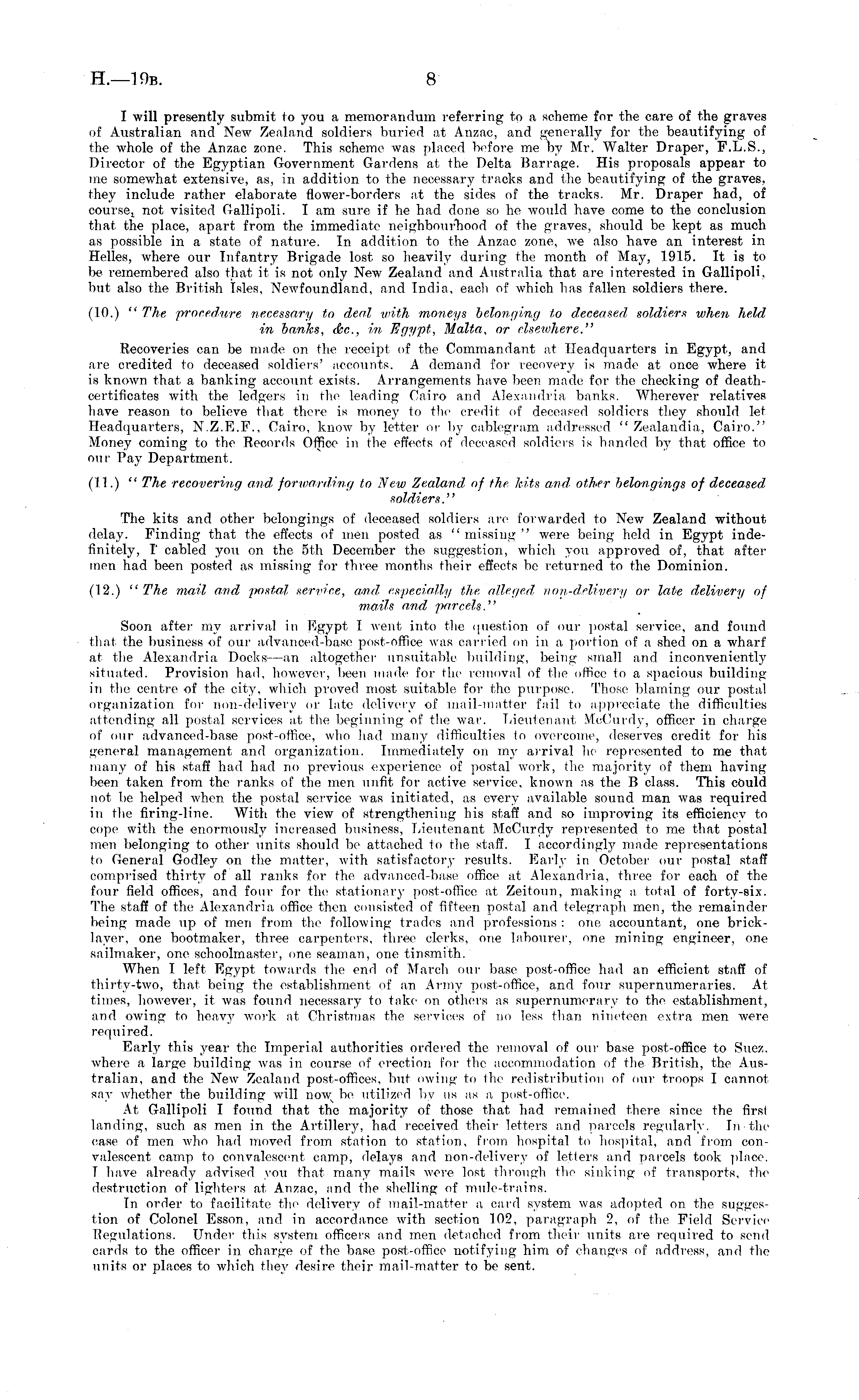 I will presently submit to you a memorandum referring to a scheme for the care of the graves of Australian and New Zealand soldiers buried at Anzac, and generally for the beautifying of the whole of the Anzac zone. This scheme was placed before me by Mr. Walter Draper, F.L.S., Director of the Egyptian Government Gardens at the Delta Barrage. His proposals appear to me somewhat extensive, as, in addition to the necessary tracks and the beautifying of the graves, they include rather elaborate flower-borders at the sides of the tracks. Mr. Draper had, of course! not visited Gallipoli. I am sure if he had done so he would have come to the conclusion that the place, apart from the immediate neighbournood of the graves, should be kept as much as possible in a state of nature. In addition to the Anzac zone, we also have an interest in Helles, where our Infantry Brigade lost so heavily during the month of May, 1915. It is to be remembered also that it is not only New Zealand and Australia that are interested in Gallipoli, but also the British Isles, Newfoundland, and India, each of which has fallen soldiers there. (10.) " The procedure necessary to deal with moneys belonging to deceased soldiers when held in banks, dec, in Egypt, Malta, or elsewhere." Recoveries can be made on the receipt of the Commandant at Headquarters in Egypt, and are credited to deceased soldiers' accounts. A demand for recovery is made at once where itis known that a banking account exists. Arrangements have been made for the checking of deathcertificates with the ledgers in the leading Cairo and Alexandria banks. Wherever relatives have reason to believe that there is money to the credit of deceased soldiers they should let Headquarters, N.Z.E.F., Cairo, know by letter or by cablegram addressed " Zealandia, Cairo." Money coming to the Records Office in the effects of deceased soldiers is handed by that office to our Pay Department. (11.) " The recovering and, forwarding to New Zealand of the kits and, other belongings of deceased, soldiers." The kits and other belongings of deceased soldiers are forwarded to New Zealand without delay. Finding that the effects of men posted as " missing " were being held in Egypt indefinitely, I cabled you on the sth December the suggestion, which you approved of, that after men had been posted as missing for three months their effects be returned to the Dominion. (12.) "The mail and postal service, avid especially the alleged non-delivery or late delivery of mails and parcels." Soon after my arrival in Egypt I went into the question of our postal service, and found that the business of our advanced-base post-office was carried on in a portion of a shed on a wharf at the Alexandria Docks —an altogether unsuitable building, being small and inconveniently situated. Provision had, however, been made for the removal of the office to a spacious building in the centre of the city, which proved most suitable for the purpose. Those blaming our postal organization for non-delivery or late delivery of mail-matter fail to appreciate the difficulties attending all postal services at the beginning of the war. Lieutenant McCurdy, officer in charge of our advanced-base post-office, who had many difficulties to overcome, deserves credit for his general management and organization. Immediately on my arrival he represented to me that many of his staff had had no previous experience of postal work, the majority of them having been taken from the ranks of the men unfit for active service, known as the B class. This could not be helped when the postal service was initiated, as every available sound man was required in the firing-line. With the view of strengthening his staff and so improving its efficiency to cope with the enormously increased business, Lieutenant McCurdy represented to me that postal men belonging to other units should be attached to the staff. I accordingly made representations to General Godley on the matter, with satisfactory results. Early in October our postal staff comprised thirty of all ranks for the advanced-bast! office at Alexandria, three for each of the four field offices, and four for the stationary post-office at, Zeitoun, making a total of forty-six. The staff of the Alexandria office then consisted of fifteen postal and telegraph men, the remainder being made up of men from the following trades and professions : one accountant, one bricklayer, one bootmaker, three carpenters, three clerks, one labourer, one mining engineer, one sailmaker, one schoolmaster, one seaman, one tinsmith. When I left Egypt, towards the end of March our base post-office had an efficient staff of thirty-two, that being the establishment of an Army post-office, and four supernumeraries. At times, however, it was found necessary to take on others as supernumerary to the establishment, and owing to heavy work at Christmas the services of no less than nineteen extra men were required. Early this year the Imperial authorities ordered the removal of our base post-office to Suez, where a large building was in course of erection for the accommodation of the British, the Australian, and the New Zealand post-offices, but owing to the redistribution of our troops I cannot say whether the building will now be utilized by us as a, post-office. At, Gallipoli T found that the majority of those that had remained there since the first landing, such as men in the Artillery, had. received their letters and parcels regularly. Tn the case of men who had moved from station to station, from hospital to hospital, and from convalescent camp to convalescent, camp, delays and non-delivery of letters and parcels took place, 1 have already advised you that many mails were lost through the sinking of transports, the destruction of lighters at, Anzac, and the shelling of mule-trains. In order to facilitate the delivery of mail-matter a card system was adopted on the suggestion of Colonel Esson, and in accordance with section 102