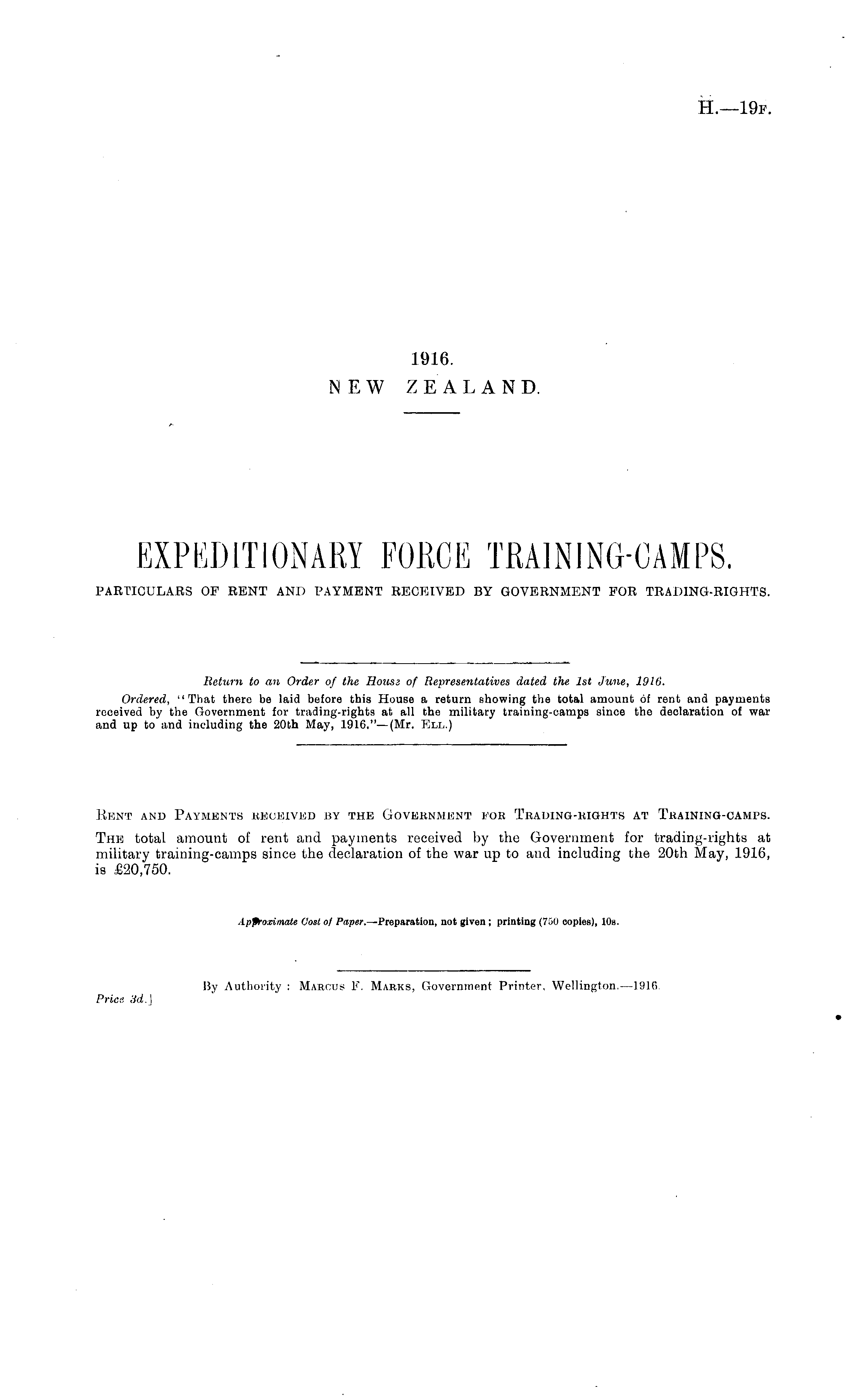 Return to an Order of the Houss of Representatives dated the Ist June, 1916. Ordered, "That there be laid before this House a return showing the total amount of rent and payments received by the Government for trading-rights at all the military training-camps since the declaration of war and up to and including the 20th May, 1916."—(Mr. Ell.)
