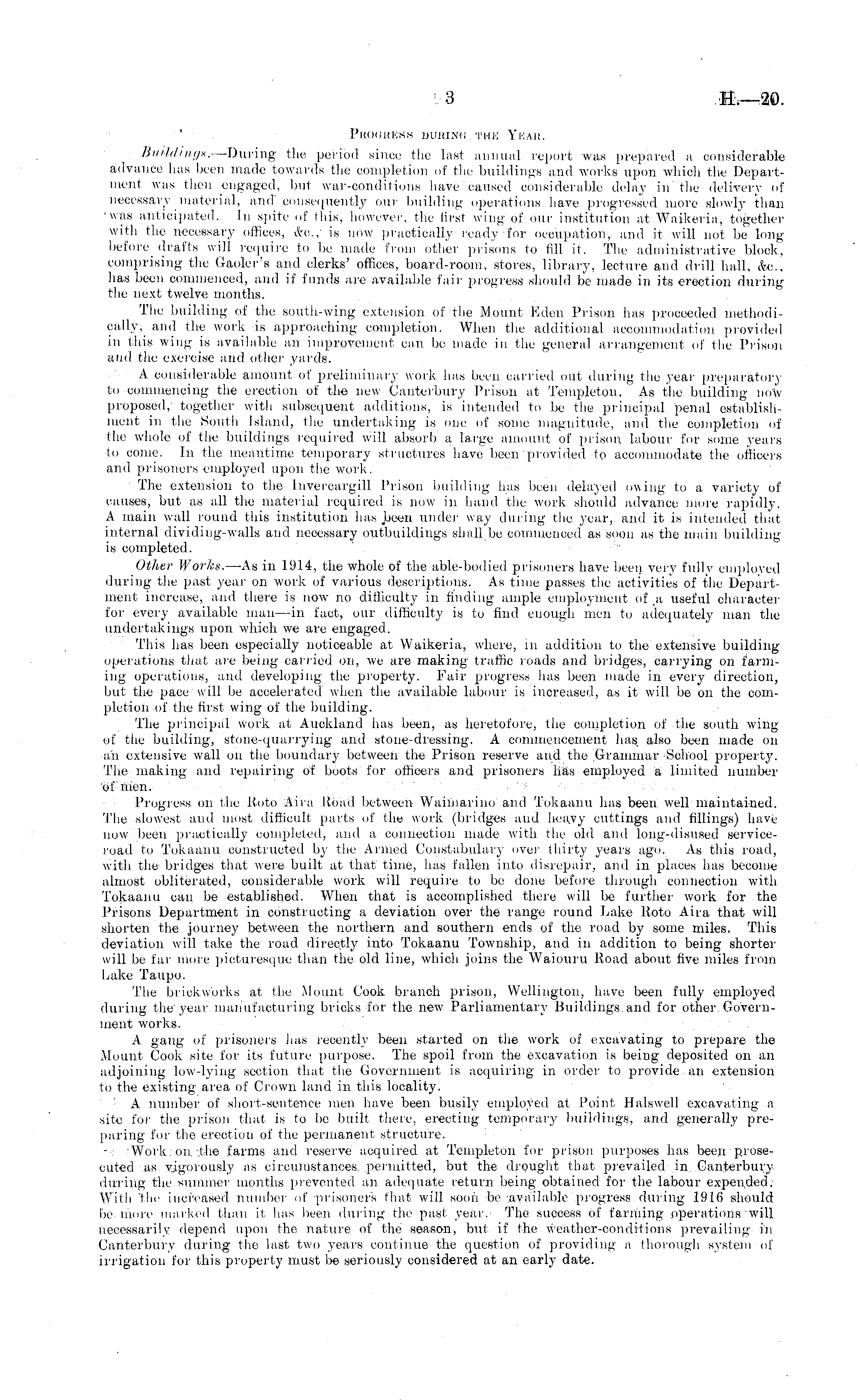 Progress during the Year. Buildings. — During the period since the last annual report was prepared a considerable advance has been made towards the completion ol' (lie buildings and works upon which the Department was then engaged, but war-conditions have Caused considerable delay in the delivery of necessary material, and consequently our building operations have progressed more slowly than -was anticipated. In spite of this', however, the first wing of our institution at Waikeria, together with the necessary offices, &v,., is now practically ready for occupation, and it will not be long before_ drafts will require to lie made from other prisons to till it. The administrative block, comprising the Gaoler's and clerks' offices, board-room, stores, library, lecture and drill hall, &c., has been commenced, and if funds are available fair progress should be made in its erection during the next twelve months. The building of the south-wing extension of the Mount. Eden Prison has proceeded methodically, and the work is approaching completion. When the additional accommodation provided in this wing is available an improvement can he made in the general arrangement ol' (In- Prison and the exercise and other yards. A considerable amount ol' preliminary work has been carried out during the year preparatory to commencing the erection of the new Canterbury Prison, at Templeton. As the building now proposed, together with subsequent additions, is intended to Ik- the principal penal establishment in the South Island, I he undertaking is one of some magnitude, and the completion of the whole of the buildings required will absorb a large amount of prison labour for some years to come. In the meantime temporary structures have been provided to accommodate the officers and prisoners employed upon the work. The extension to the Invercargill Prison building has been delayed owing to a variety of causes, but as all the material required is now in hand the work should advance more rapidly. A main wall round this institution has been under way during the year, and it is intended that internal dividing-walls and necessary outbuildings shall be commenced as soon as the main building is completed. Other Works. —As in 1914, the whole of the able-bodied prisoners have been very fully employed during the past year on work of various descriptions. As time passes the activities of the Department increase, and there is now no difficulty in finding ample employment of a useful character for every available man —in fact, our difficulty is to find enough men to adequately man the undertakings upon which we are engaged. This has been especially noticeable at Waikeria, where, in addition to the extensive building operations that are being carried on, we are making traffic roads and bridges, carrying on farming operations, and developing the property. Fair progress has been made in every direction, but the pace will be accelerated when the available labour is increased, as it will bo on the completion of the first wing of the building. The principal work at Auckland has been, as heretofore, i\m completion of the south wing of the building, stone-quarrying and stone-dressing. A commencement has also been made on ail extensive wall on the boundary between the Prison reserve and the Grammar School property. The making and repairing of boots for officers and prisoners lias employed a limited number of men. Progress on the Roto Aira Road between- Waimarino and Tokaanu has been well maintained. The slowest and most difficult parts of the work (bridges and heavy cuttings and fillings) have now been practically completed, and a connection made with the old and long-disused serviceroad to Tokaanu constructed by the Armed Constabulary over thirty years ago. As this road, with the bridges that were built at that time, has fallen into disrepair, ami in places has become almost obliterated, considerable work will require to be done before through connection with Tokaanu can be established. When that is accomplished there will be further work for the Prisons Department in constructing a deviation over the range round Lake Bote Aira that will shorten the journey between the northern and southern ends of the road by some miles. This deviation will take the road directly into Tokaanu Township, and in addition to being shorter will be fai- more picturesque than the old line, which joins the Waiouru Road about five miles from Lake Taupo. The brickworks at the Mount Cook branch prison, Wellington, have been fully employed during the' year.manufacturing bricks for the new Parliamentary Buildings and for other Government works. A gang of prisoners has recently been started on the work of excavating to prepare the Mount Cook site for its future purpose. The spoil from the excavation is being deposited on an adjoining low-lying section, that the Government is acquiring in order to provide an extension to the existing area of Crown land in this locality. A number of short-sentence men have been busily employed at Point Halswell excavating a site for the prison that is to be built there, erecting temporary buildings, and generally preparing for the erection of the permanent structure. -■; on. the farms and reserve acquired at Templeton for prison purposes lias been prosecuted as vigorously as circumstances, permitted, but the drought that prevailed in. Canterbury during the summer months prevented an adequate return being obtained for the labour expended. With the increased number of prisoners that will soon be available progress during 1916 should be more marked than il has been during the past year. The success of farming operations will necessarily depend upon the nature of the season, but if the weather-conditions prevailing in Canterbury during the last two years continue the question of providing a thorough system of irrigation for this property must be seriously considered at an early date.