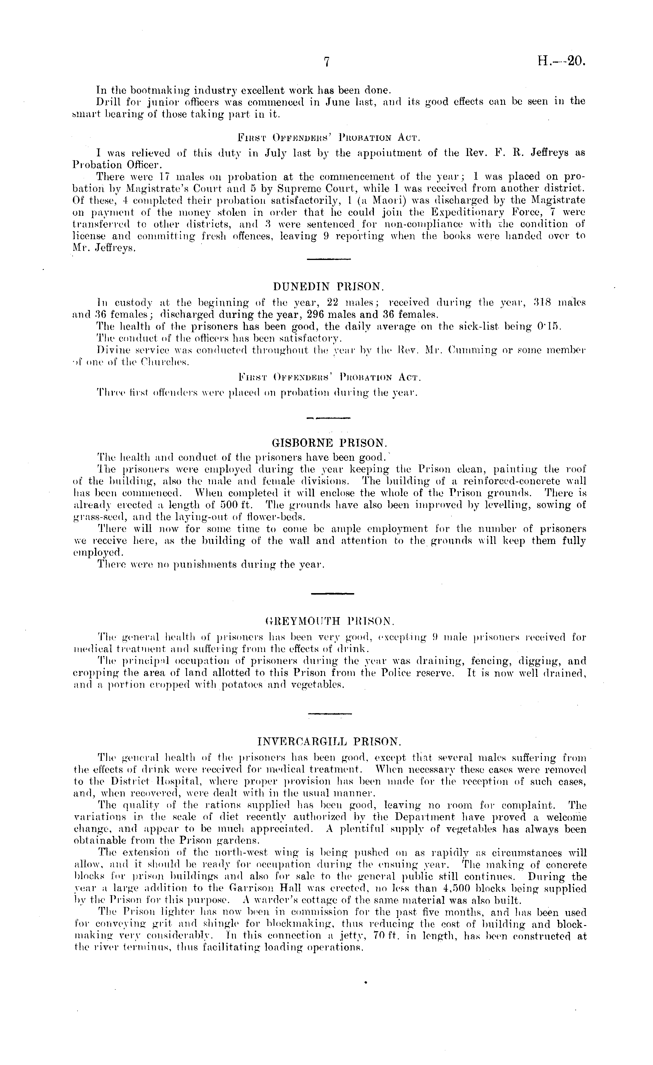In the bootmaking industry excellent work has been done. Drill for junior officers was commenced in June last, and its good effects can be seen in the smart bearing of those taking part in it. First Offenders' Probation Act. I was relieved of this duty in July last by the appointment of the Rev. F. R. Jeffreys as Probation Officer. There were 17 males on probation at the commencement of the year; 1 was placed on probation by Magistrate's Court and 5 by Supreme Court, while 1 was received from another district. Of these, 4 completed their probation satisfactorily, 1 (a Maori) was discharged by the Magistrate on payment of the money stolen in order that he could join the Expeditionary Force, 7 were transferred to other districts, and 3 were sentenced for non-compliance with die condition of license and committing fresh offences, leaving 9 reporting when the books were handed over to Mr. Jeffreys.