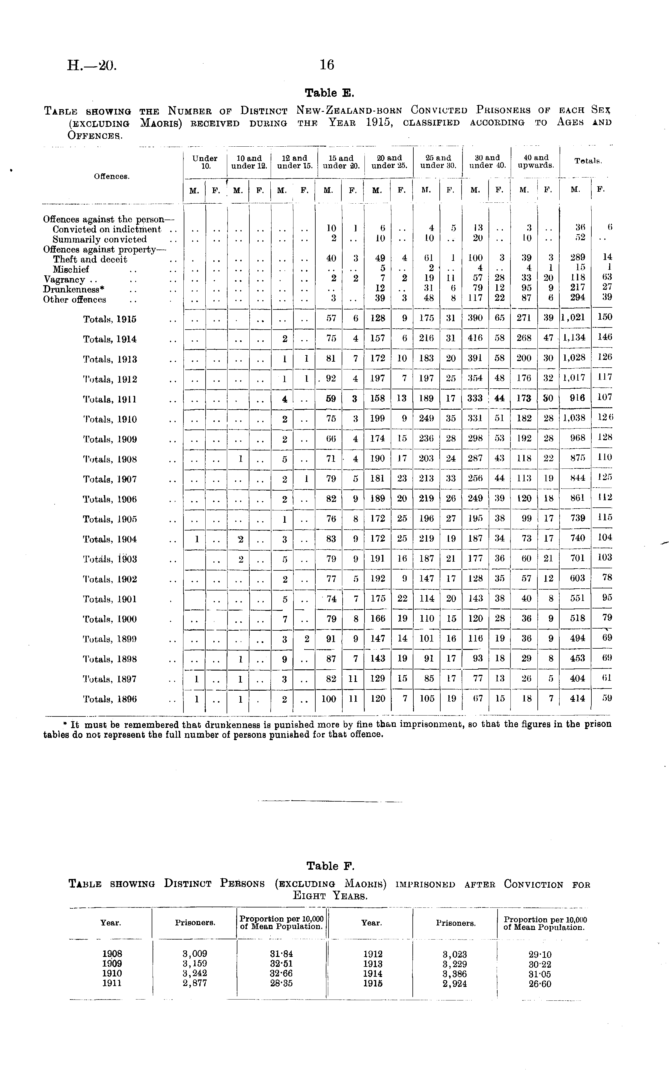 Table E. Table showing the Number of Distinct New-Zealand-born Convicted Prisoners of each Sex (excluding Maoris) received during the Year 1915, classified according to Ages and Offences.