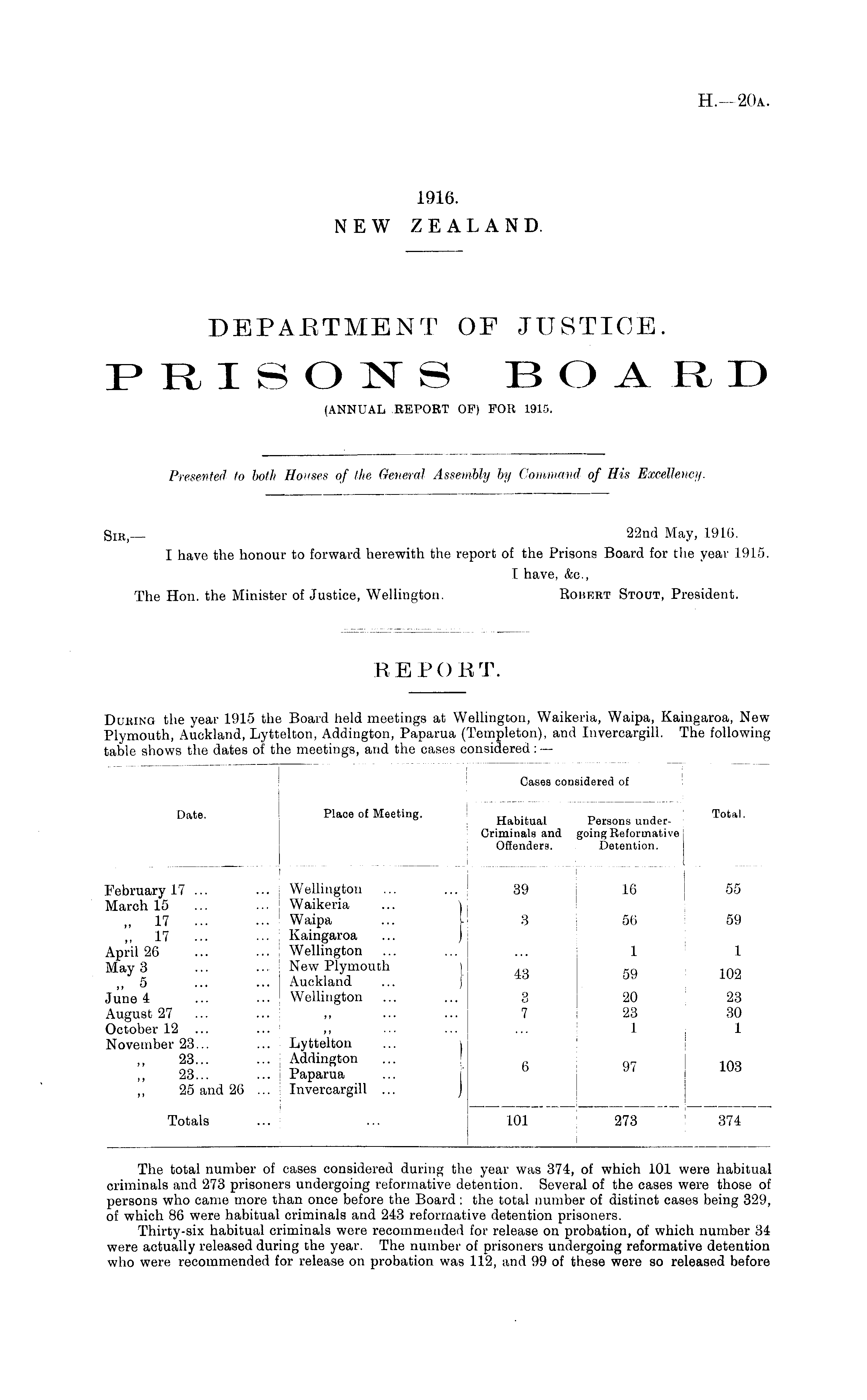 Sir,— 22nd May, 1916. I have the honour to forward herewith the report of the Prisons Board for the year 1915. I have, &c, The Hon. the Minister of Justice, Wellington. Eobert Stout, President.