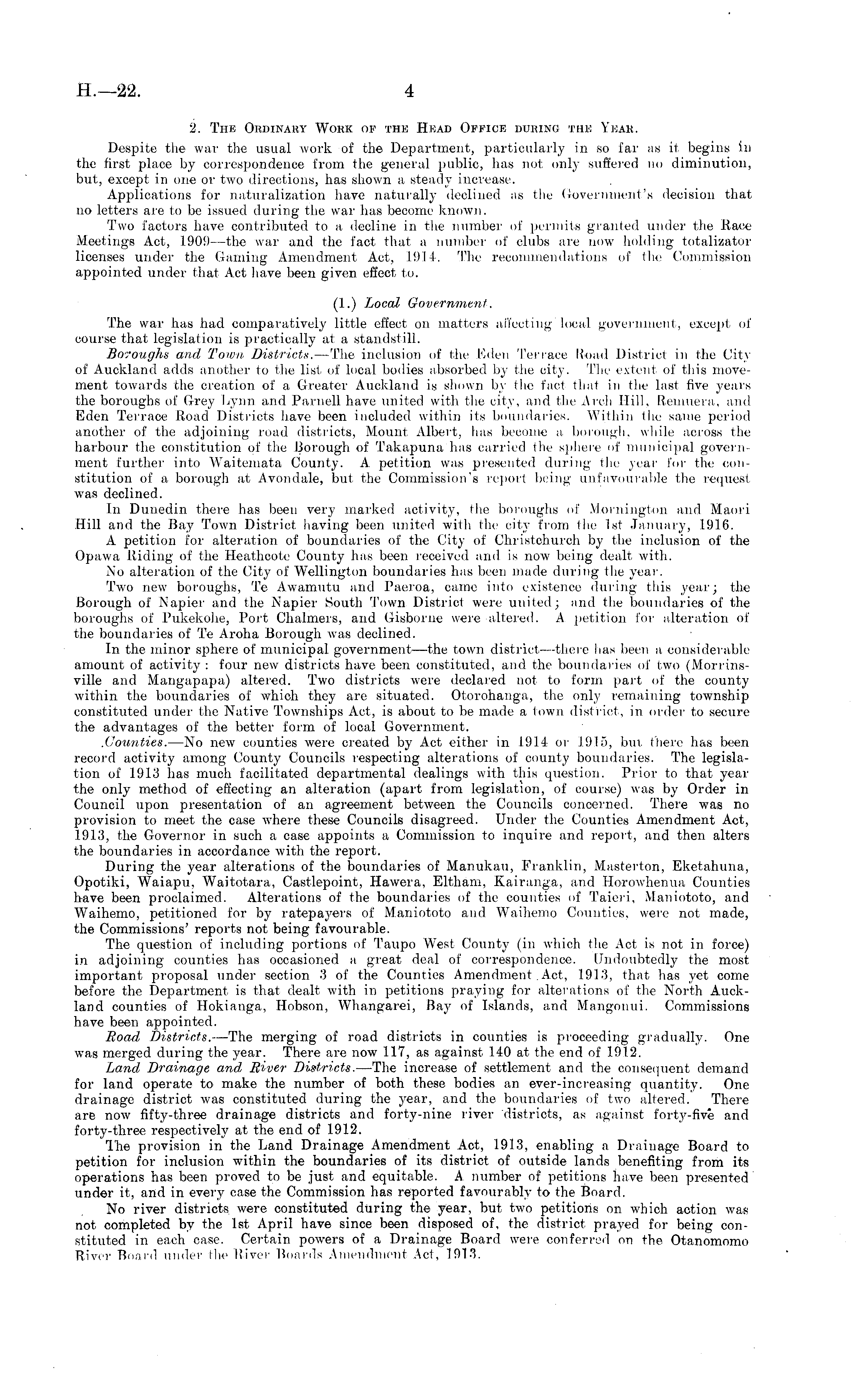 2. The Ordinary Work of the Head Office during the Year. Despite the war the usual work of the Department, particularly in so far as it begins in the first place by correspondence from the general public, has not only suffered no diminution, but, except in one or two directions, has shown a steady increase. Applications for naturalization have naturally declined as the Government's decision that no letters are to be issued during the war has become known. Two factors have contributed to a decline in the number of permits granted under the Race Meetings Act, 1909 —the war and the fact that a number of clubs are now holding totalizator licenses under the Gaming Amendment Act, 1914. The recommendations of the Commission appointed under that Act have been given effect to. (1.) Local Government. The war has had comparatively little effect on matters affecting local government, except of course that legislation is practically at a standstill. Boroughs and Town Districts. —The inclusion of the Eden Terrace Road District in the City of Auckland adds another to the list of local bodies absorbed by the city. The extent of this movement towards the creation of a Greater Auckland is shown by the fact that in the last five years the boroughs of Grey Lynn, and Paruell have united with the city, and the Arch Hill, Remueia, and Eden Terrace Road Districts have been included within its boundaries. Within the same period another of the adjoining road districts, Mount Albert, has become a borough, while across the harbour the constitution of the Borough of Takapuna has carried the sphere of municipal government further into Waitemata County. A petition was presented during the year for the constitution of a borough at Avondale, but the Commission's report being unfavourable the request was declined. In Dunedin there has been very marked activity, the boroughs of Moinington and Mauri Hill and the Bay Town District having been united with the city from I lie Ist January, 1916. A petition for alteration of boundaries of the City of Christchurch by the inclusion of the Opawa Riding of the Heathcote County has been received and is now being dealt with. No alteration of the City of Wellington boundaries has been made during the year. Two new boroughs, Te Awamutu and Paeroa, came into existence during this year; the Borough of Napier and the Napier South Town District were united; and the boundaries of the boroughs of Pukekohe, Port Chalmers, and Gisborue were altered. A petition for alteration of the boundaries of Te Aroha Borough was declined. In the minor sphere of municipal government—the town district—there has been a considerable amount of activity : four new districts have been constituted, and the boundaries of two (Morrinsville and Mangapapa) altered. Two districts were declared not to form part of the county within the boundaries of which they are situated. Otorohanga, the only remaining township constituted under the Native Townships Act, is about to be made a town district, in order to secure the advantages of the better form of local Government. .Counties. —No new counties were created by Act either in 1914 or 1915, bm. there has been record activity among County Councils respecting alterations of county boundaries. The legislation of 1913 has much facilitated departmental dealings with this question. Prior to that year the only method of effecting an alteration (apart from legislation, of course) was by Order in Council upon presentation of an agreement between the Councils concerned. There was no provision to meet the case where these Councils disagreed. Under the Counties Amendment Act, 1913, the Governor in such a case appoints a Commission to inquire and report, and then alters the boundaries in accordance with the report. During the year alterations of the boundaries of Manukau, Franklin, Masterton, Eketahuna, Opotiki, Waiapu, Waitotara, Castlepoint, Hawera, Eftham, Kairanga, and Horowhenua Counties have been proclaimed. Alterations of the boundaries of the counties of Taieri, Maniototo, and Waihemo, petitioned for by ratepayers of Maniototo and Waihemo Counties, were not made, the Commissions' reports not being favourable. The question of including portions of Taupo West County (in which the Act is not in force) in adjoining counties has occasioned a great deal of correspondence. Undoubtedly the most important proposal under section 3 of the Counties Amendment .Act, 1913, that has yet come before the Department is that dealt with in petitions praying for alterations of the North Auckland counties of Hokianga, Hobson, Whangarei, Bay of Islands, and Mangonui. Commissions have been appointed. Road Districts. —The merging of road districts in counties is proceeding gradually. One was merged during the year. There are now 117, as against 140 at the end of 1912. Land Drainage and, River Districts. —The increase of settlement and the consequent demand for land operate to make the number of both these bodies an ever-increasing quantity. One drainage district was constituted during the year, and the boundaries of two altered. There are now fifty-three drainage districts and forty-nine river districts, as against forty-five and forty-three respectively at the end of 1912. The provision in the Land Drainage Amendment Act, 1913, enabling a Drainage Board to petition for inclusion within the boundaries of its district of outside lands benefiting from its operations has been proved to be just and equitable. A number of petitions have been presented under it, and in every case the Commission has reported favourably to the Board. No river districts were constituted during the year, but two petitions on which action was not completed by the Ist April have since been disposed of, the district prayed for being constituted in each case. Certain powers of a Drainage Board were conferred on the Otanomomo River Board under the River Boards Amendment Act, 1913.